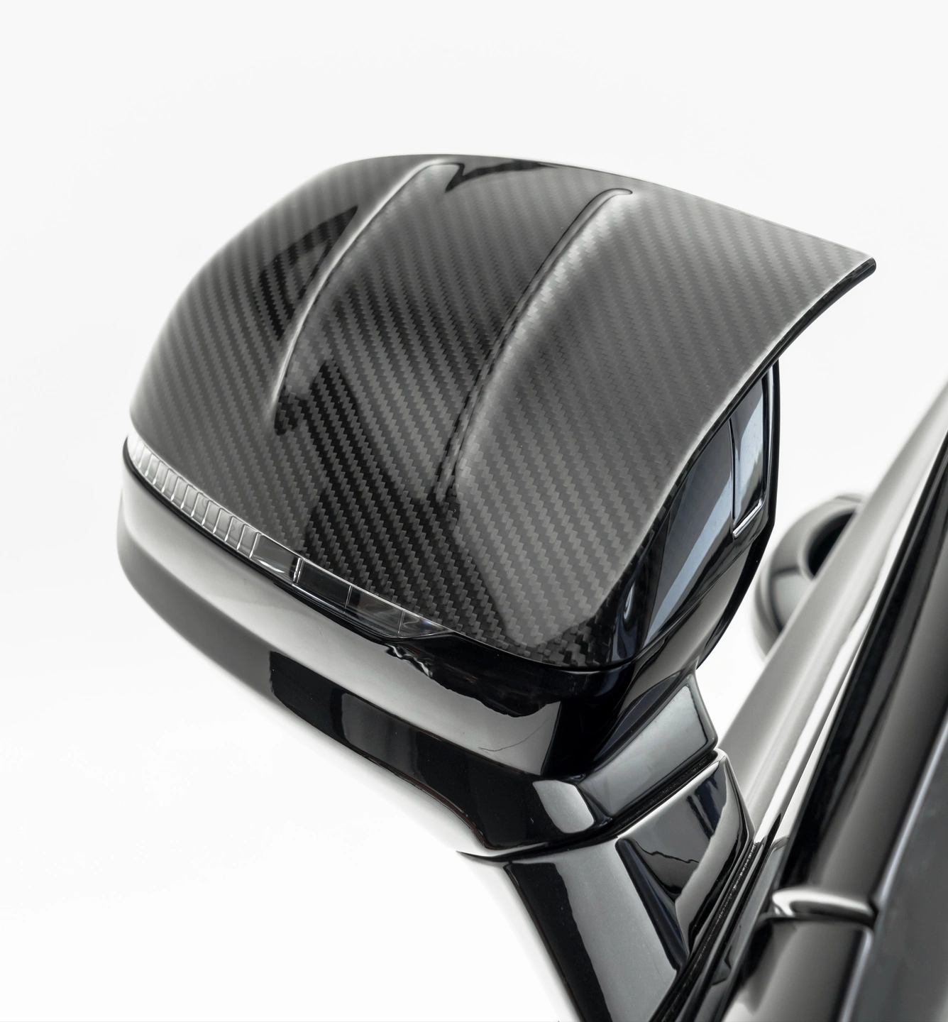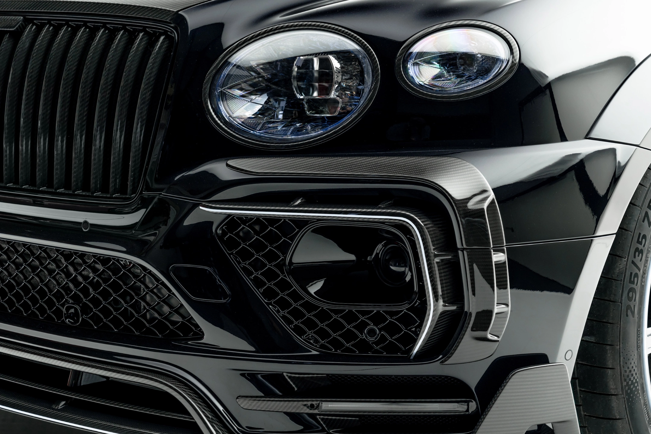 The front of the Bentayga is enhanced with an integrated front lip, LED daytime running lights, side flaps and air intakes in visible carbon. Similarly, the entire front grille, including its vertical bars, is finished in „Visible Carbon”. An ultra-light carbon bonnet with four additional air outlets completes the extensive changes to the front section.[Read more]The bonnet was developed specifically for the V12 to ensure the best possible dissipation of engine heat to optimise the heat balance of the engine. On the flanks, distinctive MANSORY extensions provide impressive wide-body styling and a new, holistic approach to design. These changes also make the Bentayga look more powerful, lower and more elongated. To reduce lift forces at the rear axle, MANSORY engineers developed a shapely spoiler for mounting on the tailgate as well as a roof spoiler developed especially for the Speed and significantly enlarged compared to the V8. Also exclusive to the Speed, the carbon programme has been extended to include a trim for the C-pillar. The rear apron with diffuser and the two twin-tailpipes of the sports exhaust system skilfully set the scene at the rear. Numerous components such as trim strips, mirror housings, the roof rails and air intake trims made of visible carbon complete the wide-body body programme for the "Bentayga Speed W12 by MANSORY".