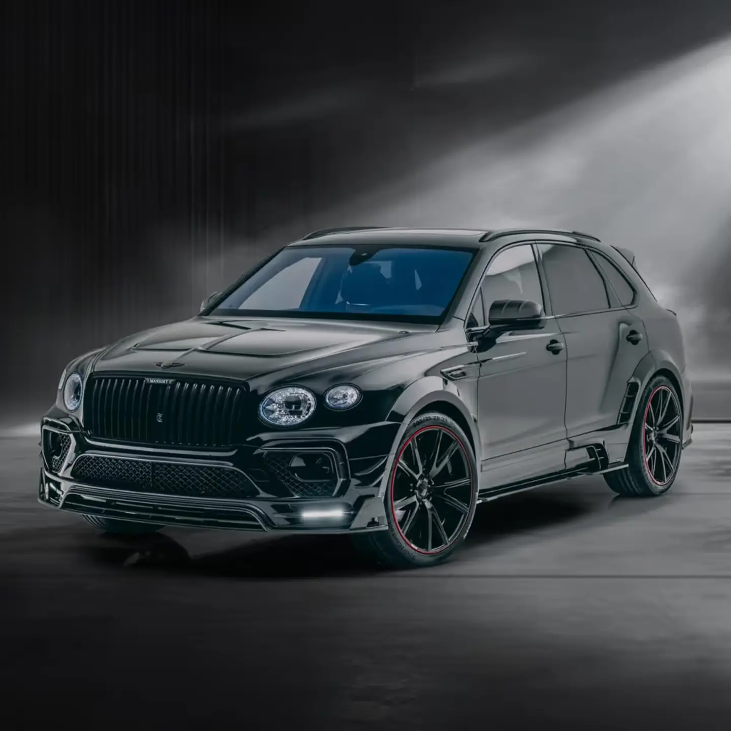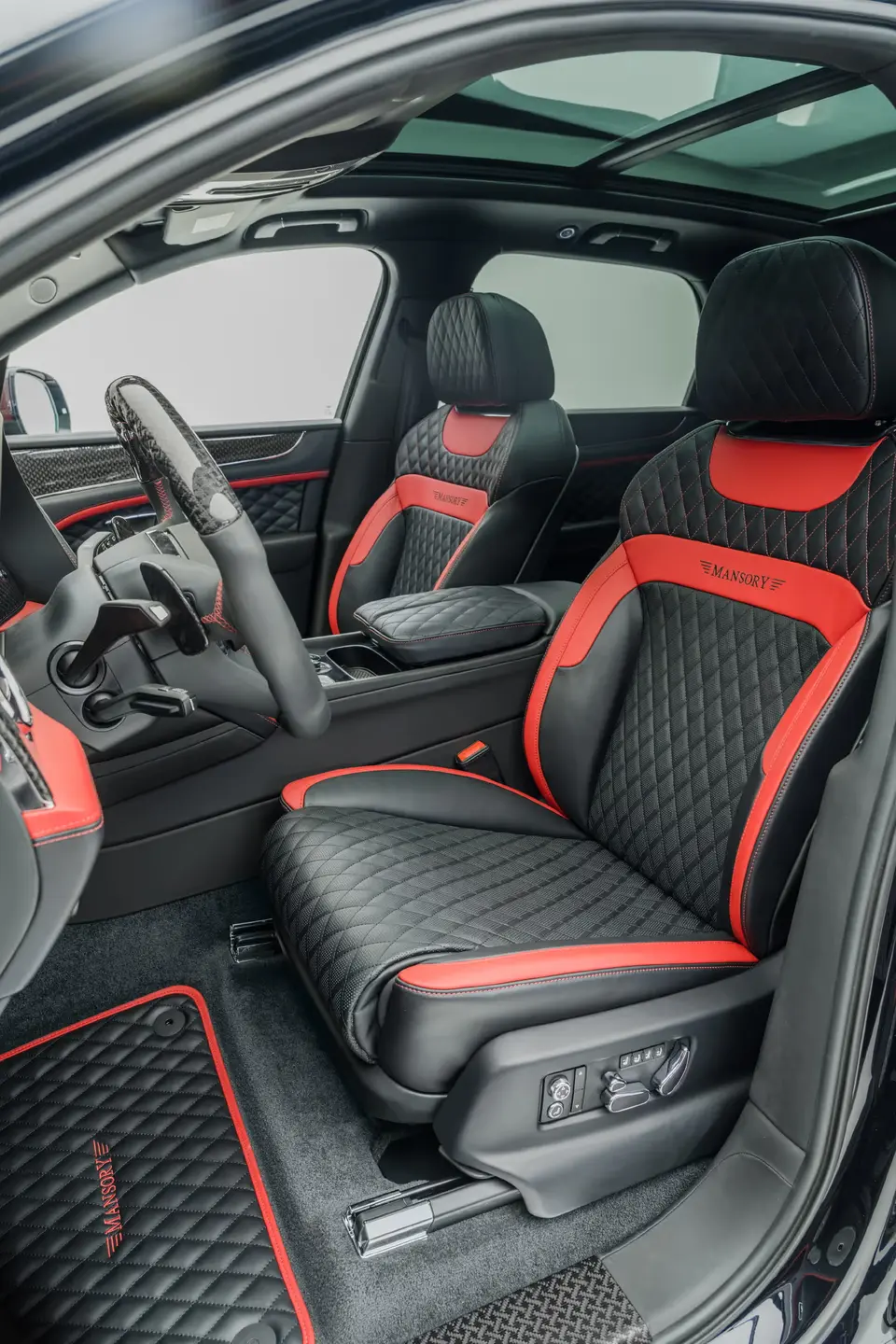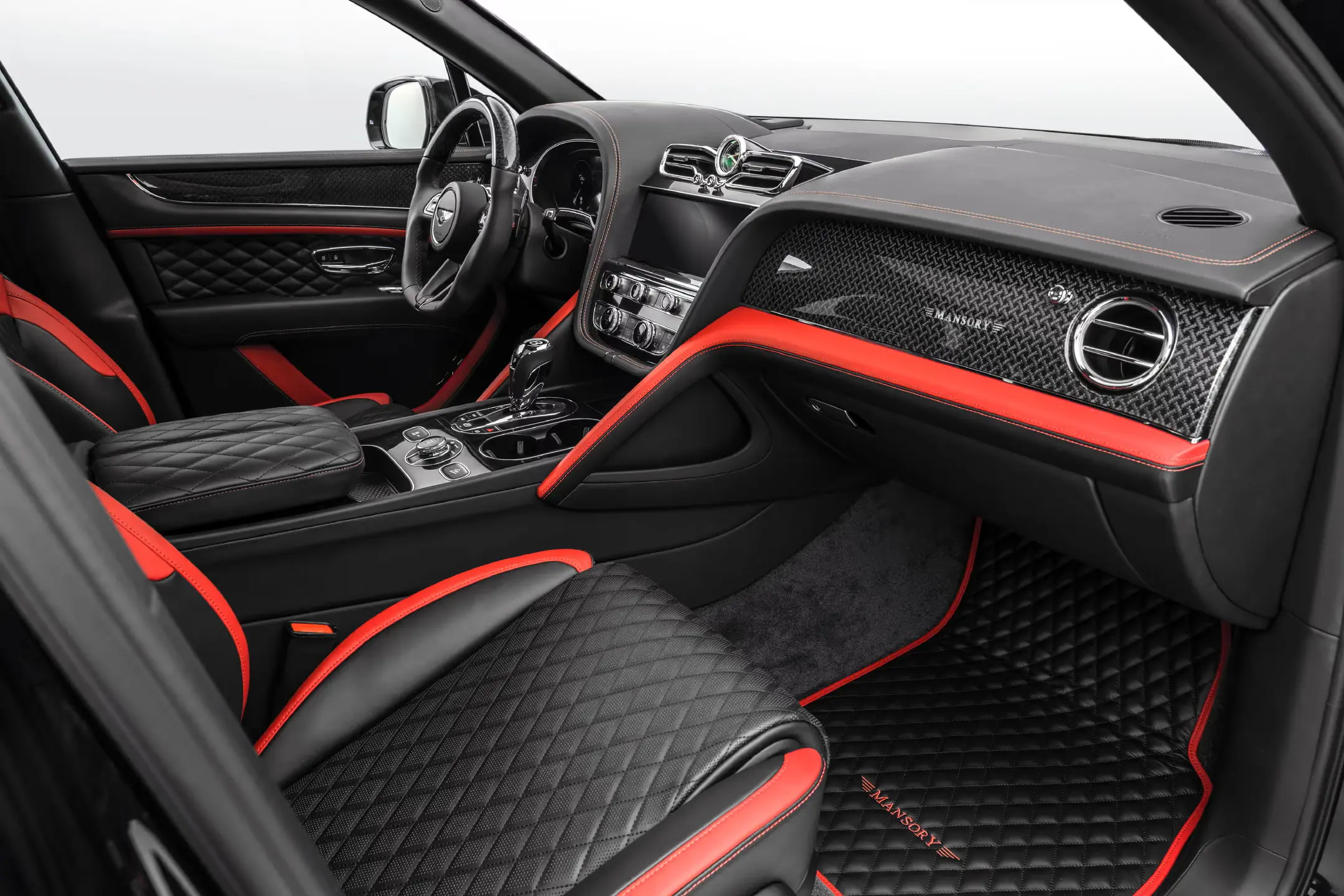 In the style of the traditional British brand Bentley, which attaches great importance to comfort, luxury and sportiness in the interior, the MANSORY upholstery shop offers the finest applications in the interior. In addition to the Bentayga's already opulent all-leather interior, a new leather-carbon sports steering wheel, dark carbon inlays and red leather inserts in the seats and dashboard are sure to please the eye. Floor mats stitched to match the style of the seats, with red leather edging to match the colour scheme, complete the interior refinements and will satisfy even the most discerning Bentley owner.