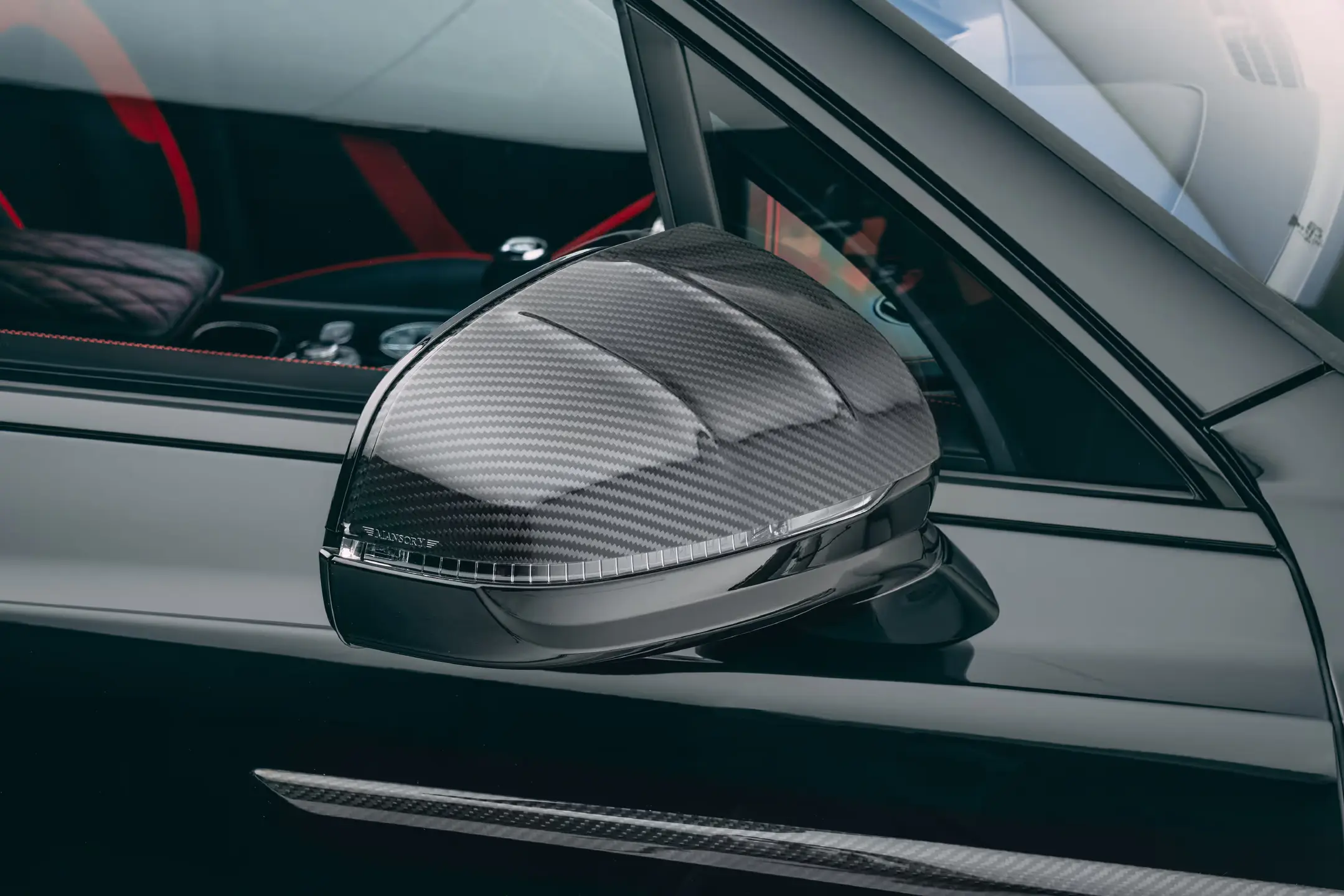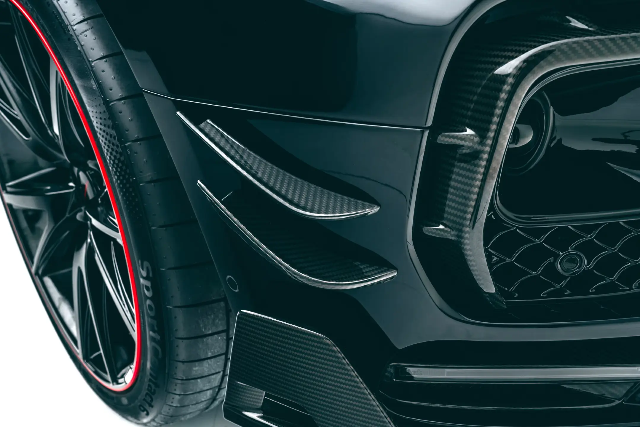 In its customary manner, MANSORY also refines almost all body components in the complete conversion of the latest Bentayga. And as always, all these changes are realised with carbon material - connoisseurs of the MANSORY brand have known about this fact for years and appreciate it very much. All carbon components are manufactured in the company's own autoclaves and realised in impressive manufacturing quality, as only MANSORY engineers and designers can do thanks to their many years of experience at this high level. [Read more] The front of the Bentayga is enhanced with an integrated front lip, side flaps and air intakes in carbon fibre. Similarly, the entire front grille, including its vertical bars, is finished in carbon. An ultra-light carbon bonnet with additional air outlets and LED daytime running lights complete the extensive changes to the front. On the flanks, the MANSORY Bentayga provides an impressive wide-body styling and a new, holistic approach to design. These changes also give the Bentayga a more powerful, lower and more elongated appearance. To reduce lift forces at the rear axle, MANSORY engineers developed a shapely spoiler for mounting on the tailgate and a matching two-piece roof spoiler.