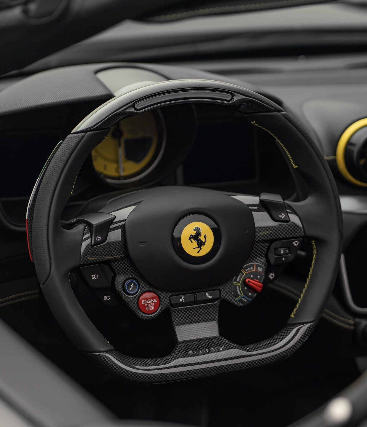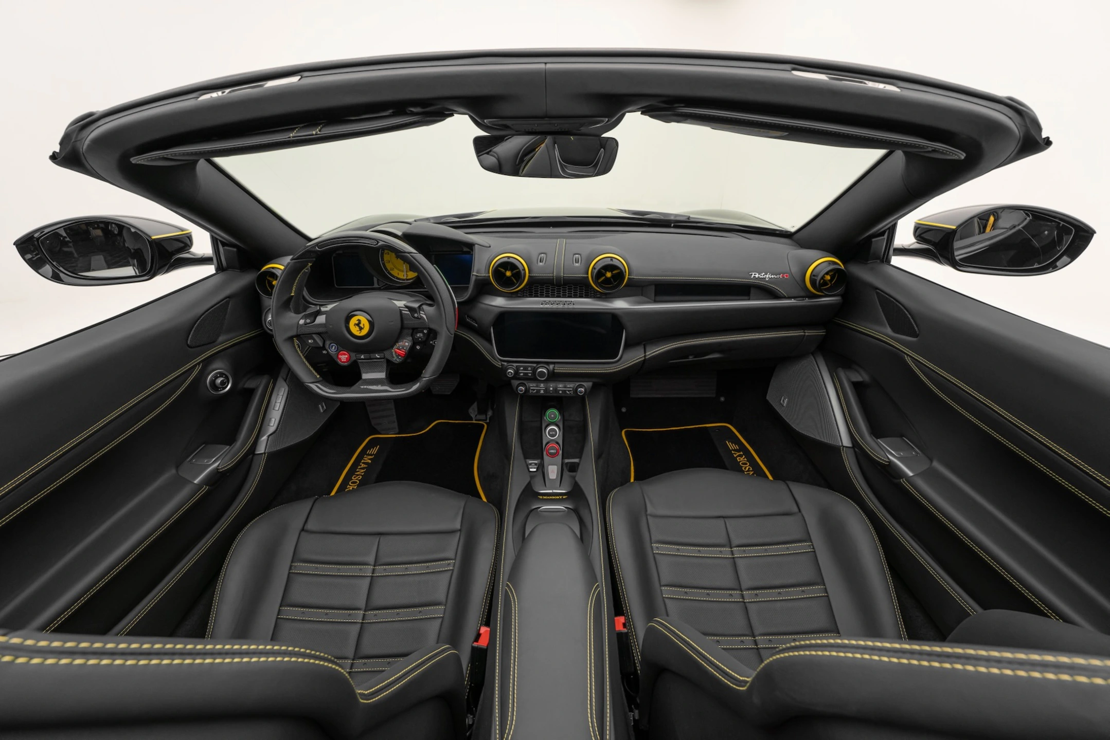 The entire interior is completely done with the finest smooth leather. Always corresponding to the exterior paintwork - being at the same time elegantly and tastefully accentuating the leather - all seams and almost all the interior control buttons are finished in yellow. Only the three buttons on the control unit of the dual-clutch gearbox are given their own colours: Green, white and red - the colours of the Italian Republic and the national flag of Italy. Once again, the interior specialists at MANSORY have succeeded in perfectly combining a sporty atmosphere with high functionality, comfort and design. A MANSORY sports leather steering wheel and the safety belts also flatter the eye and are decorated with the MANSORY logo. MANSORY floor mats edged in yellow and several other, precisely embroidered MANSORY logos elegantly round off the fully comprehensive refinement in the interior.