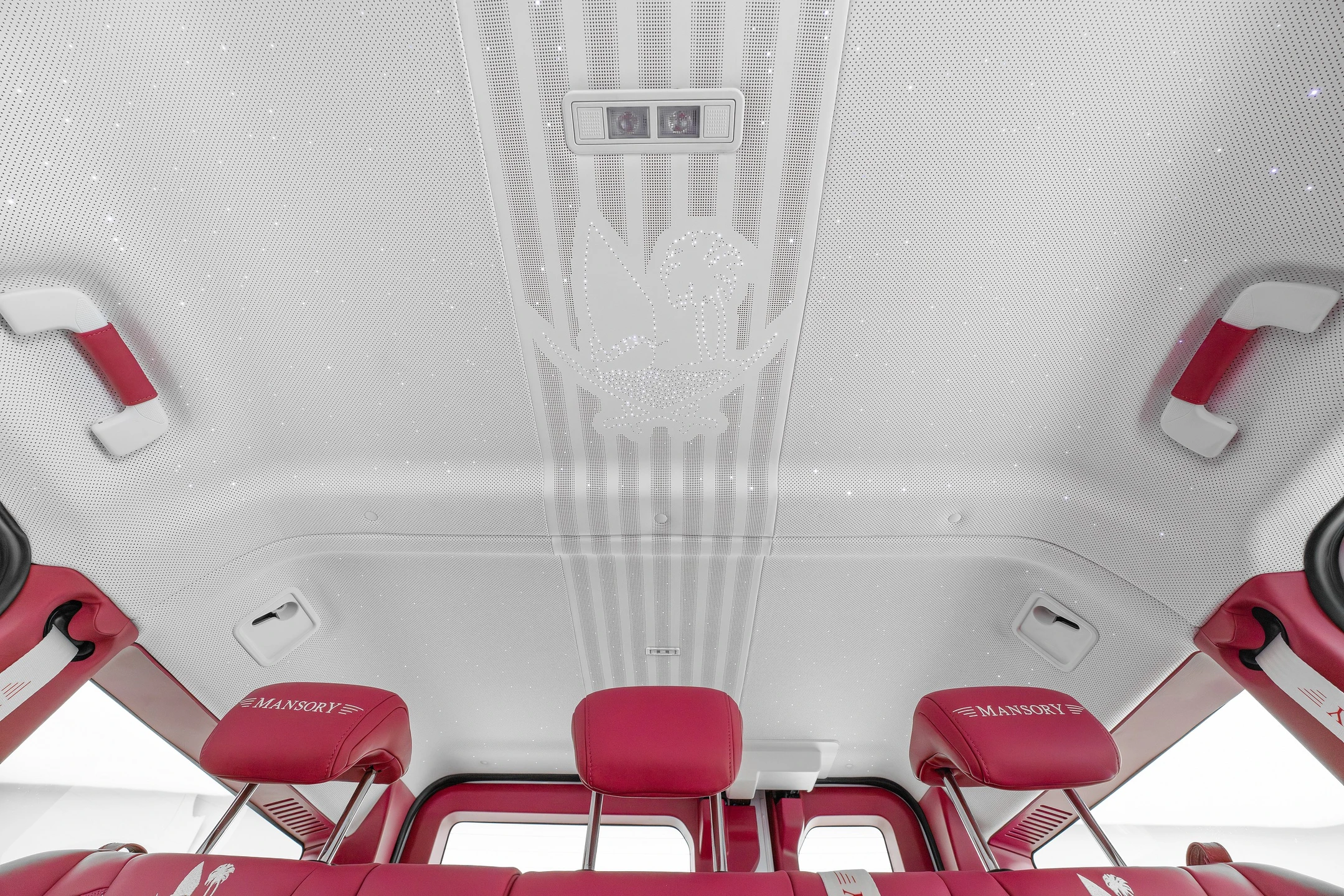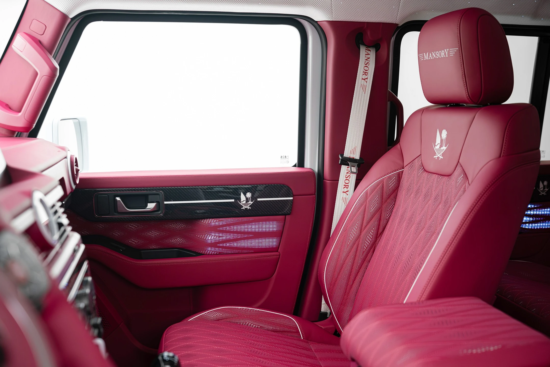 Full leather/Satin interior in arctic white and “Maroon”; Illuminated door panel; fully electric seats with ventilation in the front; refrigerator in the front center console; rear seats with MANSORY Individual center console (refrigerator, inductive charging cradle), ventilation and modified inclination of the seat for better seating comfort; MANSORY sports steering wheel; MANSORY carbon interior (T200) with individual paintwork “Katar”; MANSORY carbon sport pedals; illuminated MANSORY logo in the dashboard; MANSORY start/stop ignition in the roof liner; illuminated entrance panels