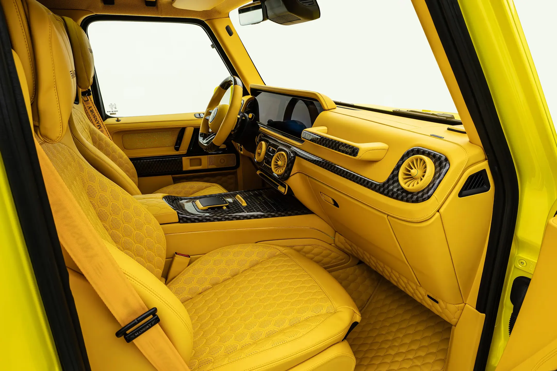 As with all MANSORY complete conversions, the interior can basically be freely selected in terms of colour, quilting and carbon design. [Read more] Many lovingly and in the highest quality craftsmanship executed details - such as the seat belts with embroidered MANSORY logo, MANSORY sport pedals in carbon, a MANSORY leather sports steering wheel, elaborately quilted MANSORY leather floor mats, MANSORY lettering in the grab handles, and countless other detail solutions make the “MANSORY Gronos MY25" a very special vehicle, which is able to implement the customer's wishes in every respect in a masterful way, even in the interior. A start/stop button relocated into the headliner between the sun visors and several hundred illuminated LEDs in the headliner and in the door panels representing a starry sky complete the changes in the interior of the " Gronos" and offer a unique ambience for the highest demands.