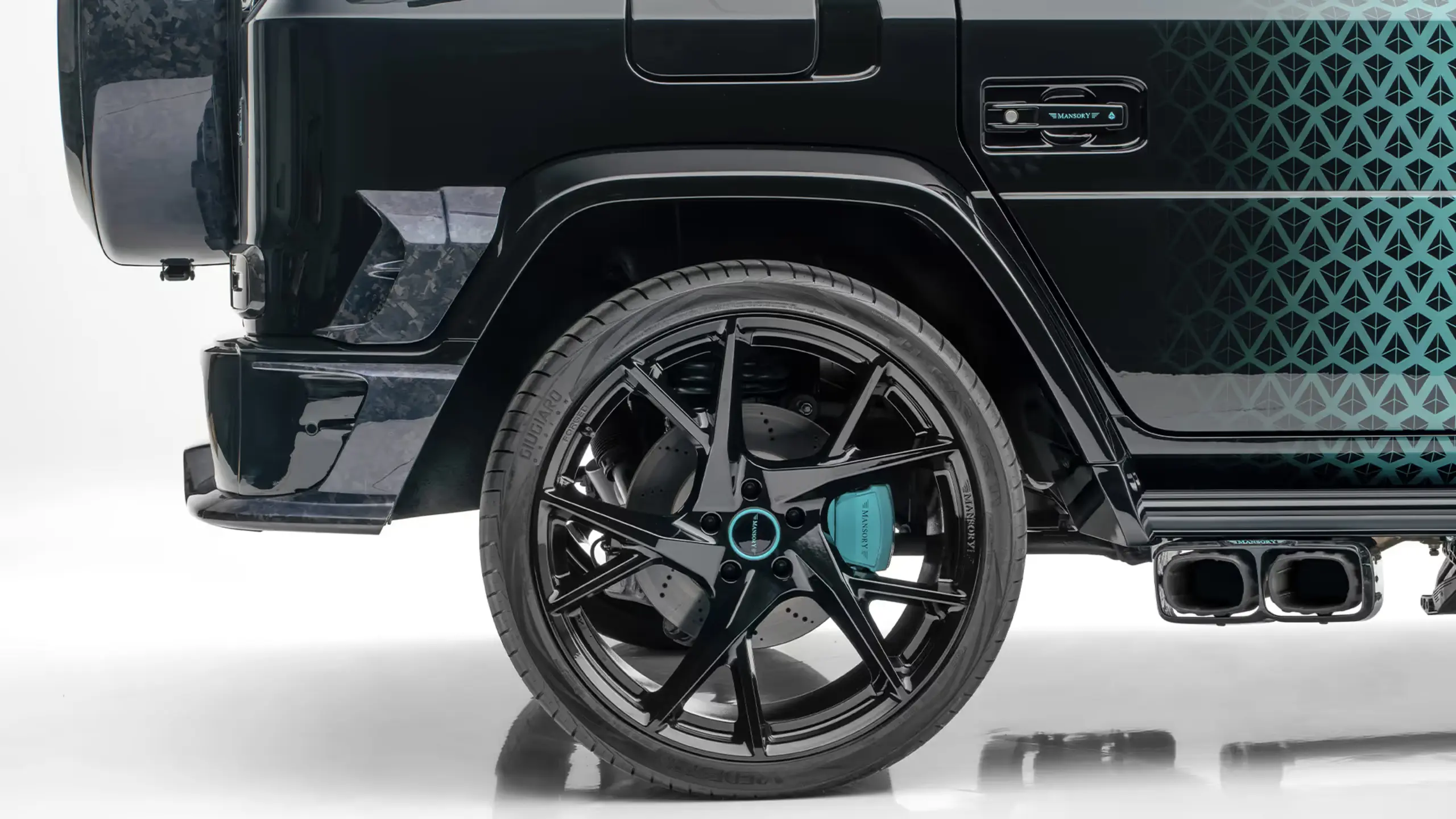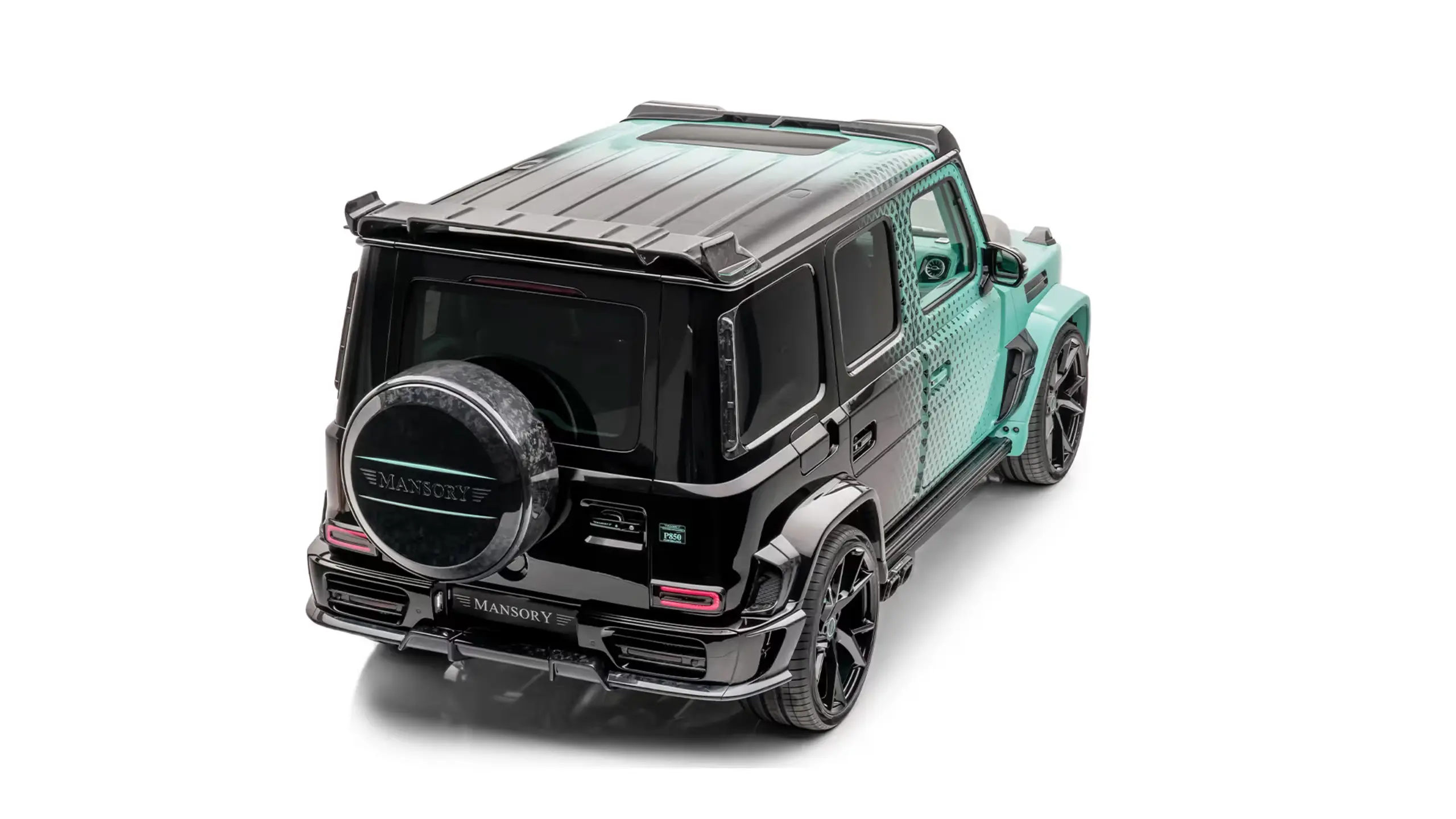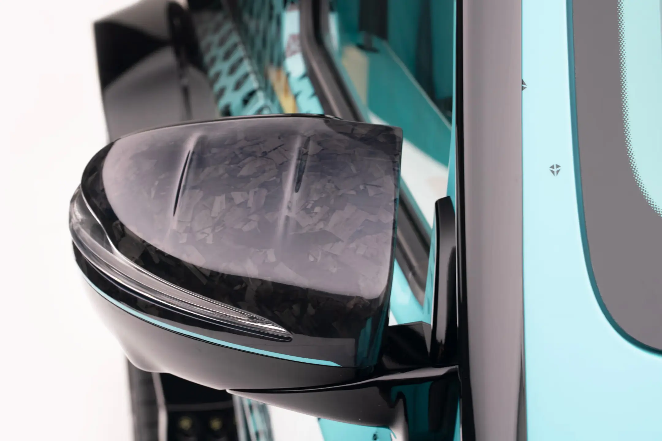The body styling of the G-Class, painted entirely in a special paint finish called "Algorithmic Fade", is impressive both visually and technically. Starting at the front in the colour "turquoise", the colour transition to the colour black is created by black-painted symbols according to the customer's specifications ("Bespoke"), which become increasingly dense in spacing, size and number. [Read more] All aerodynamic add-on parts, starting with the front apron, the elegantly widened front wings, the widening of the door undersides and the rear apron have also been redrawn according to the customer's wishes ("Bespoke"). All these components are of course made of full carbon in "Forged Carbon" finish and all other bodywork applications have also been executed in "Forged Carbon". The ultra-light full carbon bonnet in partial unpainted and partial painted from "turquoise" to "black" and impressively characterises the front section. At the rear, the spare wheel is completely covered in "Forged Carbon" and provides together with the newly designed rear apron and a new ("Bespoke") roof edge spoiler a harmonious finish all in black. Numerous other components made of "Forged Carbon", such as indicator bases, mirror housings, air intakes and outlets, together with other striking highlights such as the door handle inlays with "MANSORY" lettering and the special "Algorithmic Fade" paint finish already described, form an extremely stylish combination.
