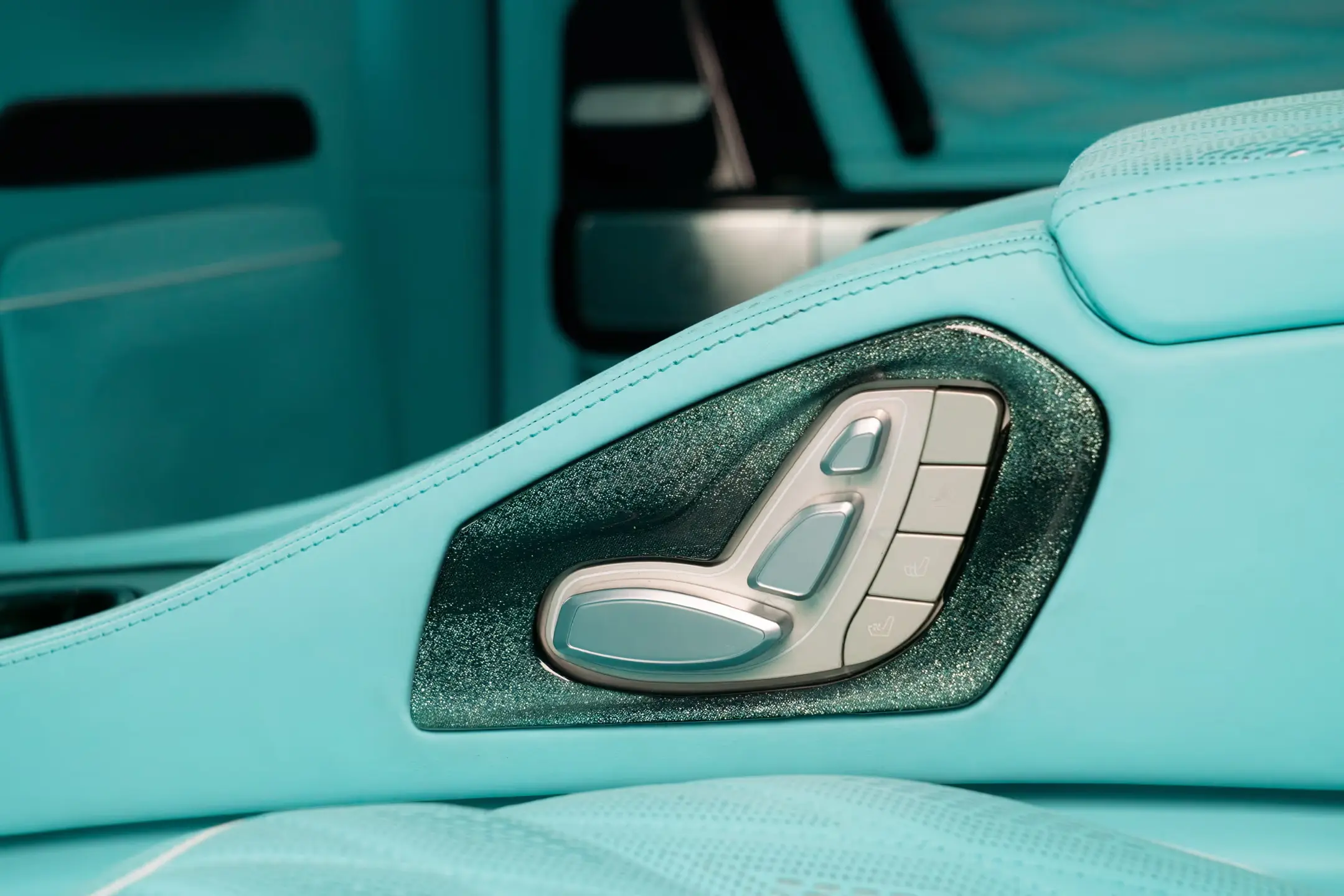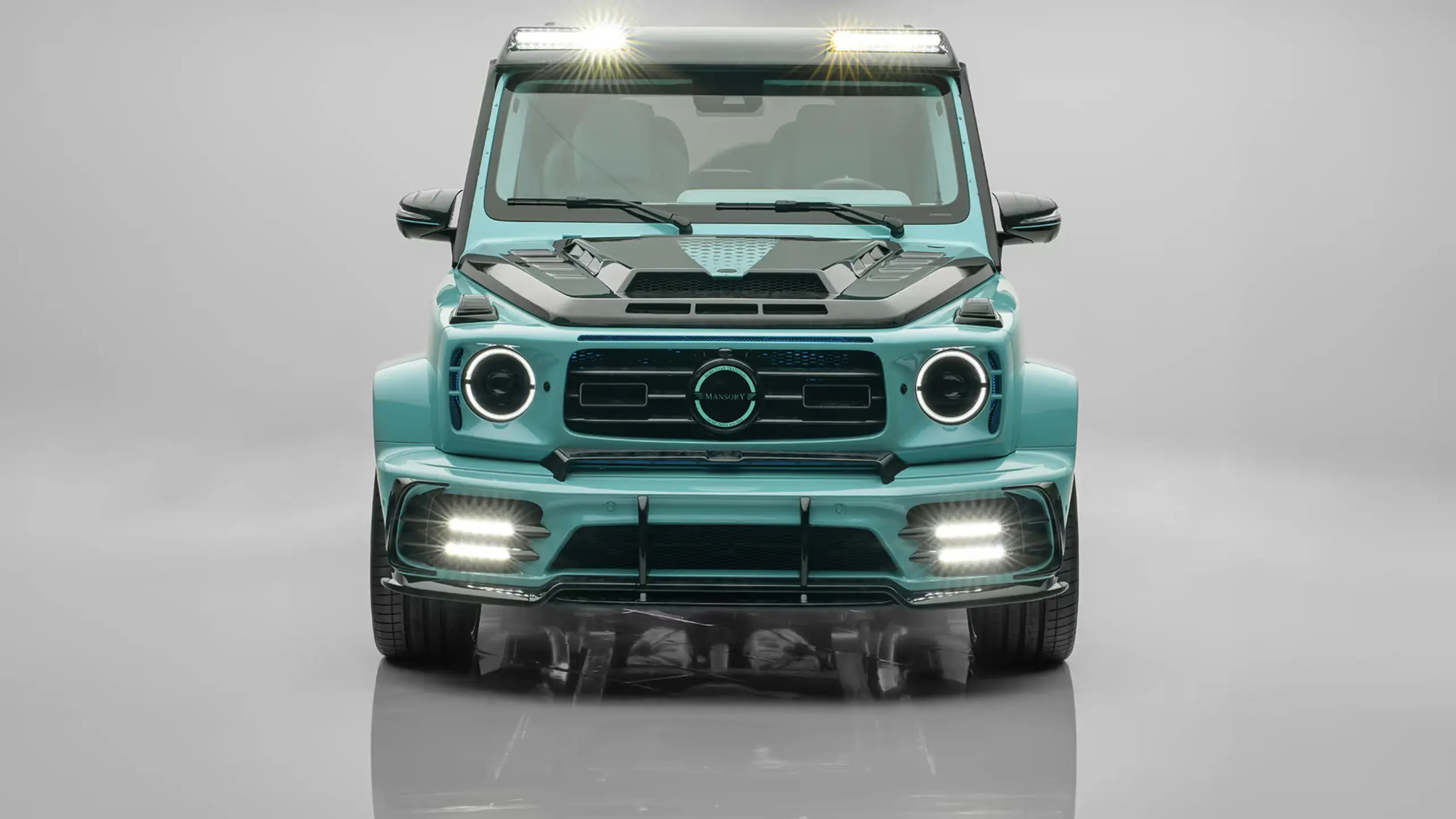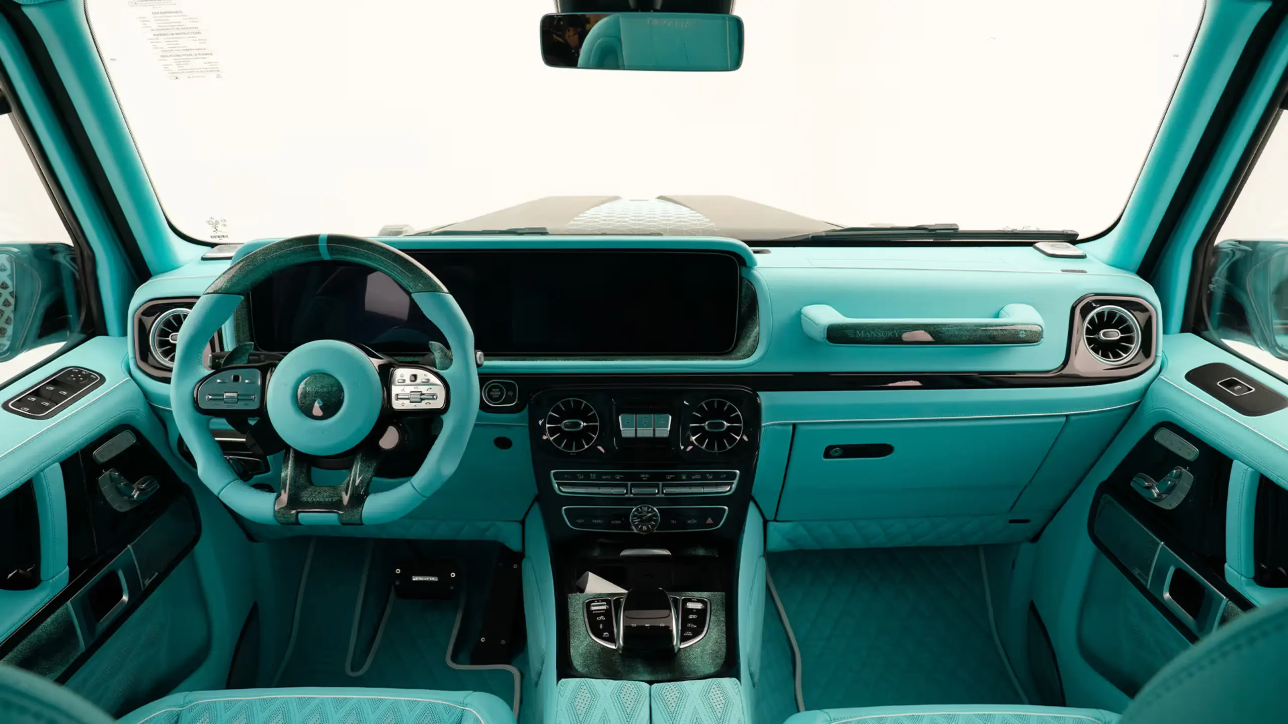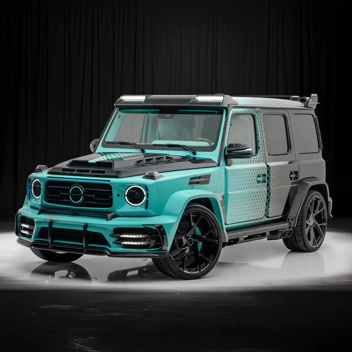 The body styling of the G-Class, painted entirely in a special paint finish called "Algorithmic Fade", is impressive both visually and technically. Starting at the front in the colour "turquoise", the colour transition to the colour black is created by black-painted symbols according to the customer's specifications ("Bespoke"), which become increasingly dense in spacing, size and number. [Read more] All aerodynamic add-on parts, starting with the front apron, the elegantly widened front wings, the widening of the door undersides and the rear apron have also been redrawn according to the customer's wishes ("Bespoke"). All these components are of course made of full carbon in "Forged Carbon" finish and all other bodywork applications have also been executed in "Forged Carbon". The ultra-light full carbon bonnet in partial unpainted and partial painted from "turquoise" to "black" and impressively characterises the front section. At the rear, the spare wheel is completely covered in "Forged Carbon" and provides together with the newly designed rear apron and a new ("Bespoke") roof edge spoiler a harmonious finish all in black. Numerous other components made of "Forged Carbon", such as indicator bases, mirror housings, air intakes and outlets, together with other striking highlights such as the door handle inlays with "MANSORY" lettering and the special "Algorithmic Fade" paint finish already described, form an extremely stylish combination.