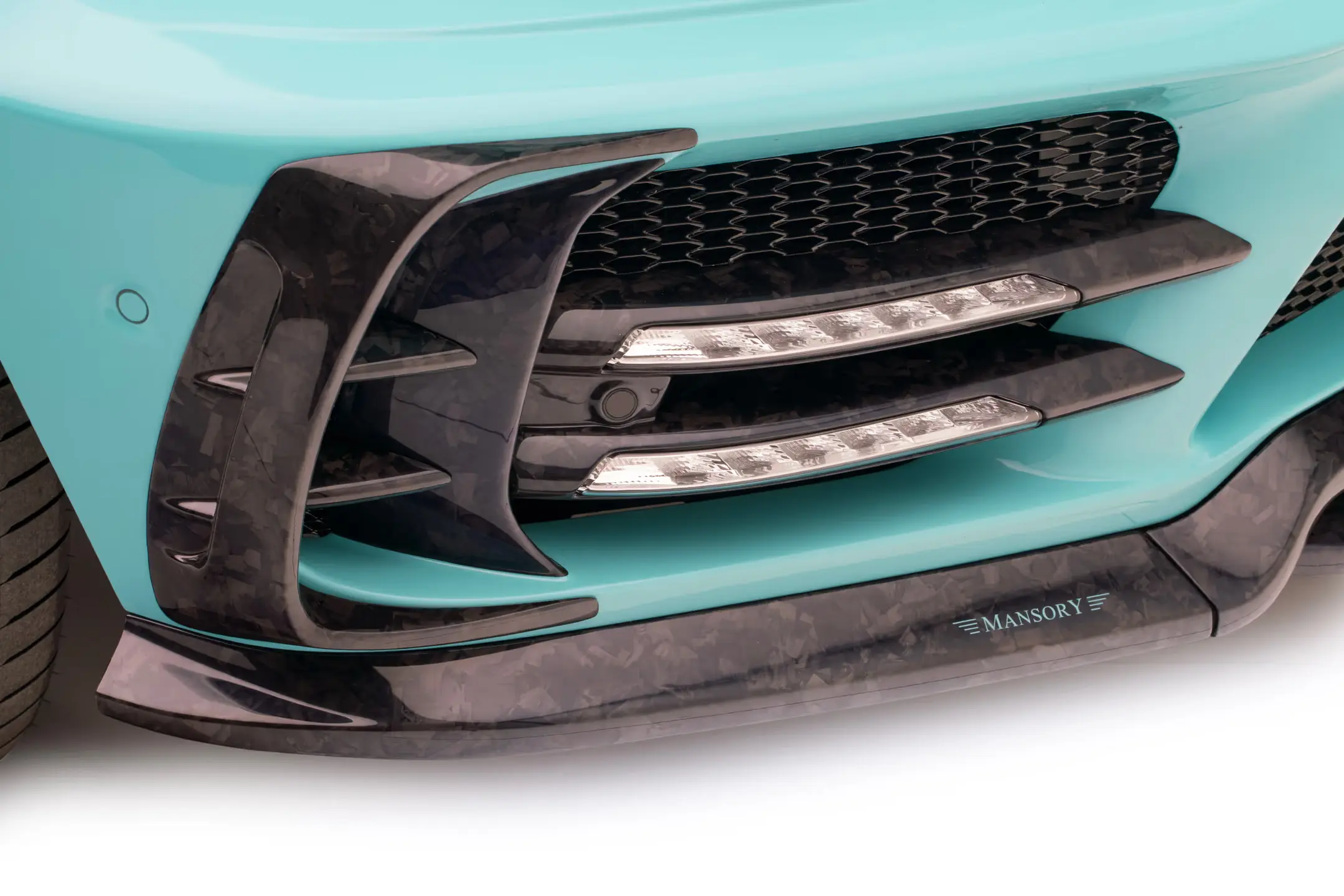 The exclusive exterior, which has been modified in numerous details according to the customer's wishes, is of course matched in no way by the highly individualised interior design. Only the finest materials are used in the interior, which is completely reupholstered in s special leather colour which is called "Feroza". A new leather-carbon sports steering wheel, a sports pedal set in aluminium, carbon inlays painted in "turquoise" and leather inserts with 3D embossing and hole patterns according to the customer's wishes ("Bespoke") for the seats, the door inserts and the centre armrest are just as pleasing to the eye as the precisely worked embroidery of the MANSORY logo in the seats, on the seat belts and in the floor mats. All the carpets in the interior are also in the "Feroza" colour.