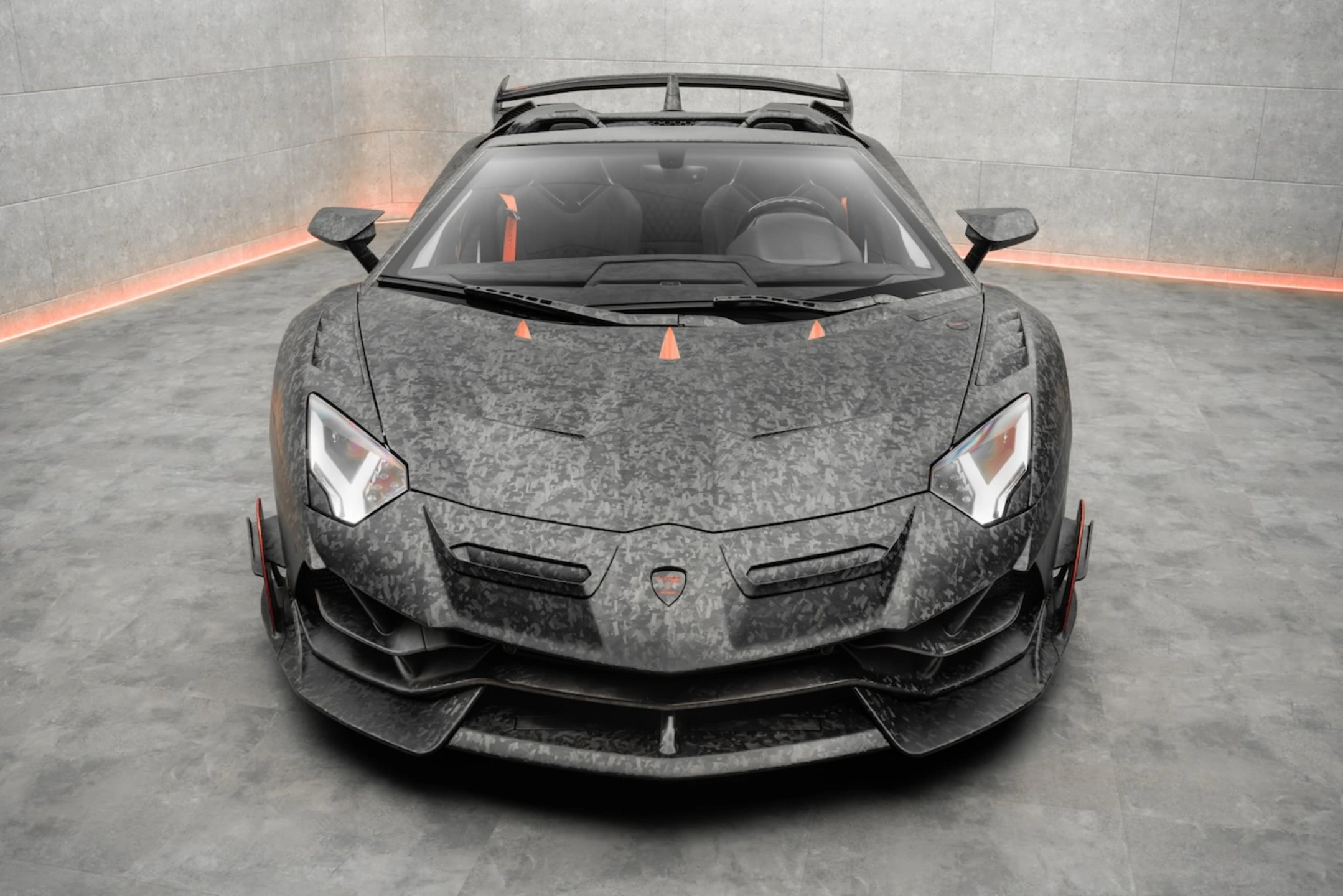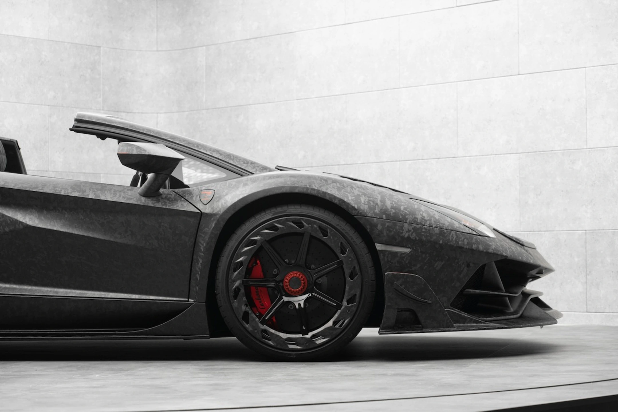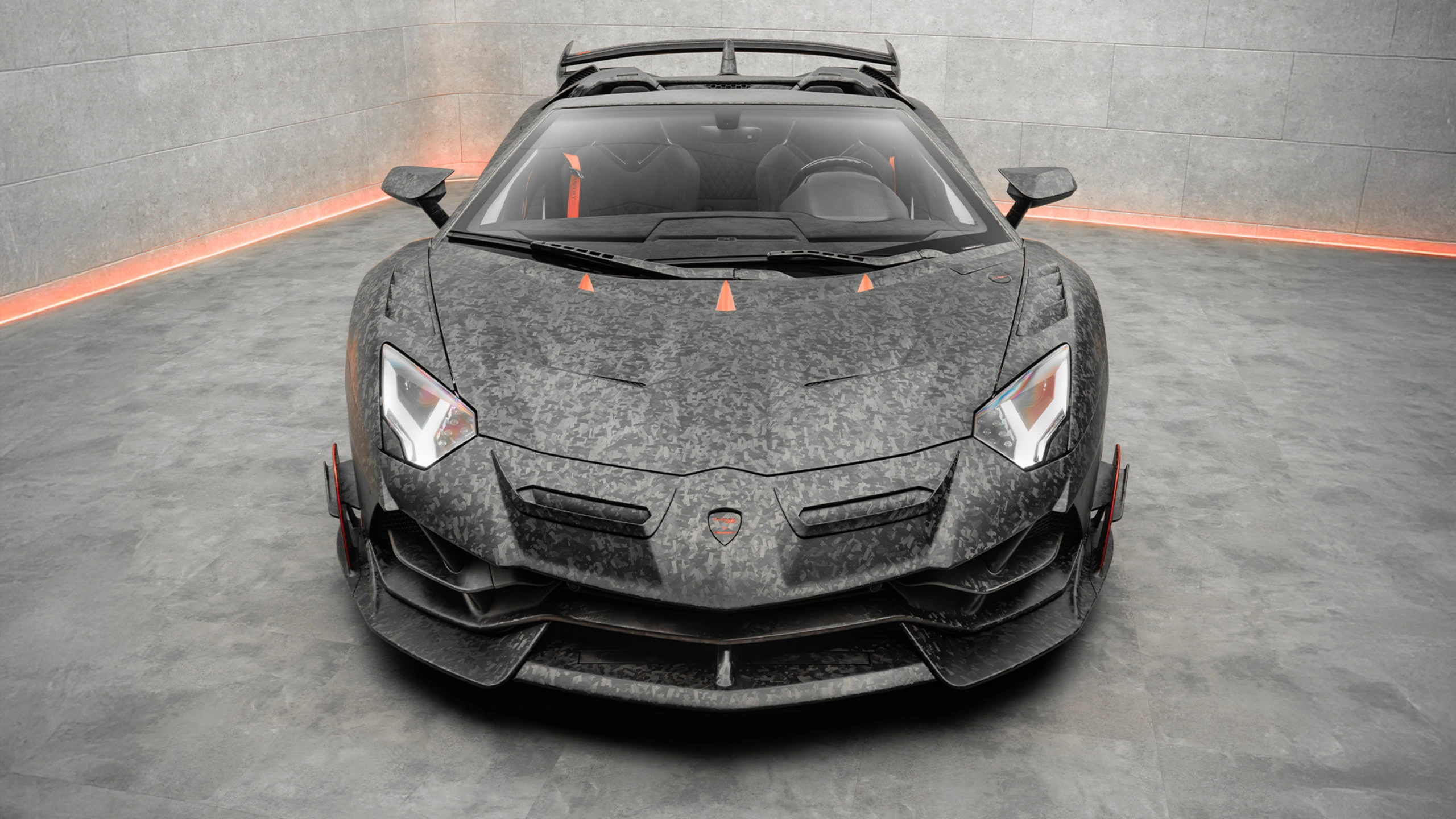 MANSORY Carbonado EVO, with a black exposed forged carbon fiber look based on the Lamborghini Aventador SVJ Roadster.