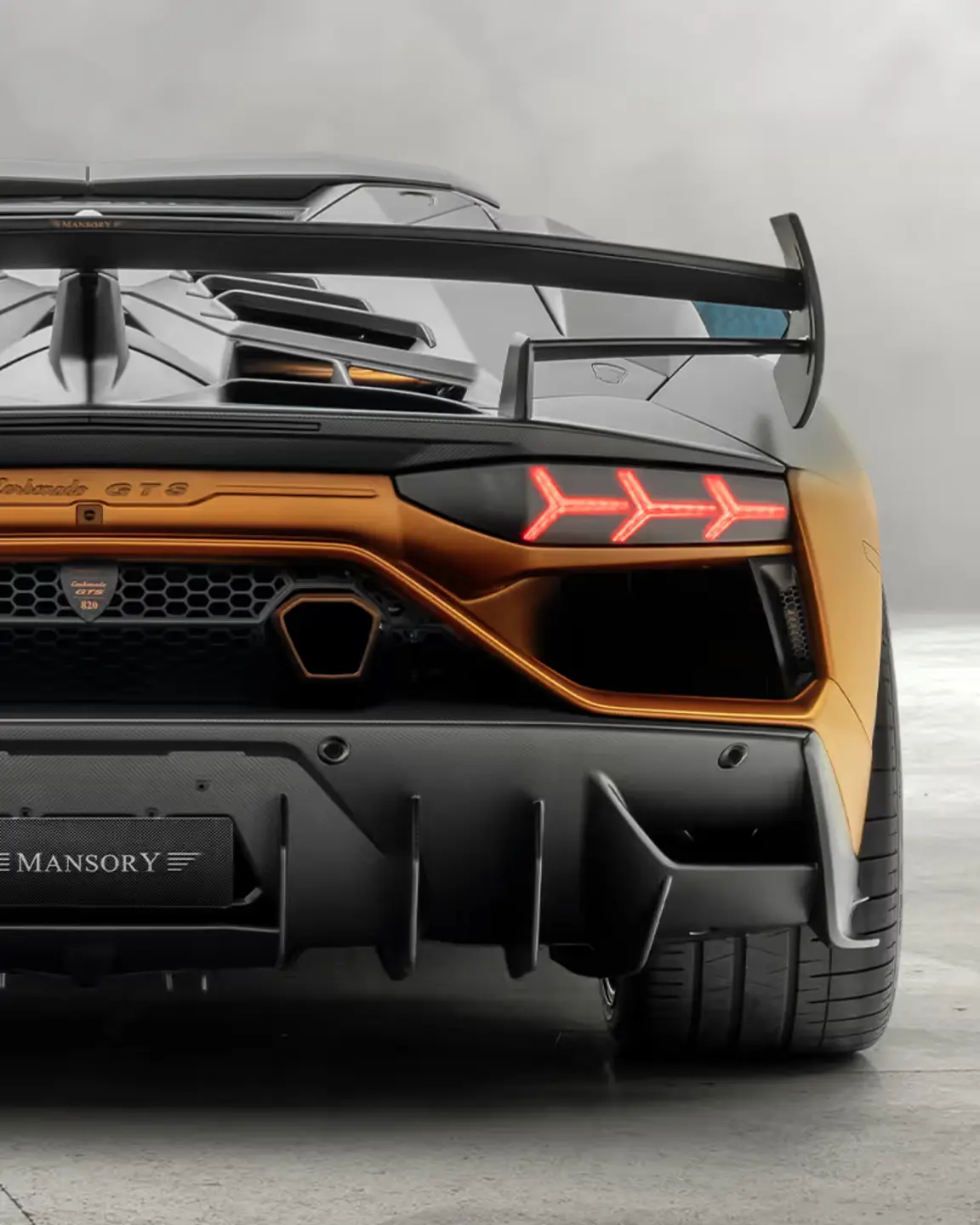 The completely redesigned carbon body alone is reminiscent of a fighting bull in attack posture. Even the allusion to the shape of stealth aircraft gives the "MANSORY Carbonado GTS" a thoroughly desirable, attack-minded look. In addition to the looks, however, the technology also undergoes numerous improvements. Complete vehicle conversion as "One of One" [Read more] Base vehicle: Lamborghini Aventador SVJ Roadster Full carbon body Vertically changing two-tone special paint finish "Cupreus" in copper/black Power increase to 820 hp and 780 Nm Performance: Vmax 355 km/h and 0-100 km/h in 2.8s The striking air intakes in the front apron optimize the flow of fresh air into the radiator. Together with the specially developed front lip, this also results in improved downforce for greater overall grip. At the side, striking side skirts and the grown wheel arches show the signature of MANSORY. And here, too, visual pleasure and technical functionality go hand in hand. The new carbon components not only look impressive, they also supply large amounts of fresh air to both the power unit under the new full-carbon engine cover and the rear brake system. The newly developed double diffuser is responsible for a perfect of the airflow underneath the vehicle, and the large rear spoiler in cooperation with the rear apron, which also generates additional downforce, is responsible for downforce on the rear axle.