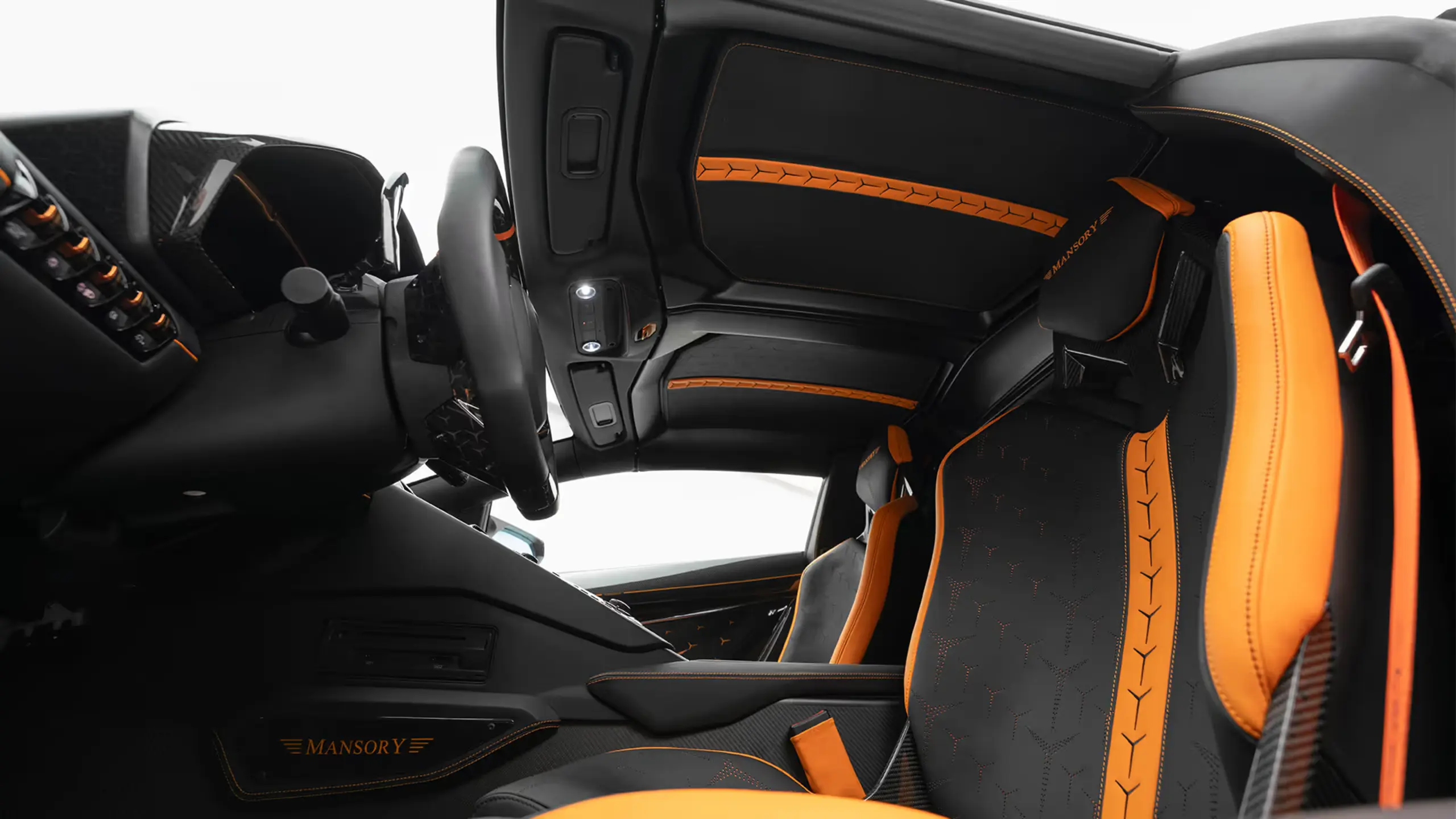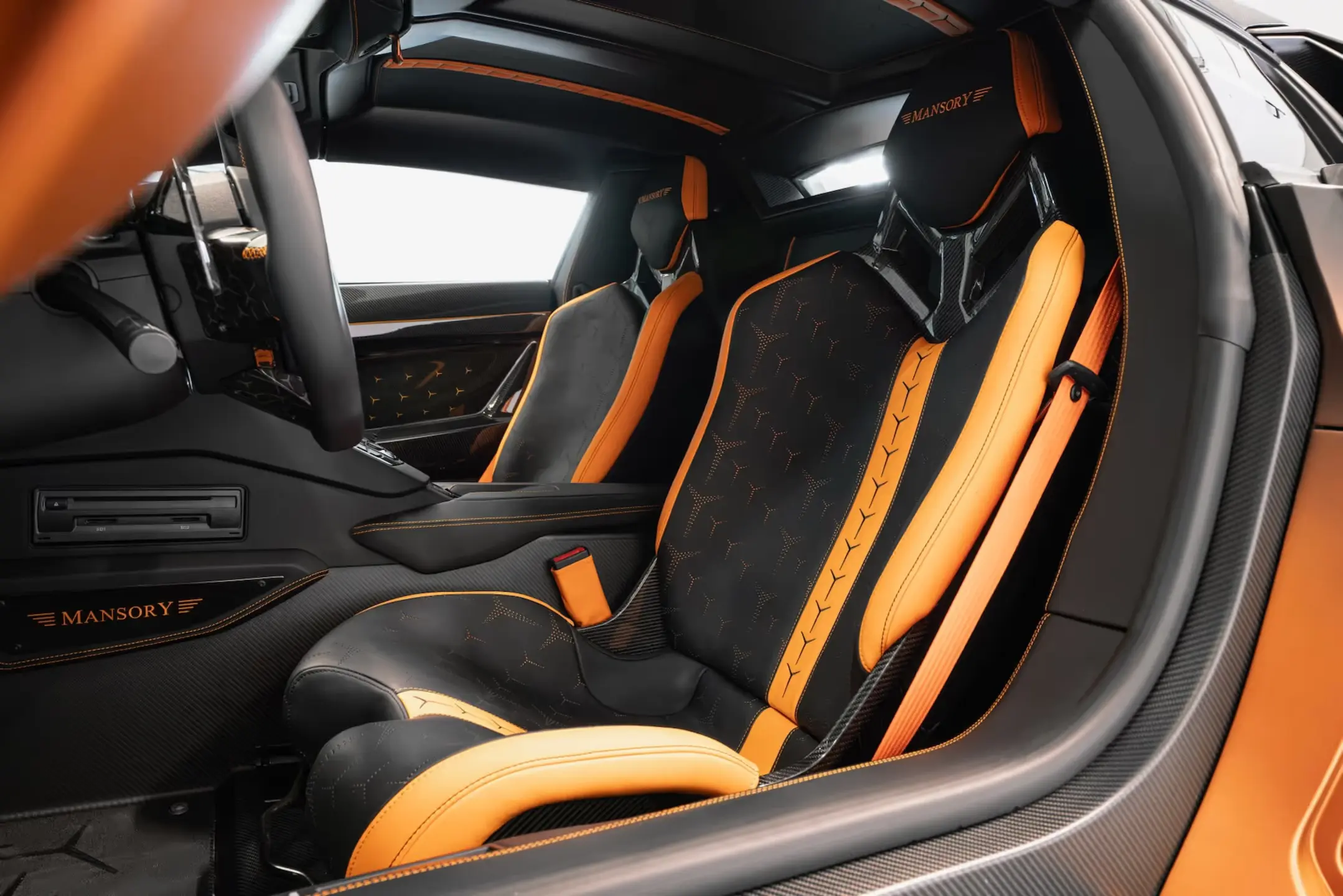 Also in the interior almost no single component remained untouched by the MANSORY specialists. The "Cupreus" colour chosen for the exterior is also used as a colour accent in the interior. The interior, decorated with arrow-shaped decorative stitching and upgraded with "Forged Carbon" applications, captivates in numerous details and gives the "MANSORY Carbonado GTS" a very sporty touch with technical appeal at the very highest level in the interior as well. Specially made MANSORY floor mats, colour-matched seat belts with MANSORY logos and countless other precisely embroidered MANSORY logos elegantly round off the fully comprehensive refinement in the interior.