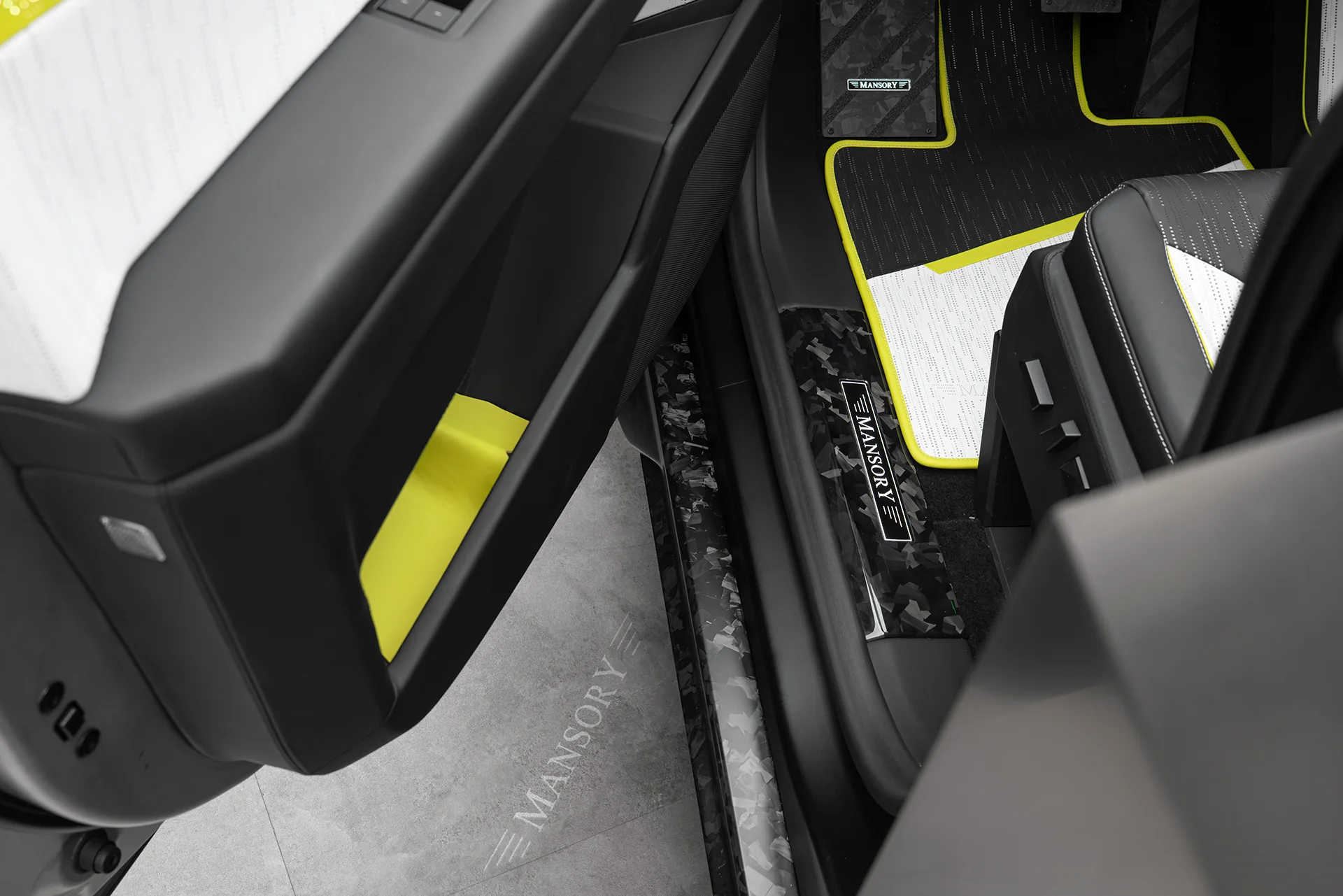 Only the finest materials are used in the interior of the "MANSORY Elongation EVO". For example, full leather upholstery and various carbon parts are used according to the customer's individual wishes. [Read more] High-gloss polished paint surfaces or carbon parts - depending on the customer's wishes - in the cockpit impress in a noble way and complement the quilted seats and leather surfaces in the interior according to the customer's wishes. Precisely crafted embroidery of the MANSORY lettering in the seats and floor mats sets additional accents.