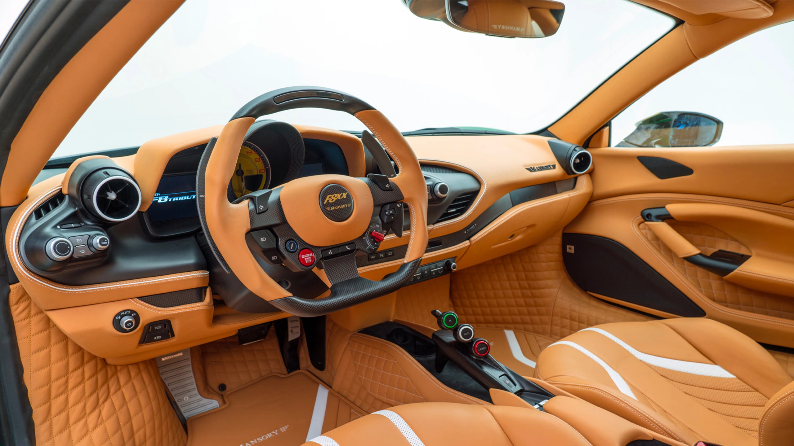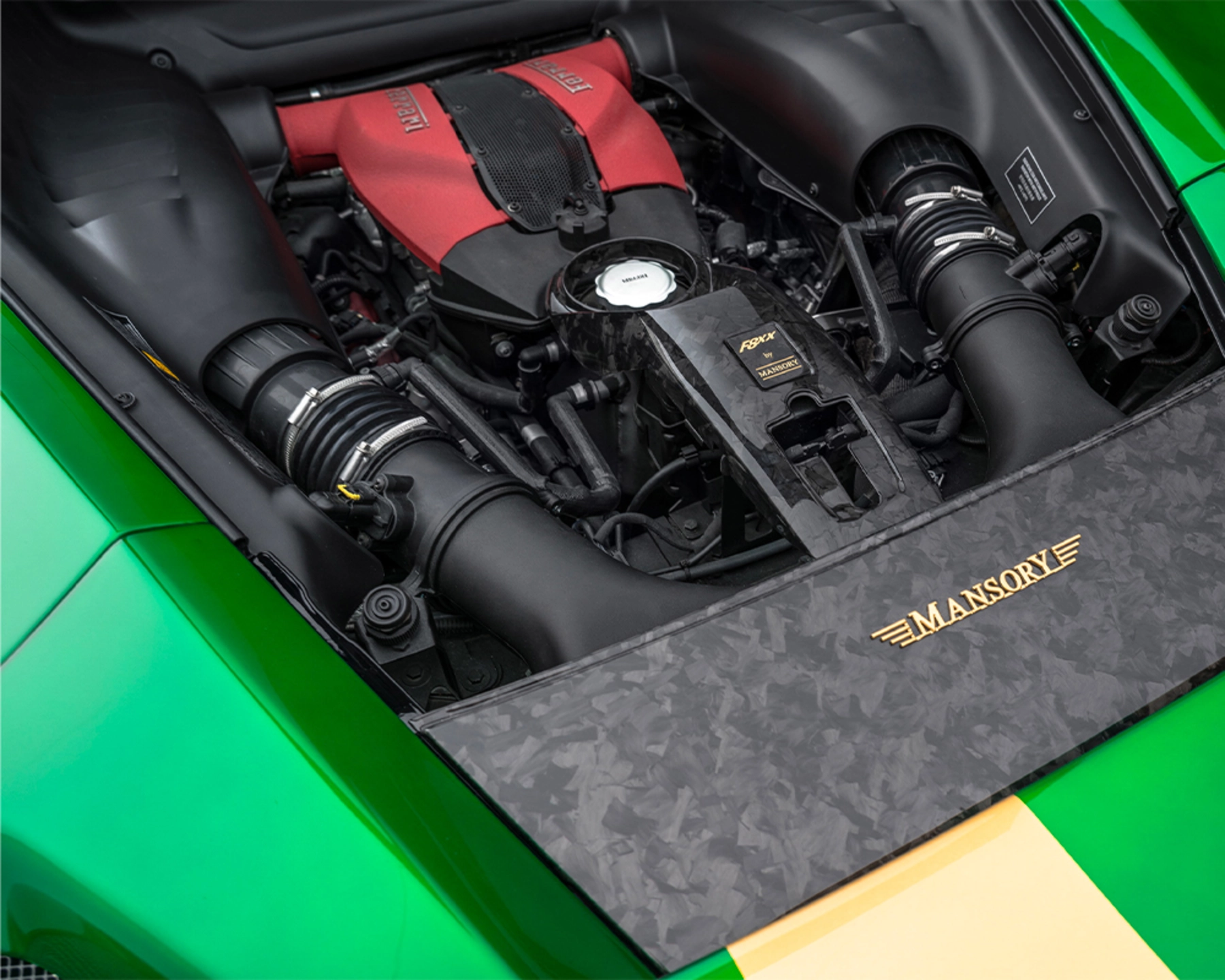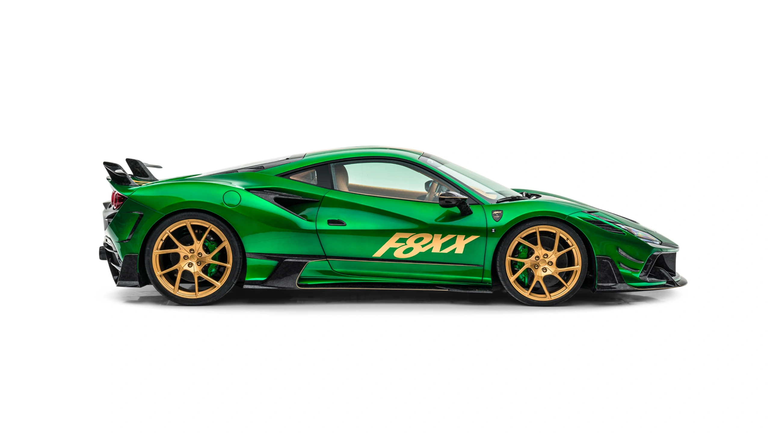 While the special "Catania Green" paintwork may attract the viewer's attention at first glance, the countless details of the "MANSORY F8XX", lovingly and hand-crafted made to the highest standard, succeed in captivating the viewer almost simultaneously, so that the F8XX is able to present itself to the viewer as a harmonious overall work of art. To achieve this, only the finest ingredients of automotive refinement are used in this complete conversion: lightweight body components made of forged carbon, striking forged and gold-coloured sports rims and various interior modifications made of the finest leather.