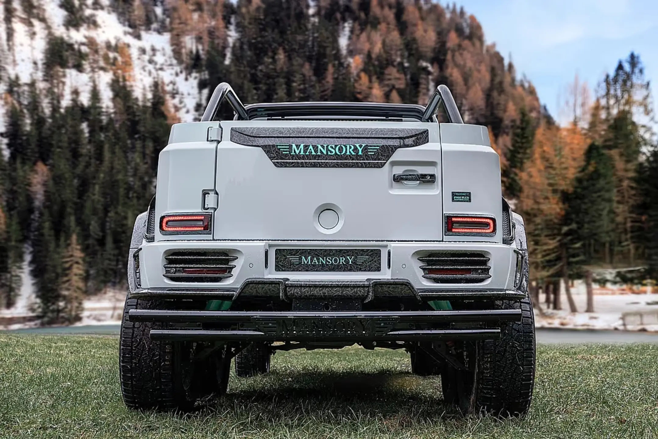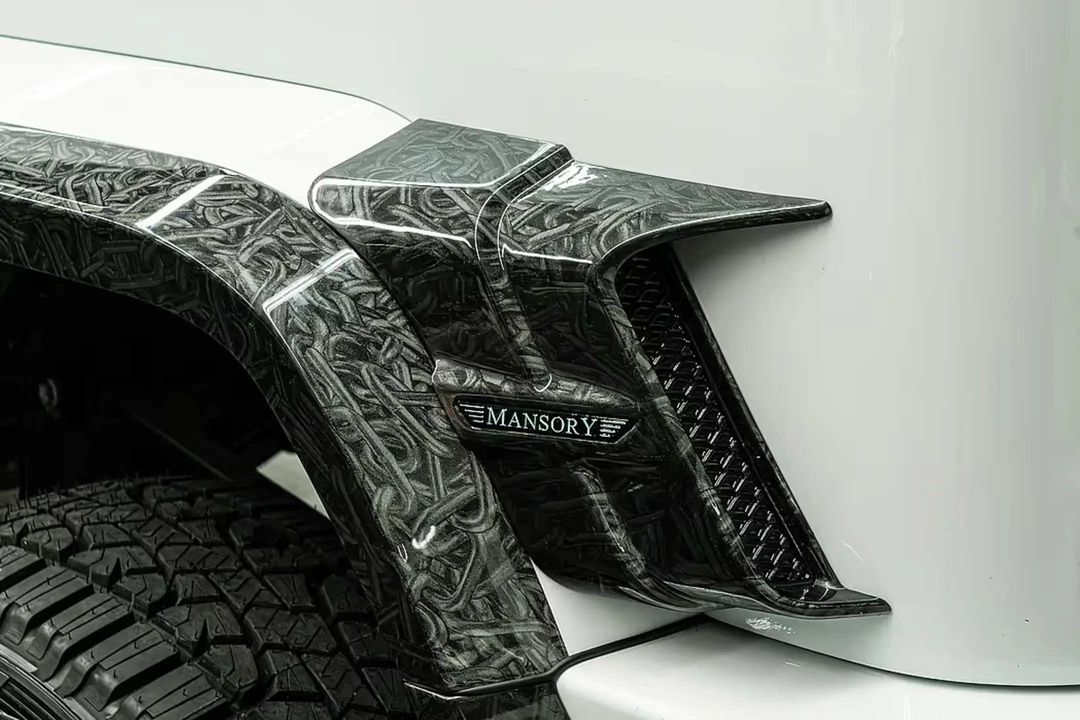 After its complete conversion, the body styling of the “MANSORY Gronos 6x6” impresses both visually and technically. The conversion of a standard Mercedes G63 into a pickup truck with a double cab is carried out while retaining the original design language. Individual carbon parts can be installed on every MANSORY complete conversion, the design of which can be determined by the customer. Since most customers like to use the G-Class with passengers in the rear, rear-hinged rear doors are also installed which makes access to the rear easier and therefore offers the best possible entry comfort.[Read more] Widened step strips and carbon add-on parts from the “Gronos conversion program” installed all around the vehicle complement this complete conversion into a harmonious whole. Impact protection devices mounted in front of the aprons specifically for tough off-road use strictly differentiate the “MANSORY Gronos 6x6” from the other G-Class conversion programs from MANSORY. With the four LED additional headlights mounted on the roof and a cable winch at the front, further special accessories can be used for tough off-road use. In the area of the chassis, the installation of an additional axle (including a newly developed portal gear) with a lockable differential in the longitudinal and transverse directions on the third (additional) axle should also be mentioned. High-performance shock absorbers complement the high technical standard of the “MANSORY Gronos 6x6” and in combination results in a perfect overall package for maximum off-road mobility. It also gains 250mm in height and width.
