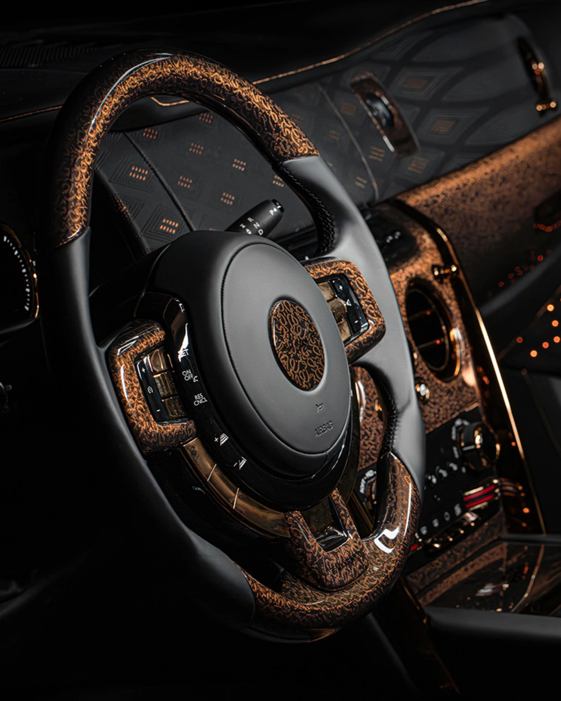 The "LINEA D`ARABO" is very similar to the "LINEA D`ORO" in terms of its colour and design concept. However, while the "LINEA D`ORO" combines the colour black with the colour gold, the "LINEA D`ARABO" uses the colour copper in the same way as the "LINEA D`ORO" uses the colour gold. Another key distinguishing feature is the design of the carbon parts. Instead of the real gold inlays, the "LINEA D`ARABO" - like the "Gronos 6x6" - uses completely customised carbon parts, which show the name "MANSORY" in copper colour and intertwined in the Arabic language.