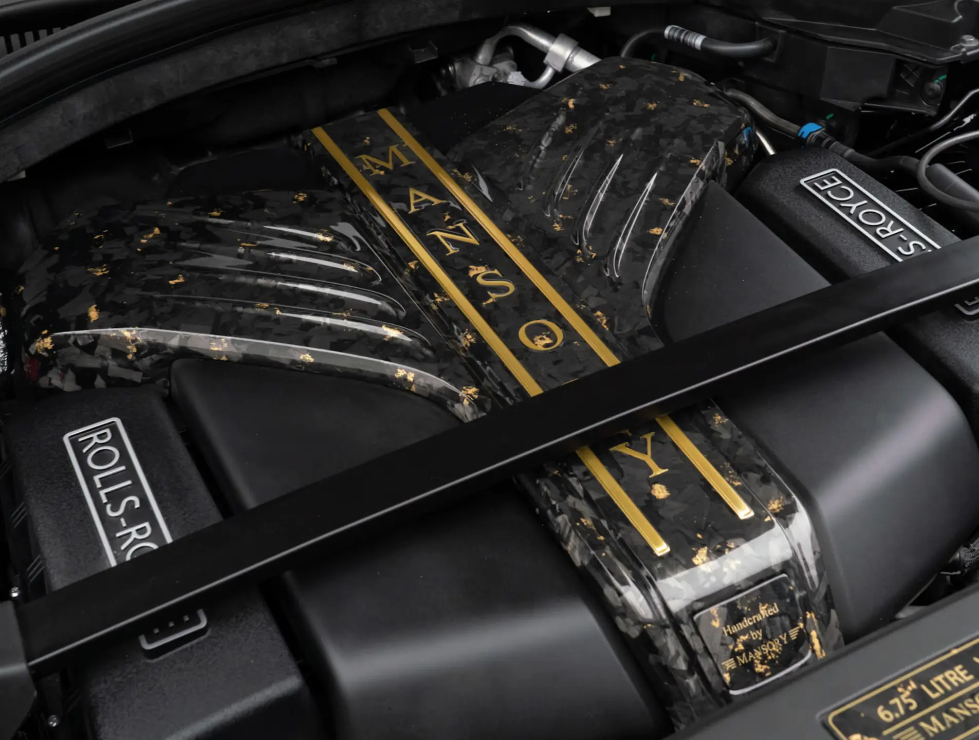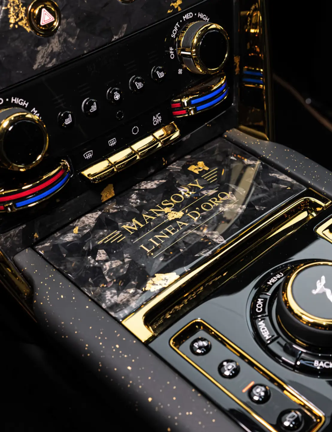 IDEA & CONCEPT Back in 2010, MANSORY used the name "LINEA D`ORO" for the first time as part of a complete conversion of a Bugatti Veyron, taking the use of carbon and real gold in a refined luxury car to a new, previously unrivalled level and onto the road. The "MANSORY LINEA D`ORO" also follows precisely this design approach and transfers it one-to-one from the Bugatti to the Rolls-Royce. And as with the Bugatti, the gold-coloured applications of the otherwise chrome and silver-coloured components all around and the gold-coloured rims catch the eye of the observer. In addition, all the carbon fibre parts of the exterior are discreetly decorated with real gold inlays. Black leather with gold-coloured piping is used in the interior. As with the exterior, all carbon parts in the interior are decorated with real gold inlays and all standard parts otherwise finished in chrome or silver are painted gold, so that only the colours black and gold appear in the interior without exception. Real gold inlays are also used in the centre console and pedals.