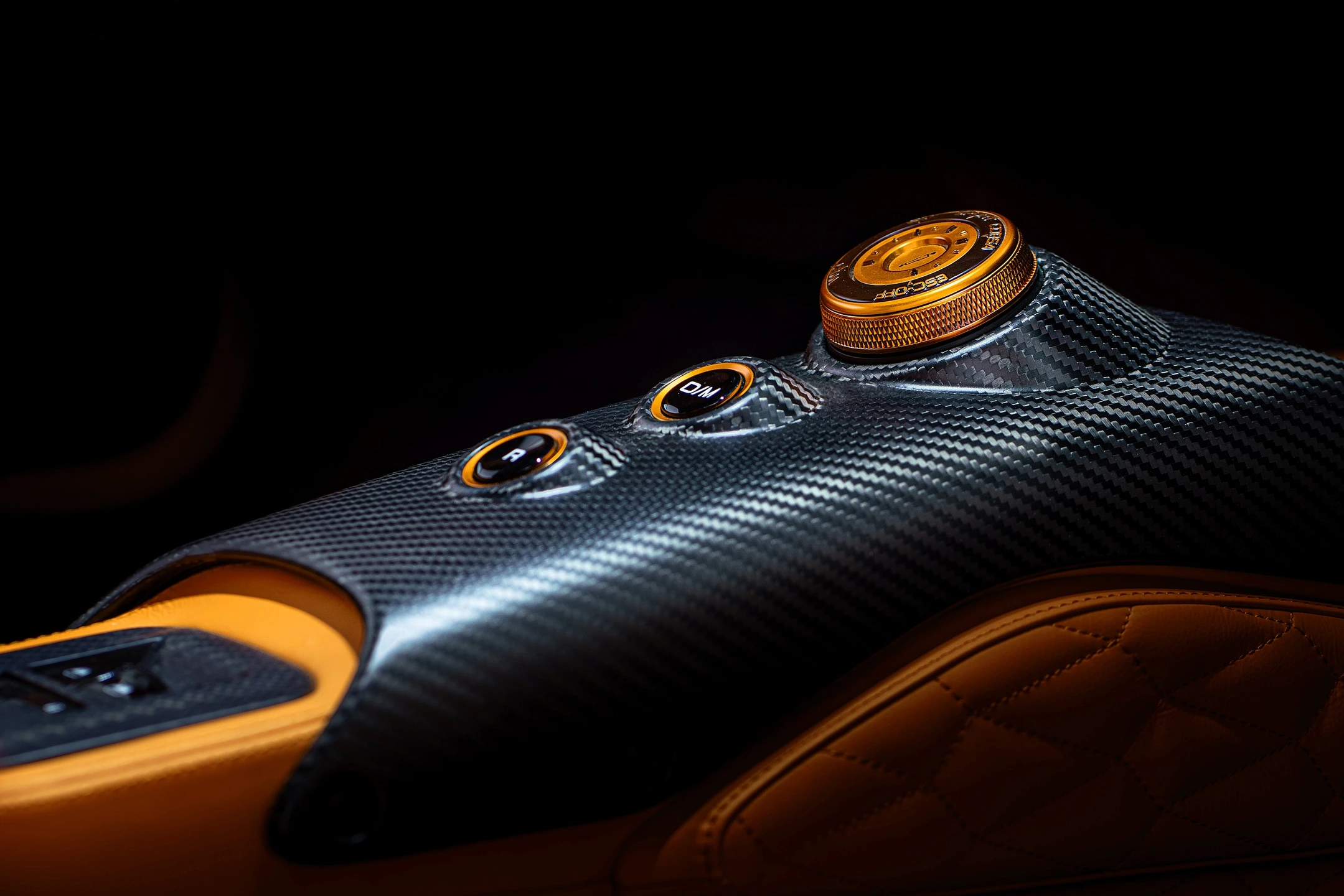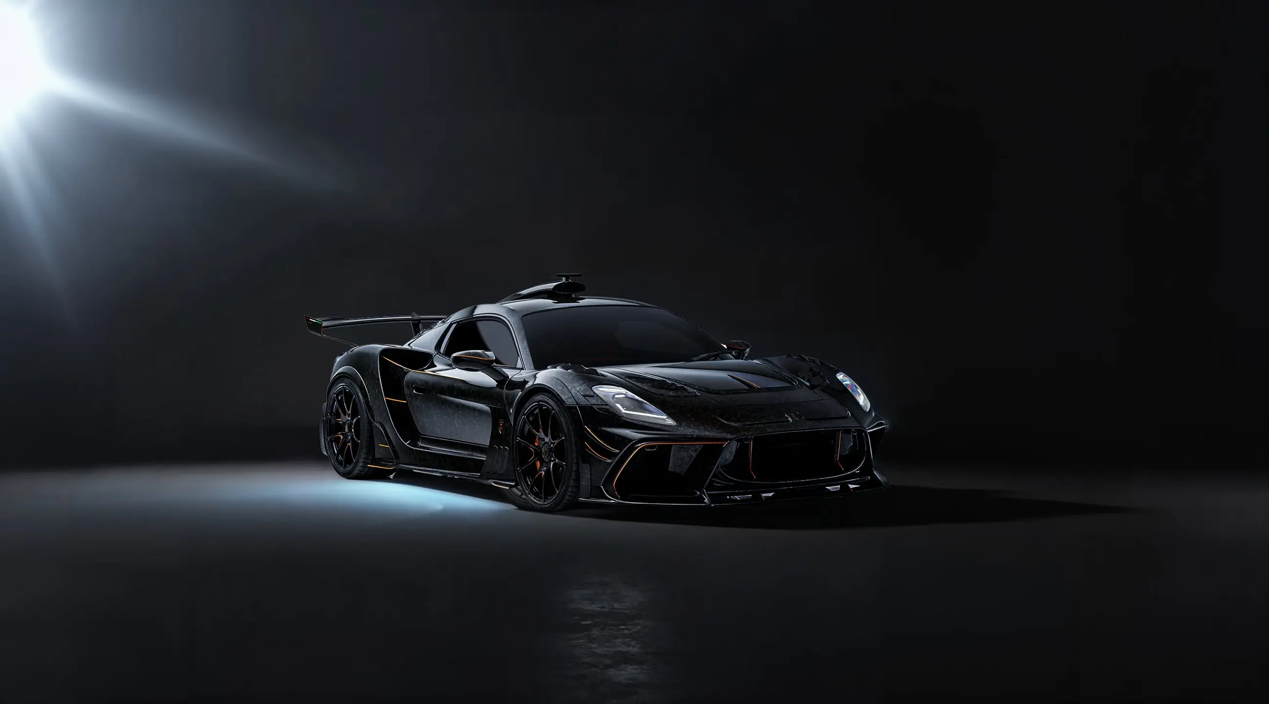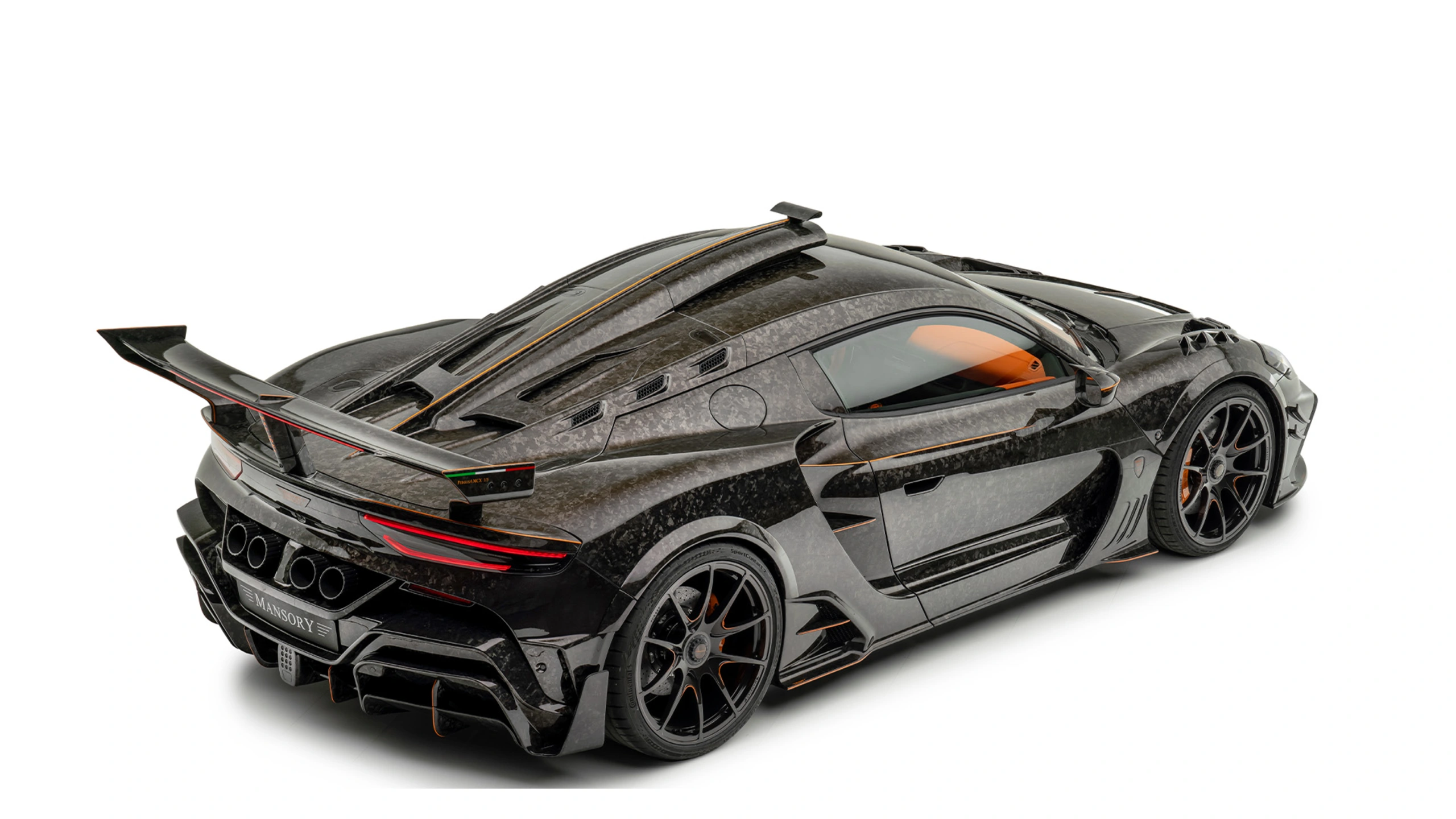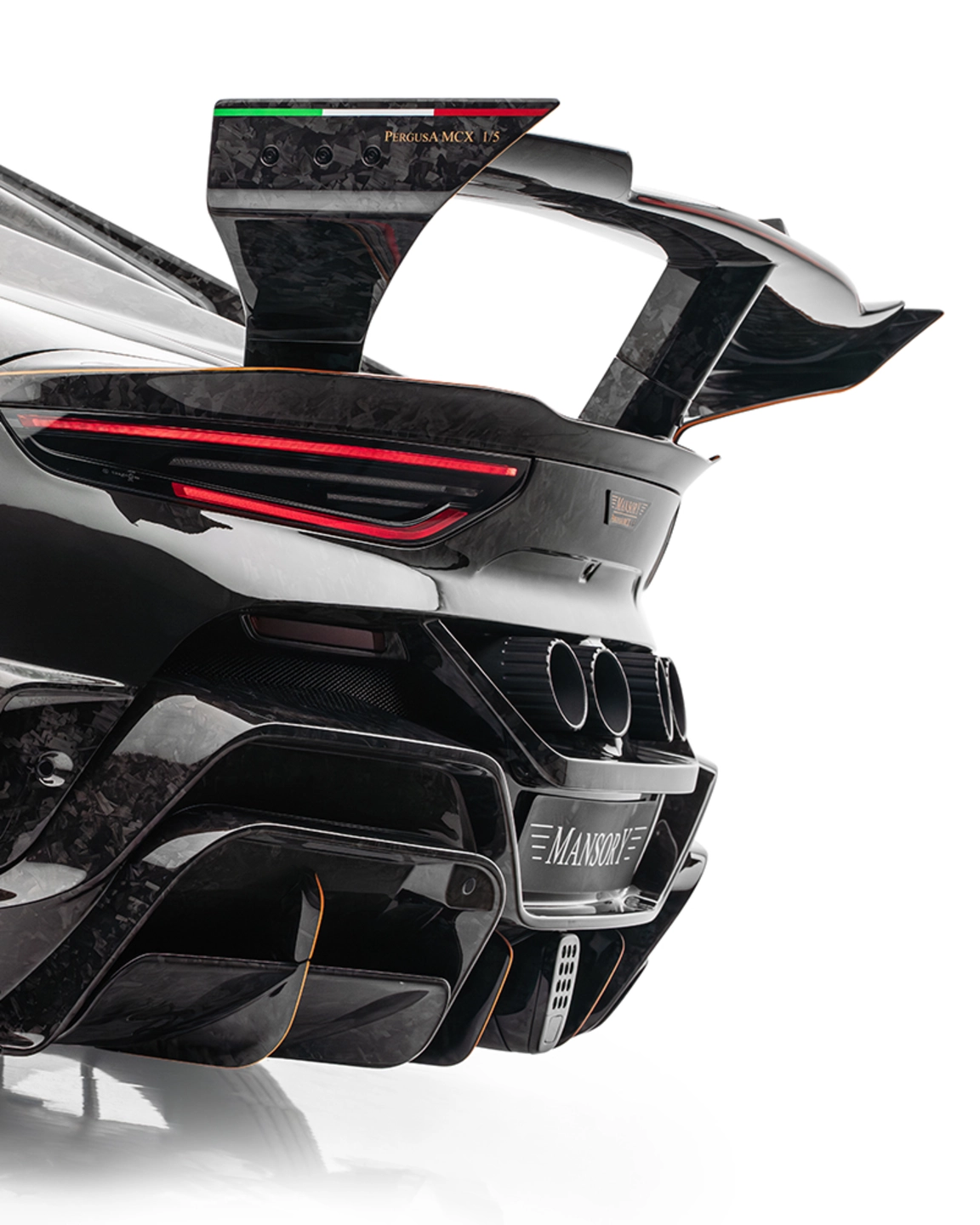 Striking, massively enlarged air inlets in the carbon front apron, which ensure fresh air flow to the high-performance coolers at all times, and a new, specially developed front lip give the “MANSORY MCX PERGUSA” an impressive appearance and, in conjunction with the additional flaps, are also characterized by a significantly improved appearance Output on the front axle. [Read more] On the side, no less striking carbon wheel arches and the carbon air scoop with attached spoiler that reaches up to the windshield frame show the unmistakable signature and expertise of the MANSORY house when it comes to carbon processing. The side cooling air inlets to the engine are also made of carbon. A new carbon bonnet also supplies the engine from above with additional cooling fresh air for the powerful V6 biturbo engine, which is installed longitudinally in front of the rear axle. A completely new carbon rear wing and a completely newly developed carbon double diffuser with a central brake light increase the downforce on the rear axle and complete the extensive aerodynamic improvements on the “MANSORY MCX PERGUSA” to create a visually harmonious overall package. An impressive, powerful four-pipe exhaust system rounds off the rear view harmoniously and powerfully.