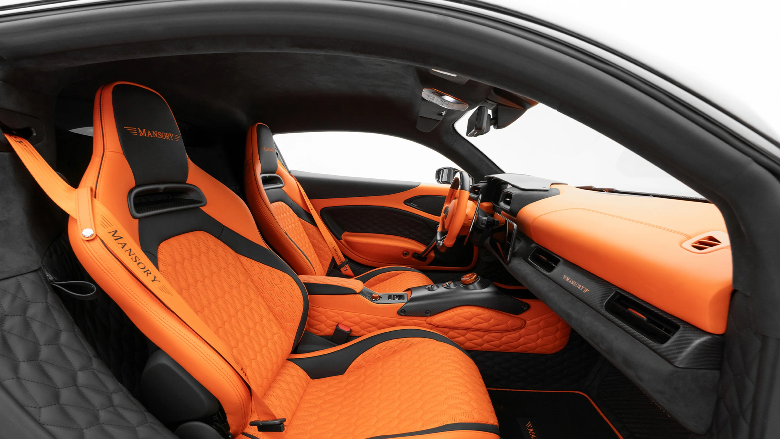 The interior of the “MANSORY MCX PERGUSA” can be freely selected and configured by the customer. As is customary at MANSORY, the interior is completely designed in elegant, glove-soft leather and meets the highest demands in terms of workmanship and attention to detail. This attention to detail is reflected, among other things, in the orange seat belts, which are accentuated with black MANSORY logos. The entire footwell and the associated floor mats are also made of leather and the colour coordinates with the rest of the interior. Wherever leather is not used (or should not be used), the interior is selectively refined with carbon. A MANSORY sports leather steering wheel and several precisely embroidered MANSORY logos elegantly round off the comprehensive refinement in the interior.