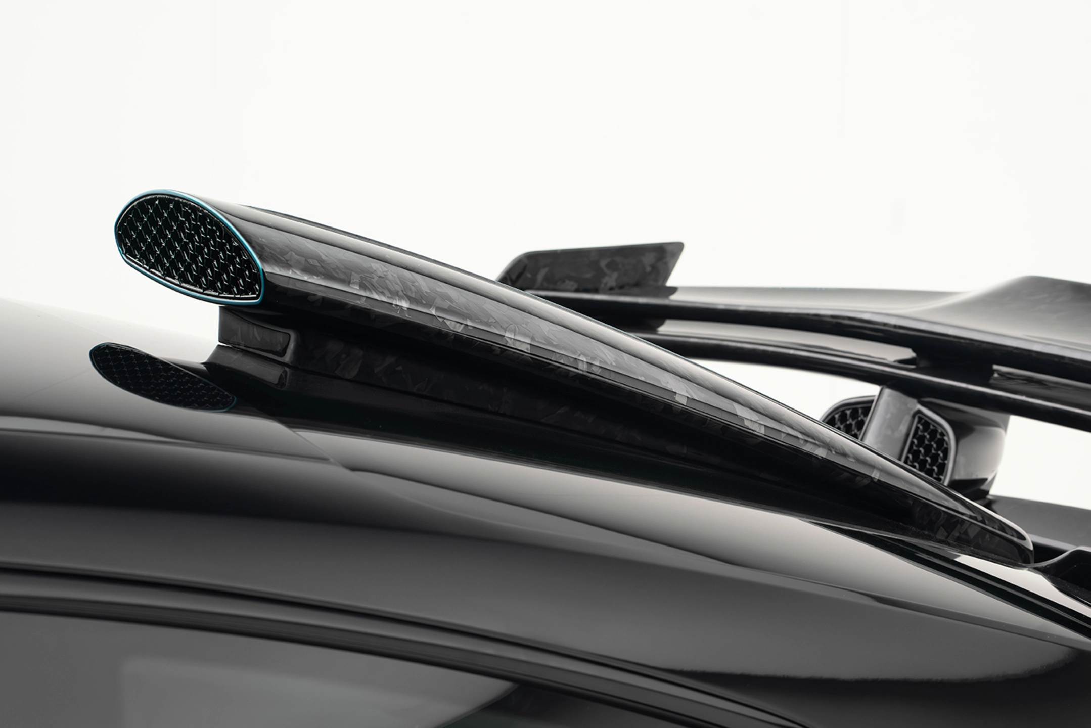 The "P9LM EVO 900" impresses from the front with its striking, significantly enlarged air intakes in the completely redesigned front apron made of carbon. The daytime running lights have been repositioned due to the larger inlet openings and now harmoniously run around the air intakes in an arc in the upper part of the air intakes. [Read more] The front bonnet of the "P9LM EVO 900" is completely finished in visible carbon and finds its visual continuation in the upper part of the apron (also finished in visible carbon). Ventilation outlets for the wheel arches integrated into the top of the wings and body extensions on the wheel arches all around, also manufactured in visible carbon. On request, the "P9LM EVO 900" can also be delivered without body extensions and then remains identical in width as the standard vehicle. The air intakes in the rear side panel are framed by large air inlets made of visible carbon and, in conjunction with the additional intake scoop on the rear window (only on the Coupé), ensure that sufficient fresh air flows to the engine in every driving condition. The newly developed diffuser and the large retractable rear spoiler generate additional downforce. The rear apron as such is partly painted and partly finished in visible carbon. A completely new 3-pipe exhaust system (two exhaust pipes of the six-cylinder engine each flow into one tailpipe) rounds off the rear view.