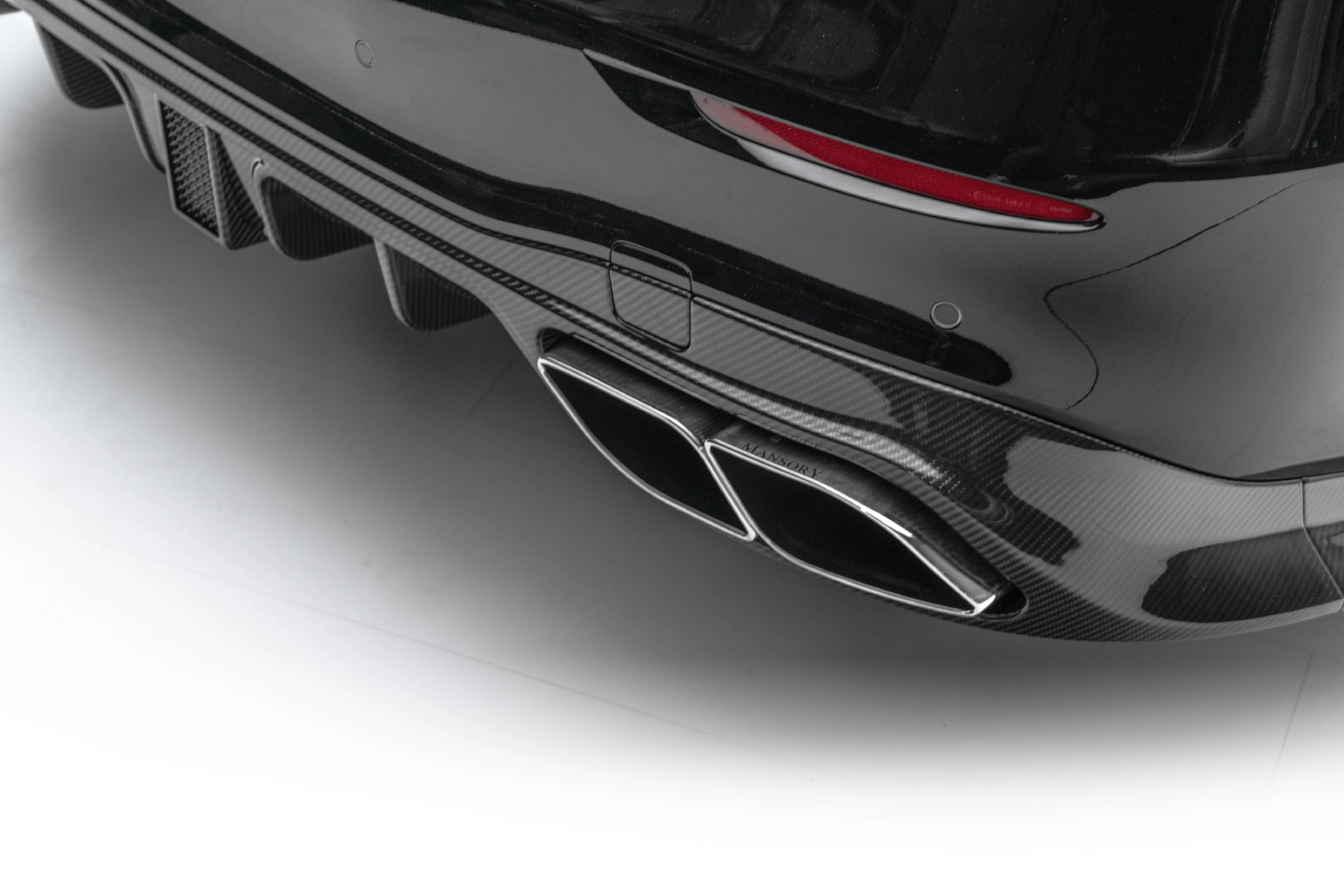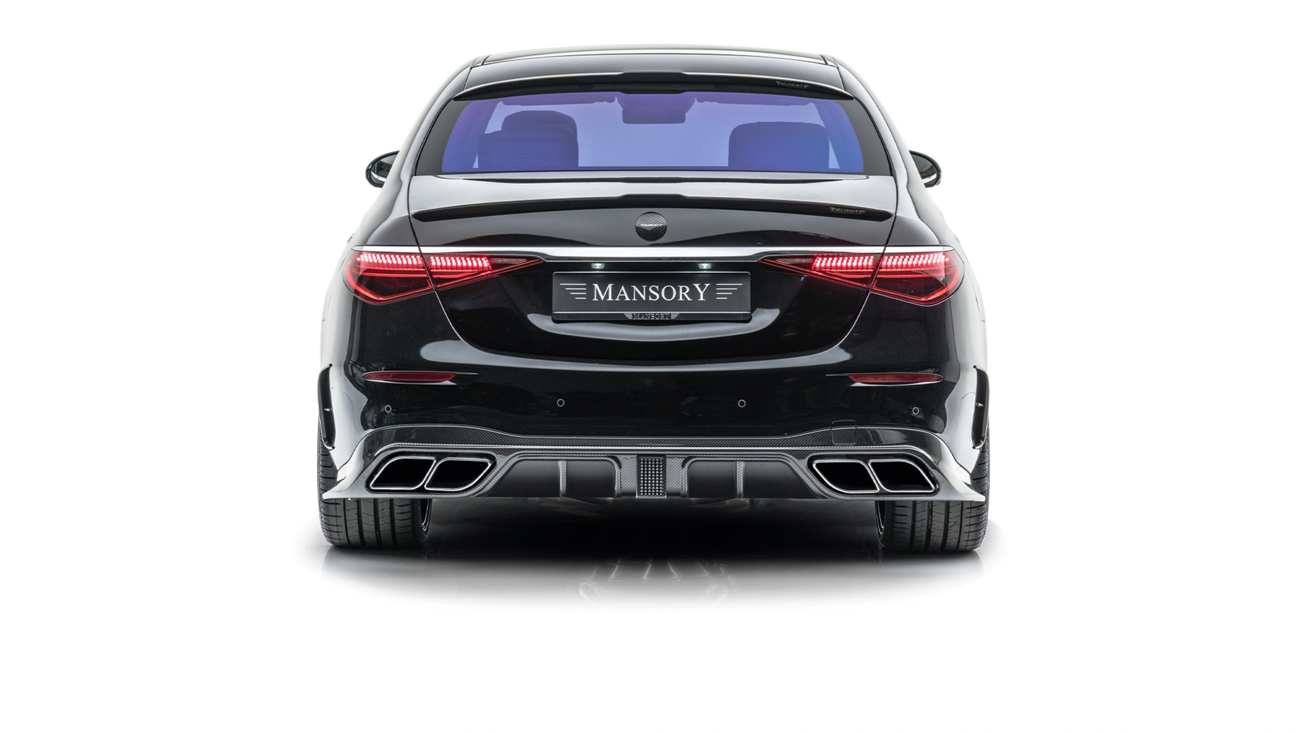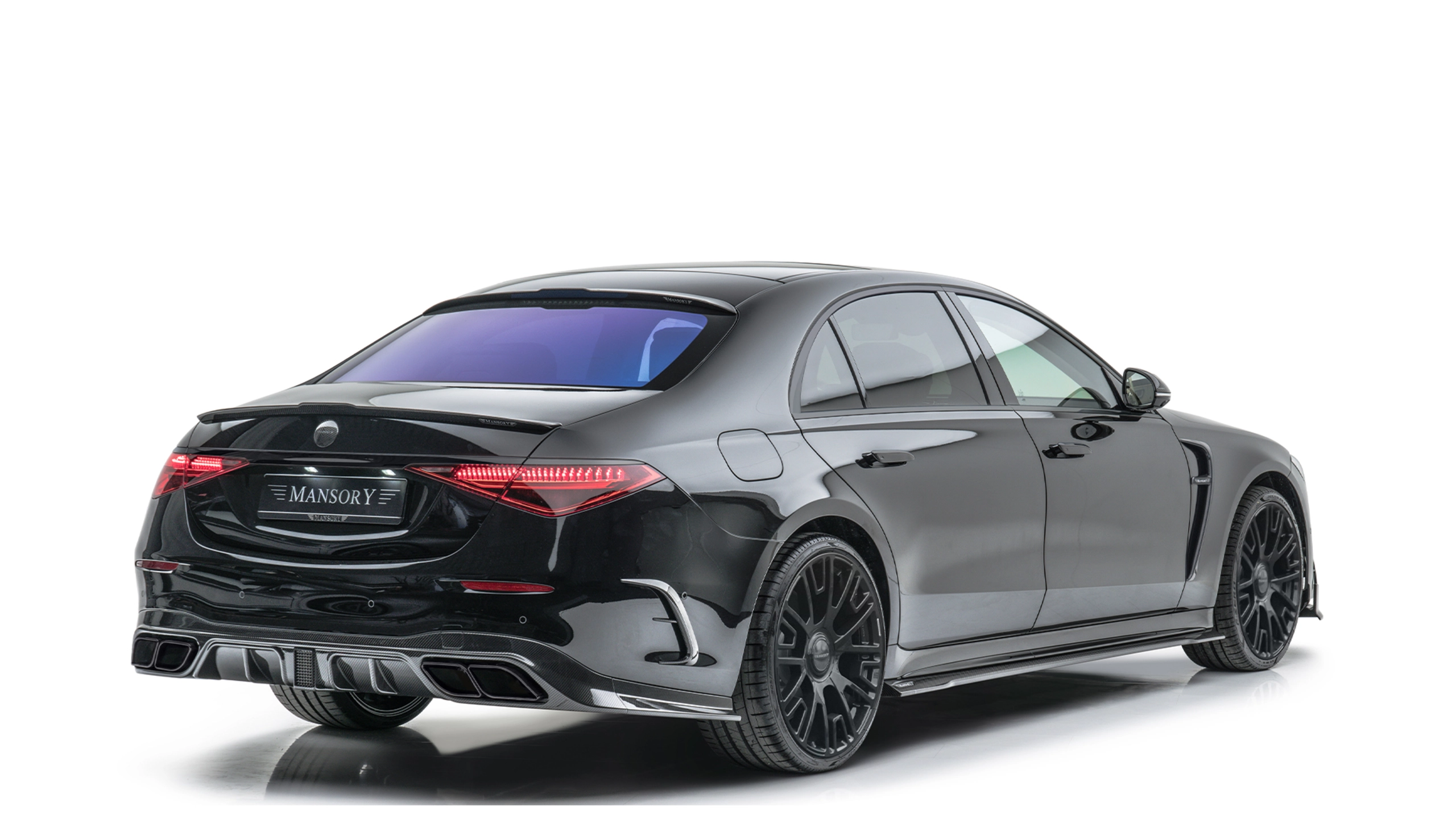 In order to further accentuate the already very elegant appearance of the S-Class in detail, MANSORY has installed numerous carbon add-on parts all around the vehicle. The noble and lightweight material is used on the front air intakes, below and to the side of the front apron, on the sills, on the exterior mirrors and on the rear apron. Further carbon applications like the roof spoiler and a spoiler on the tailgate harmoniously round off the exterior appearance, which is deliberately kept discreet in keeping with the classic S-Class clientele. The front apron can be ordered with or without daytime running lights.