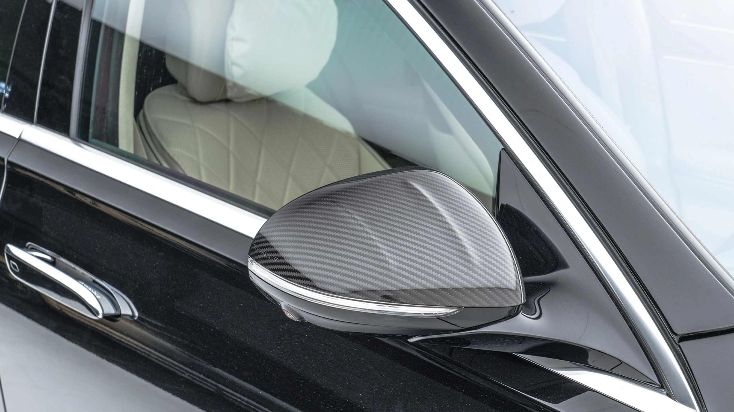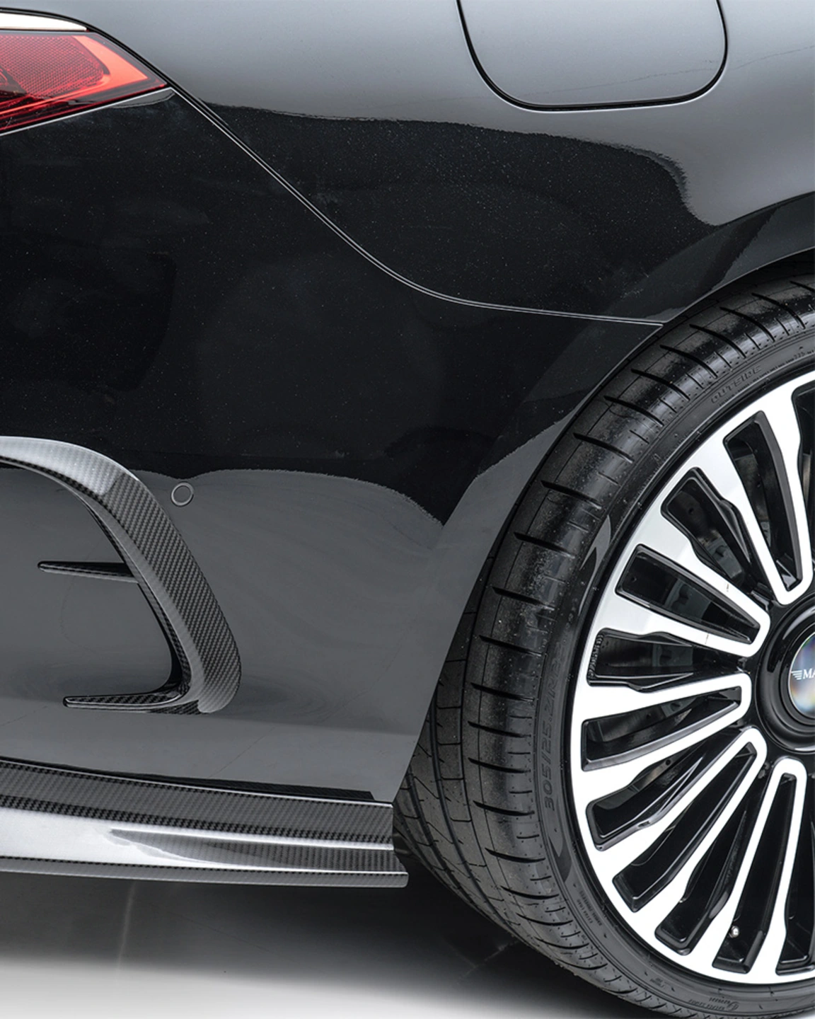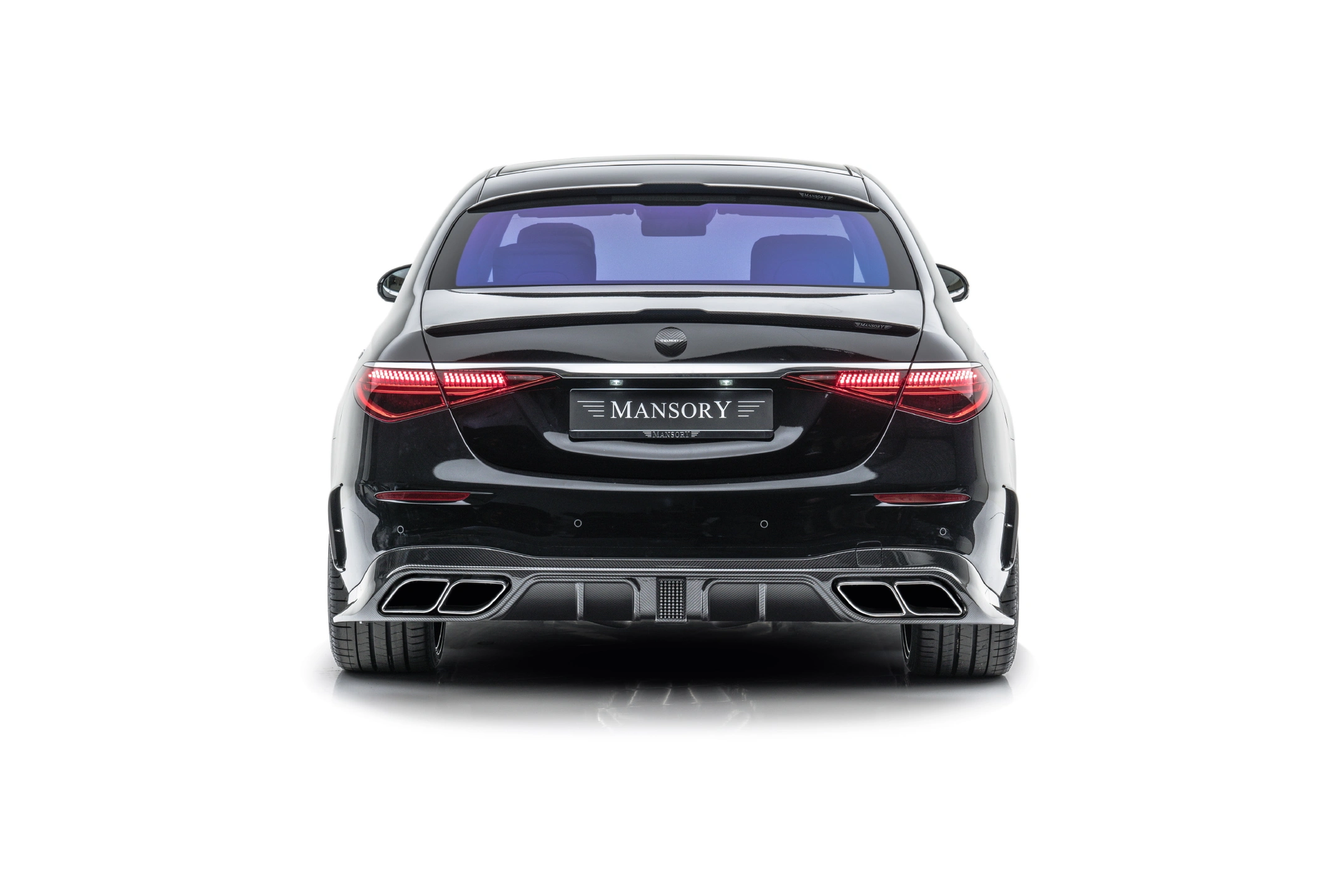 In order to further accentuate the already very elegant appearance of the S-Class in detail, MANSORY has installed numerous carbon add-on parts all around the vehicle. The noble and lightweight material is used on the front air intakes, below and to the side of the front apron, on the sills, on the exterior mirrors and on the rear apron. Further carbon applications like the roof spoiler and a spoiler on the tailgate harmoniously round off the exterior appearance, which is deliberately kept discreet in keeping with the classic S-Class clientele. The front apron can be ordered with or without daytime running lights.