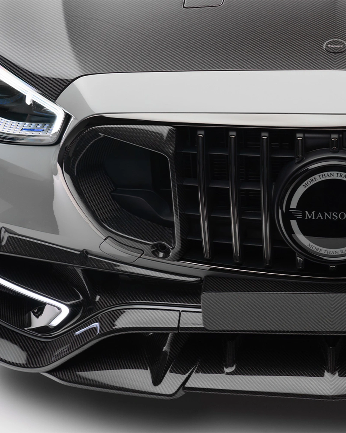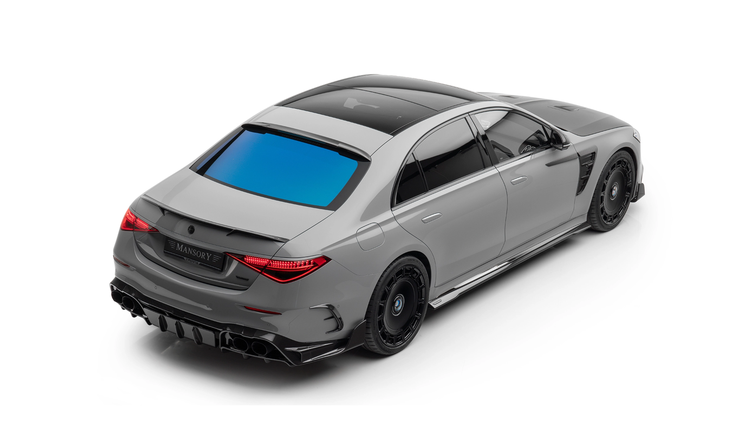 MANSORY refines the entire aerodynamics of the "Mercedes-AMG S 63 E PERFORMANCE by MANSORY" completely "in-house". This results in an impressive styling combined with optimised aerodynamics with increased downforce values for significantly improved cornering performance. [Read more] For this purpose, the front of the "Mercedes-AMG S 63 E PERFORMANCE by MANSORY" is redesigned with a completely new apron including integrated front lip and side flaps made of carbon. The ultra-light carbon bonnet with additional cooling air intakes in visible carbon completes the redesign of the front section. On the flanks, striking MANSORY side skirts made of full carbon ensure the continuation of the design language and give the "Mercedes-AMG S 63 E PERFORMANCE by MANSORY" a significantly more powerful, but also lower and more elongated appearance. To increase the downforce on the rear axle, the MANSORY engineers developed a new spoiler for mounting on the tailgate, which is also made entirely of carbon. In addition, a new rear apron with diffuser and side flaps skilfully sets off the striking tailpipes of the sports exhaust system. The rear apron as such is available in two versions: With and without central brake light. Numerous other carbon-fibre components such as the roof spoiler, mirror housings and air intake trim add further striking highlights.