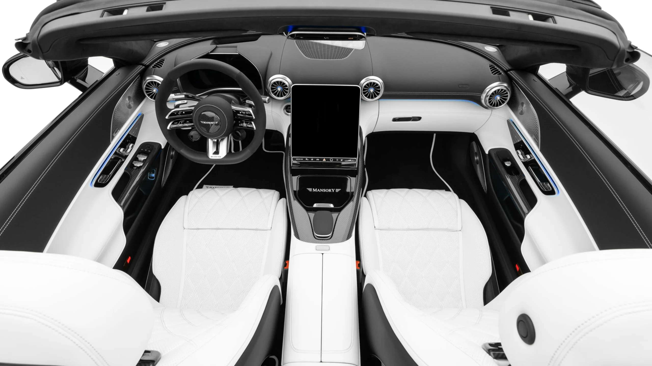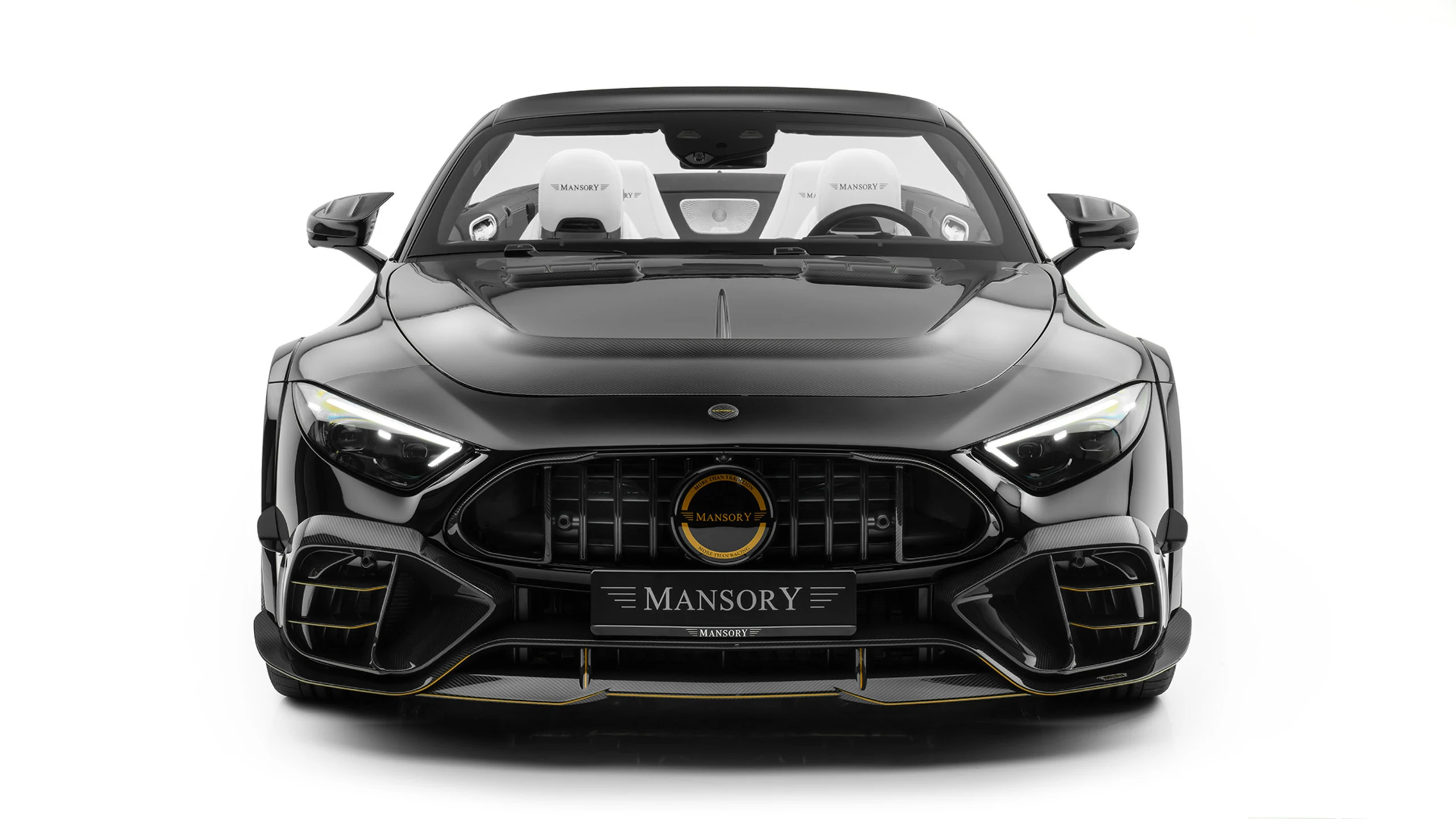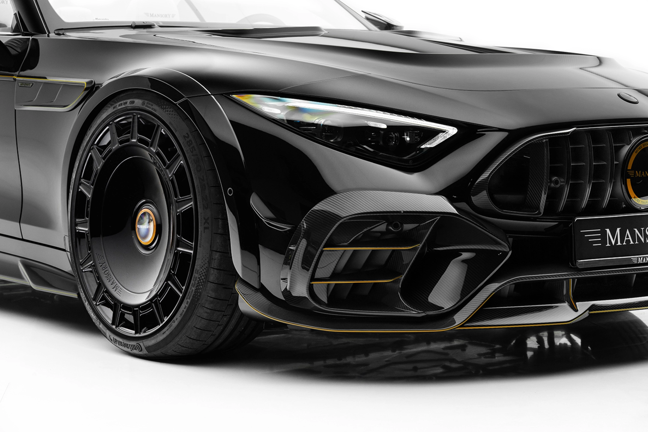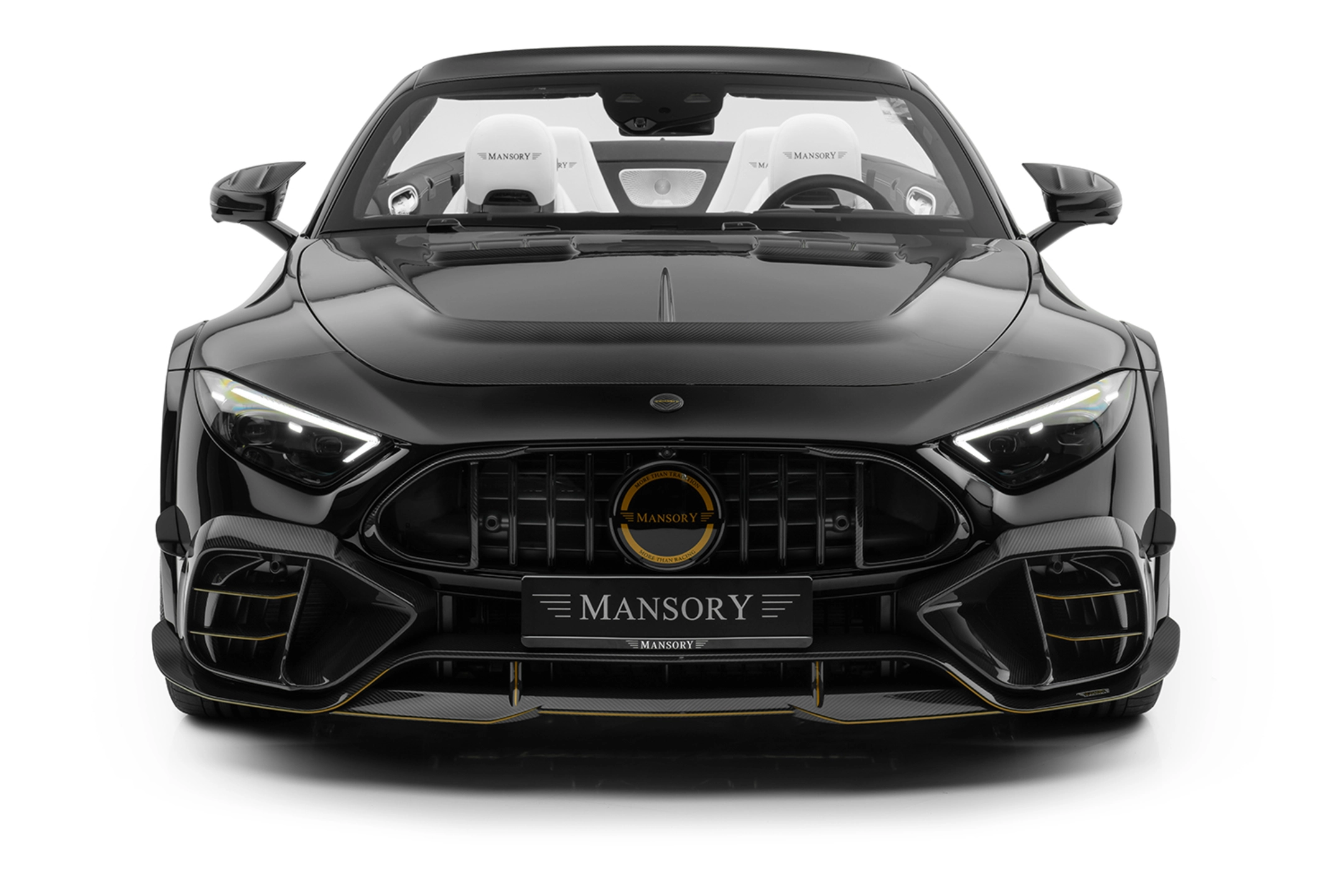 n order to further accentuate the already very elegant appearance of the SL in detail, MANSORY has installed numerous add-on parts made of carbon all around the vehicle. The noble and light material is used on the front air intakes, below and to the side of the front apron, in the radiator grille, the sills, the exterior mirrors and the rear apron. Further carbon applications on the front windscreen frame, the side air outlets at the front and at the rear on the wings complete the subtle and effective body modifications. A bonnet and a rear spoiler, as well as the simultaneously elegant and visually effective wing extensions made of full carbon complete the entire "Mercedes SL Widebody by MANSORY" and harmoniously round off the overall exterior appearance. All carbon parts can be individually selected from the extensive MANSORY carbon range.