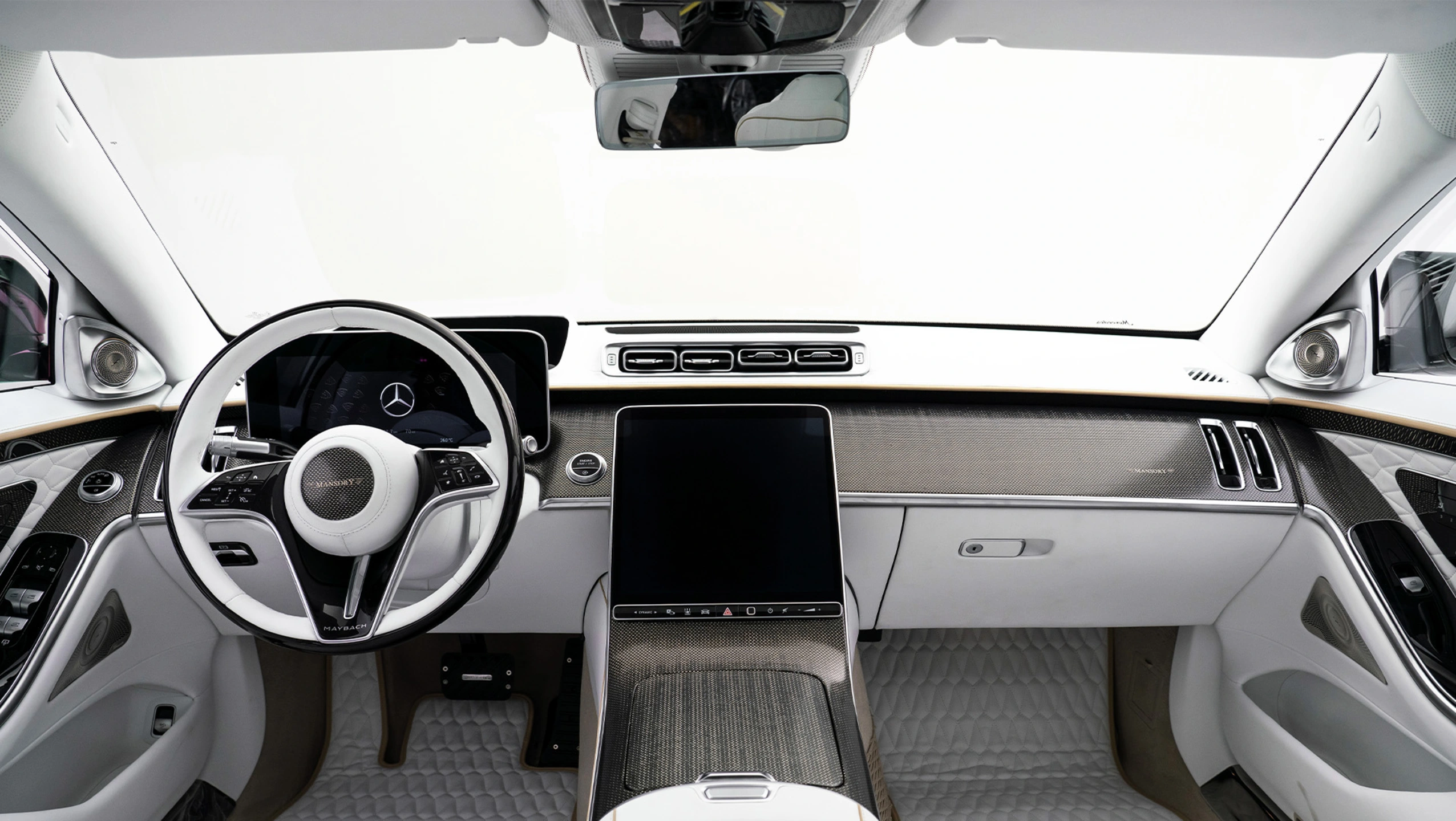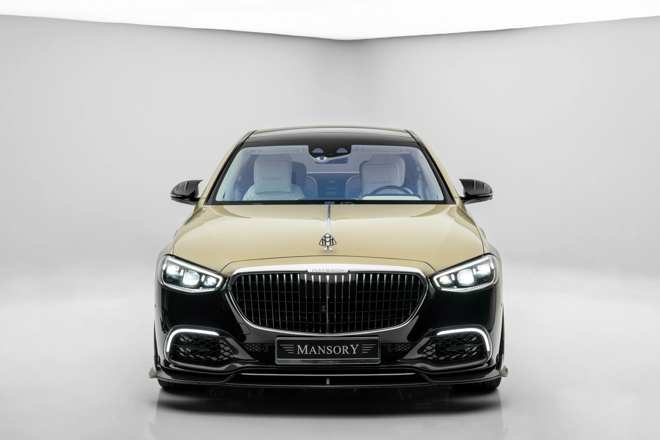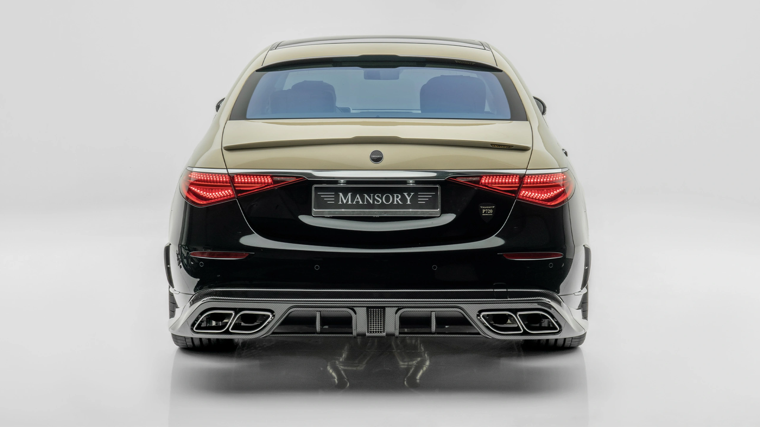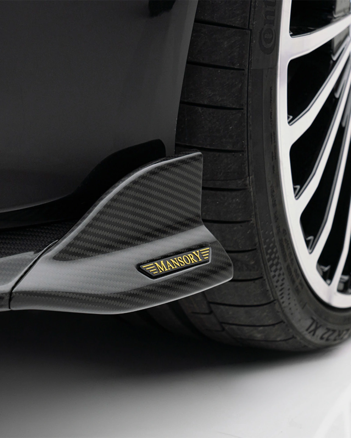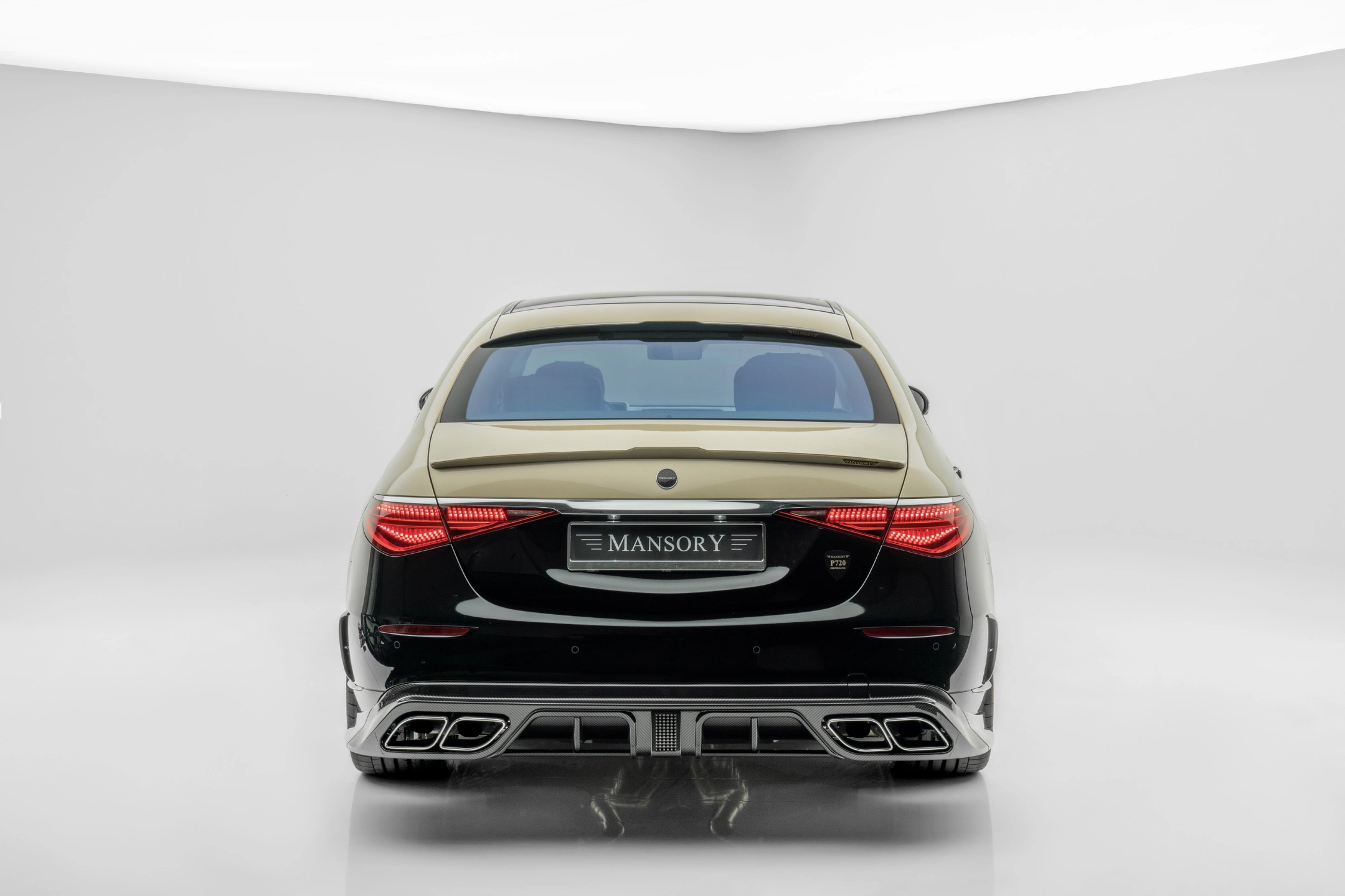 To further accentuate the already very elegant appearance of the Mercedes-Maybach S-Class in detail, MANSORY has installed numerous carbon add-on parts all around the vehicle. The noble and lightweight material is used on the front air intakes, below and to the side of the front apron, on the sills, on the exterior mirrors and on the rear apron. The rear apron as such can be designed in two versions, depending on your preference: With and without a central brake light. Further carbon applications in the form of a roof edge spoiler and a spoiler on the tailgate, together with the duo-tone vehicle paintwork, round off the exterior appearance, which is deliberately kept discreet in keeping with the classic Mercedes-Maybach S-Class clientele, very harmoniously.