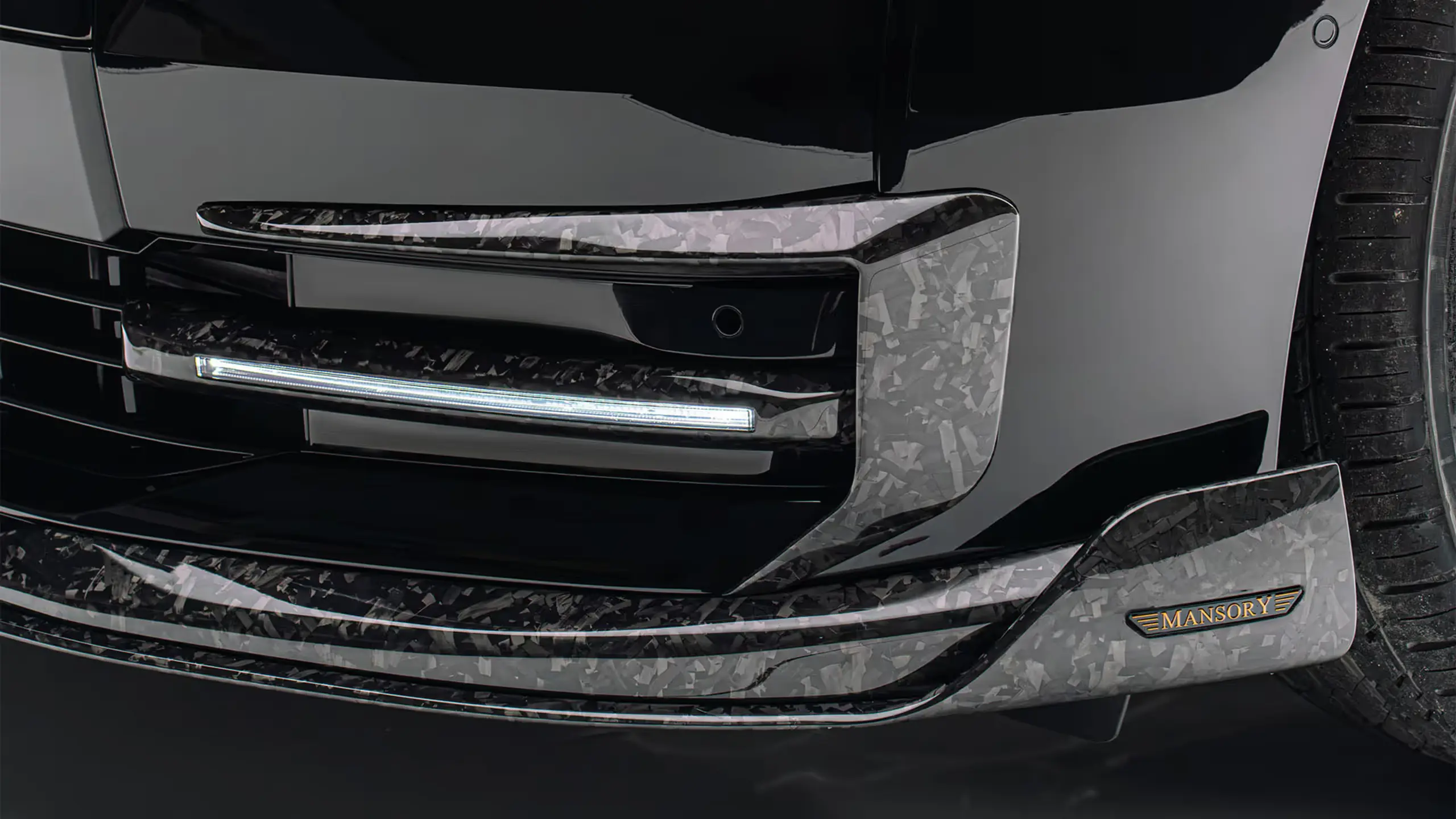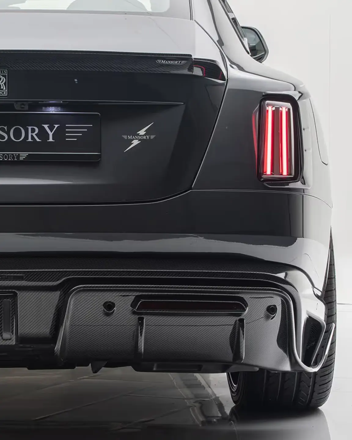 After its redesign, the front of the “Rolls-Royce Spectre by MANSORY” has an integrated front lip with side flaps in the area of the apron, which are made of visible carbon. The blackened, impressive radiator grille can be discreetly but effectively illuminated in the desired colour at the push of a button in perfect harmony with the colour concept of the respective conversion. [Read more] The ultra-light carbon bonnet (with visible carbon structure) and LED daytime running lights complete the extensive changes to the front section. On the flanks, discreet sills in dark visible carbon ensure a holistic design approach. The air outlets in the fenders (also made of carbon fiber) and the black painted door handles complement the conversion work in the side view and make the “Rolls-Royce Spectre by MANSORY” appear significantly stronger, lower and sportier. To maximise the downforce on the rear axle, the MANSORY technicians installed an attractive spoiler on the tailgate as well as an aerodynamically coordinated rear diffuser. Both aerodynamic components are also made of visible carbon and, together with the carbon taillight surrounds, skilfully highlight the rear of the “Rolls-Royce Spectre by MANSORY”. The rear diffuser can be ordered with a central brake light on request.