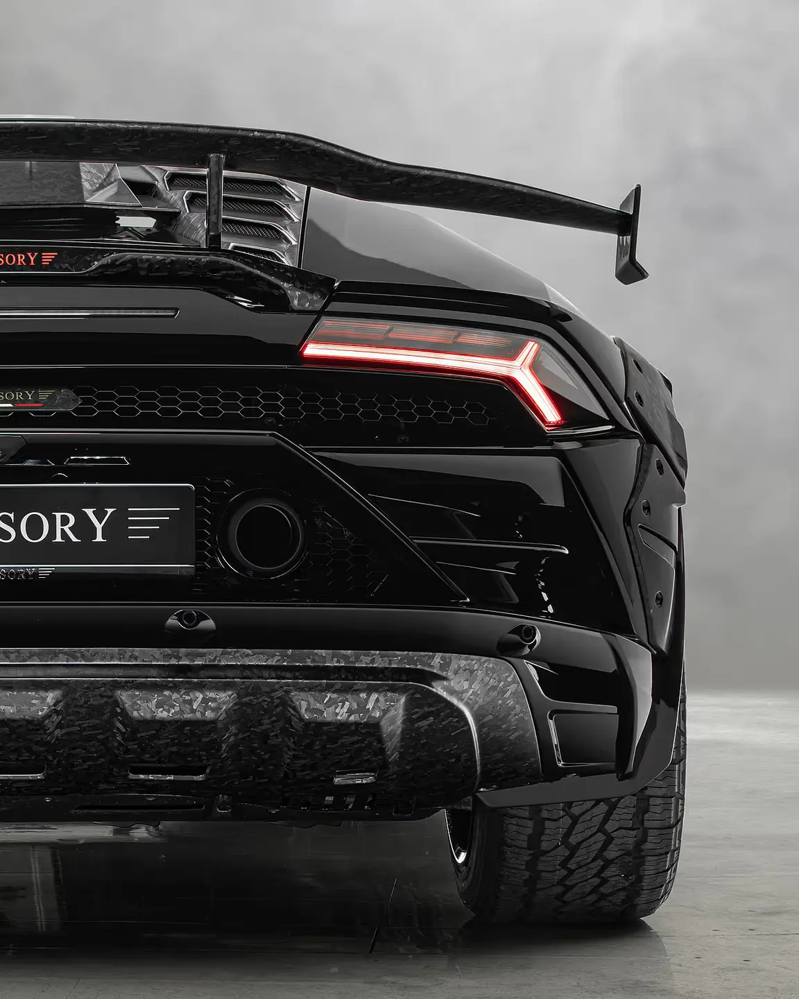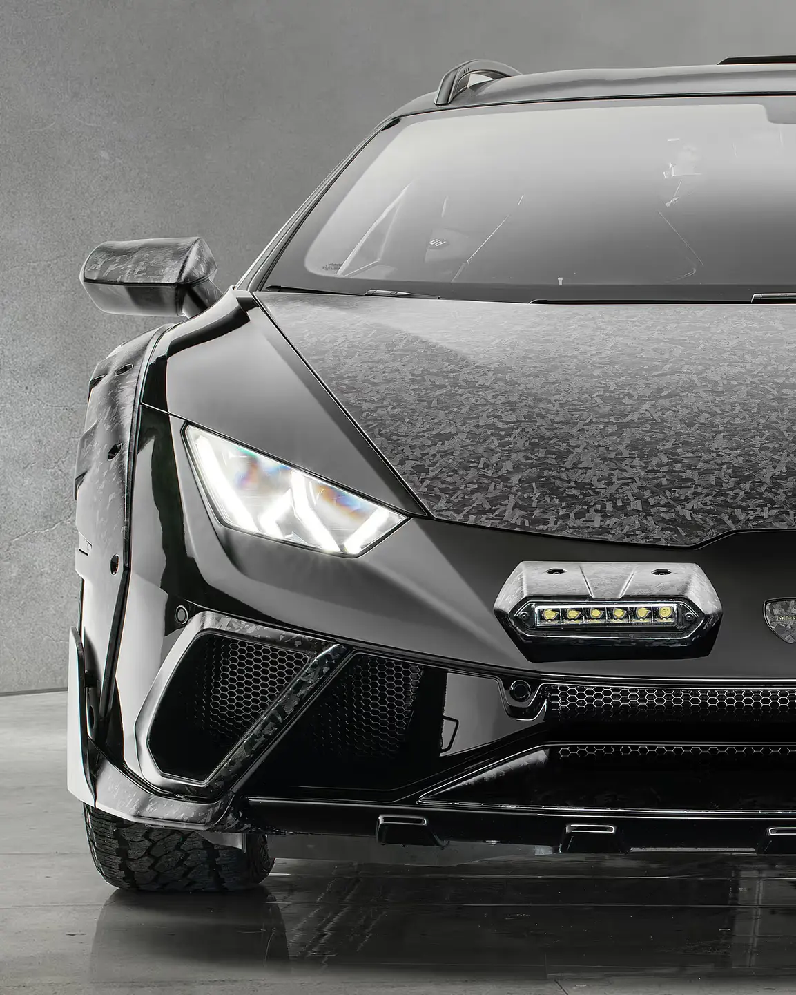 All body components of the breathtaking "super sports car off-roader" are made of full carbon and give the car a powerful, harmonious and impressive appearance that characterizes every MANSORY product. A ultra-light full carbon bonnet characterizes the view of the vehicle from the front. The front section is also supplemented by individual components in visible carbon - thus rounding off the front design of the "Huracán Sterrato by MANSORY". The side line of the car is dominated by the full carbon body extensions at the front and rear. The full carbon engine compartment cover, together with the full carbon rear spoiler, forms the transition to the rear of the vehicle. The rear itself is dominated by a full carbon rear diffuser, which completes the sporty, powerful character of the "Huracán Sterrato by MANSORY" when viewed from behind.