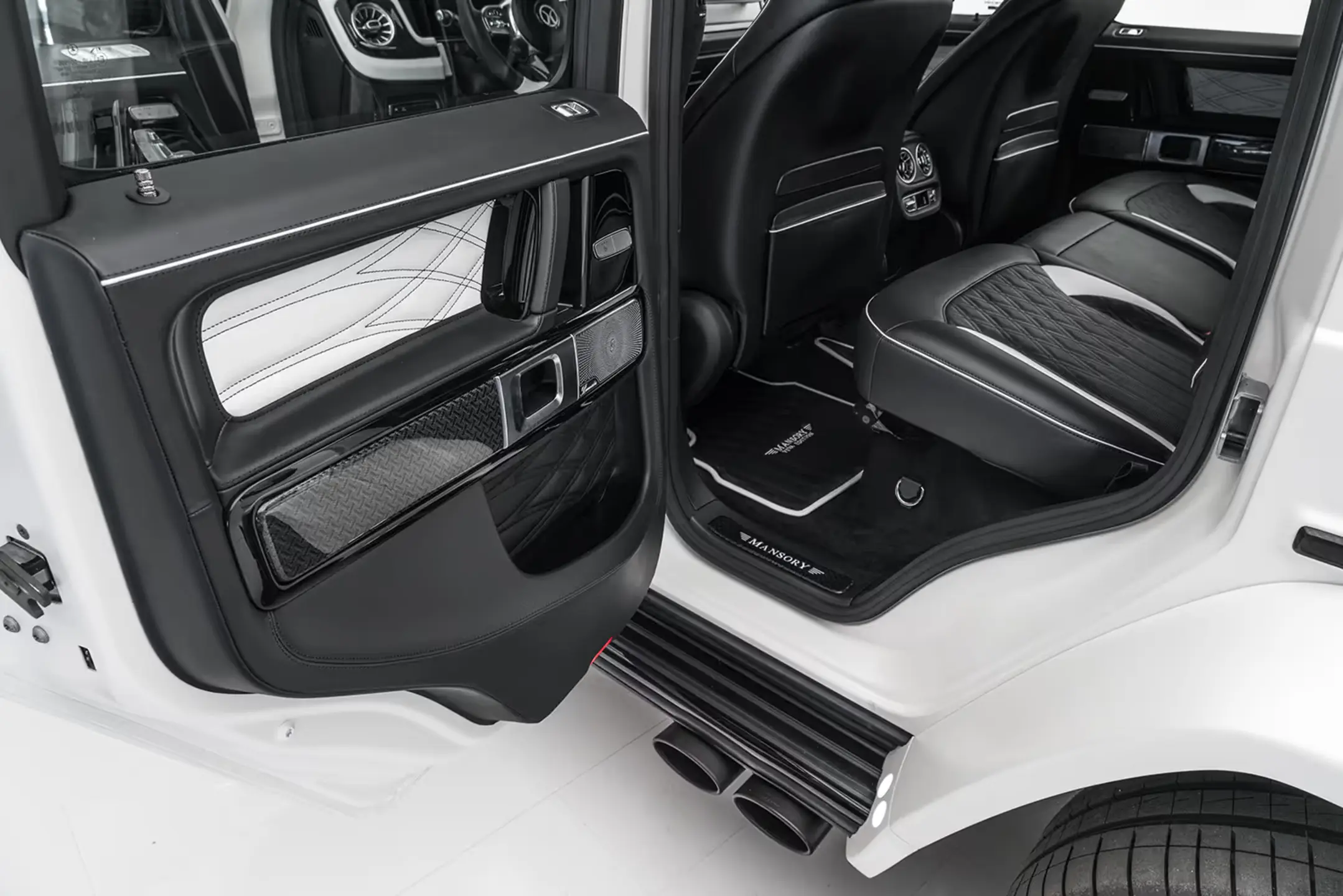 And – as with all complete conversions of MANSORY, the interior design is in no way inferior to the exclusive exterior. Only the finest materials are used in the interior, which is completely done in full leather. A new leather-carbon sports steering wheel, a sports pedal set in aluminium, carbon inlays and new leather inserts with 3D embossing for the seats, in the door inserts and the centre armrest are just as pleasing to the eye as the precisely worked embroidery of the MANSORY logo in the seats and the floor mats. The carpets in the interior are coloured to customer requirements.