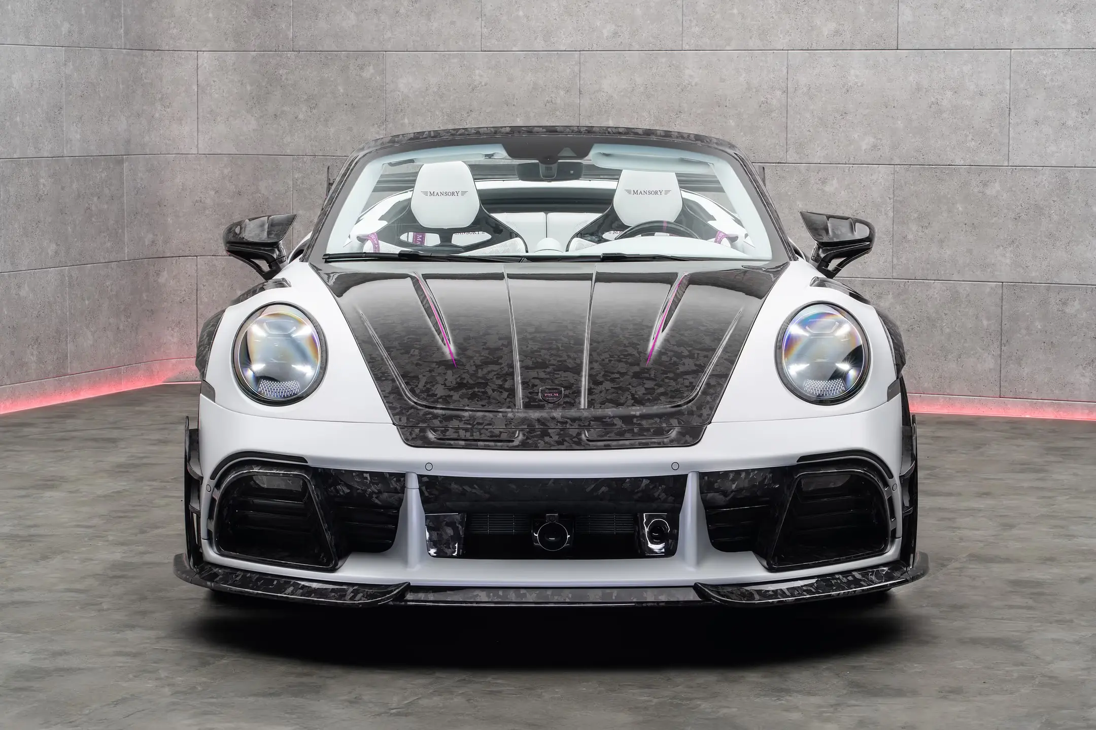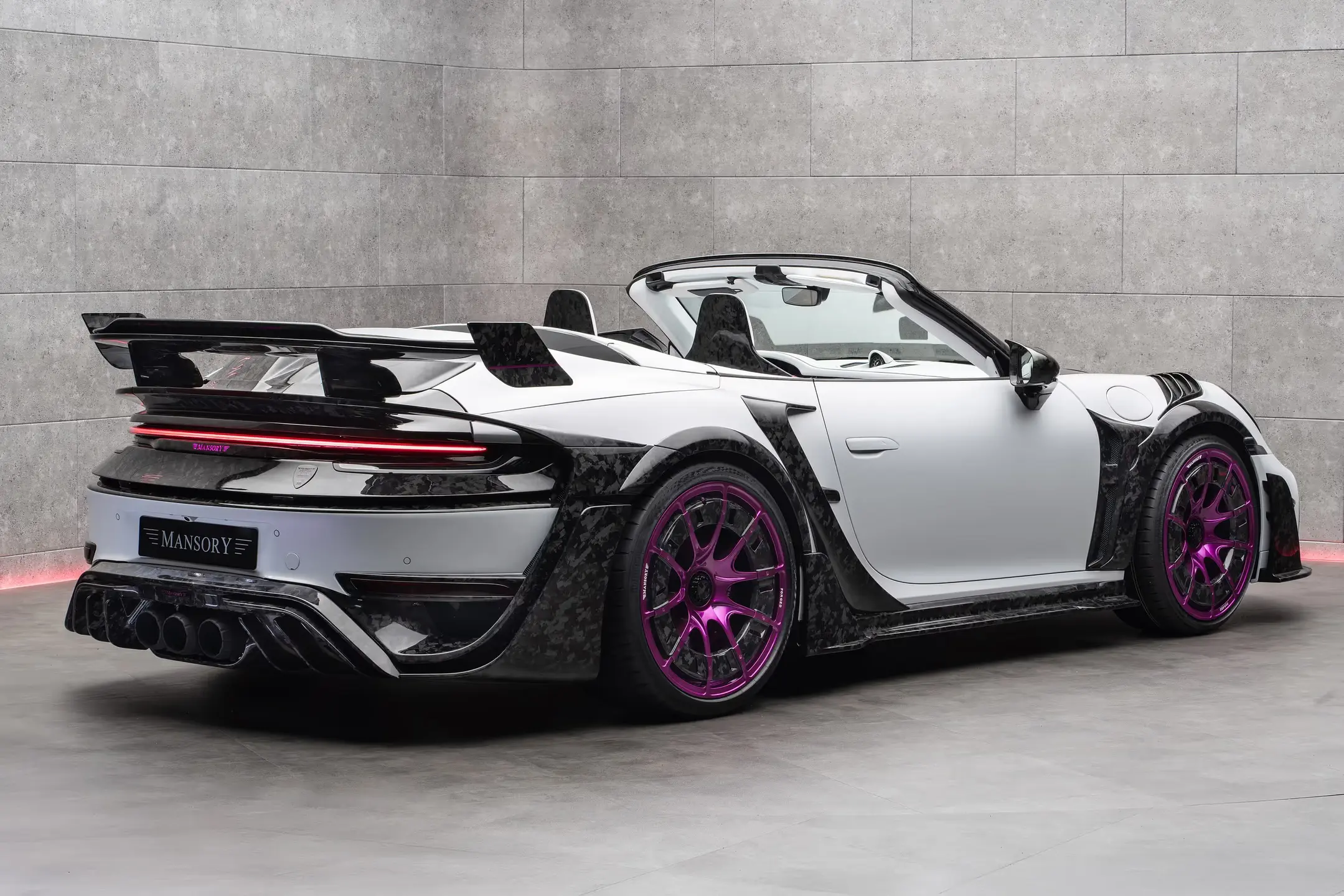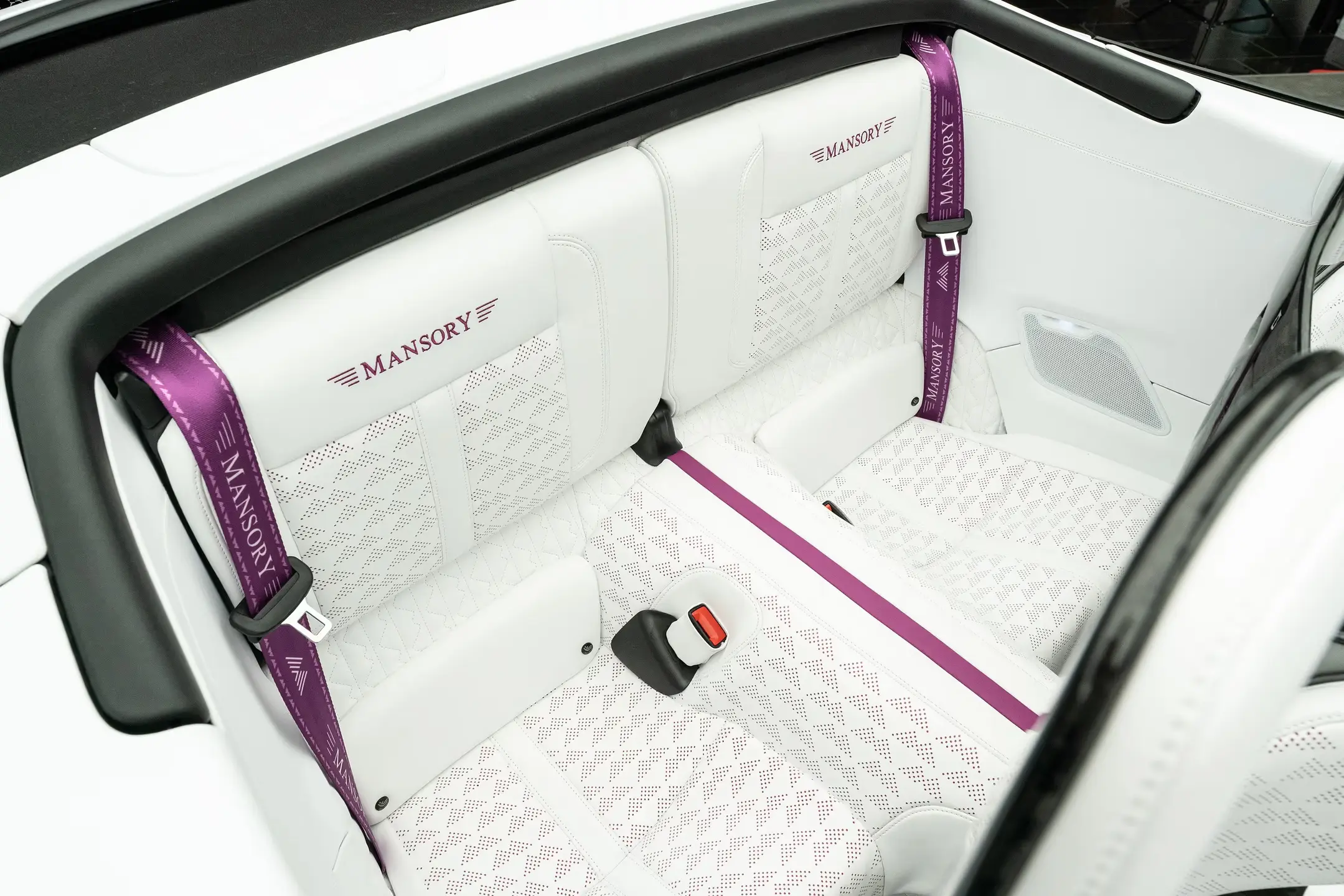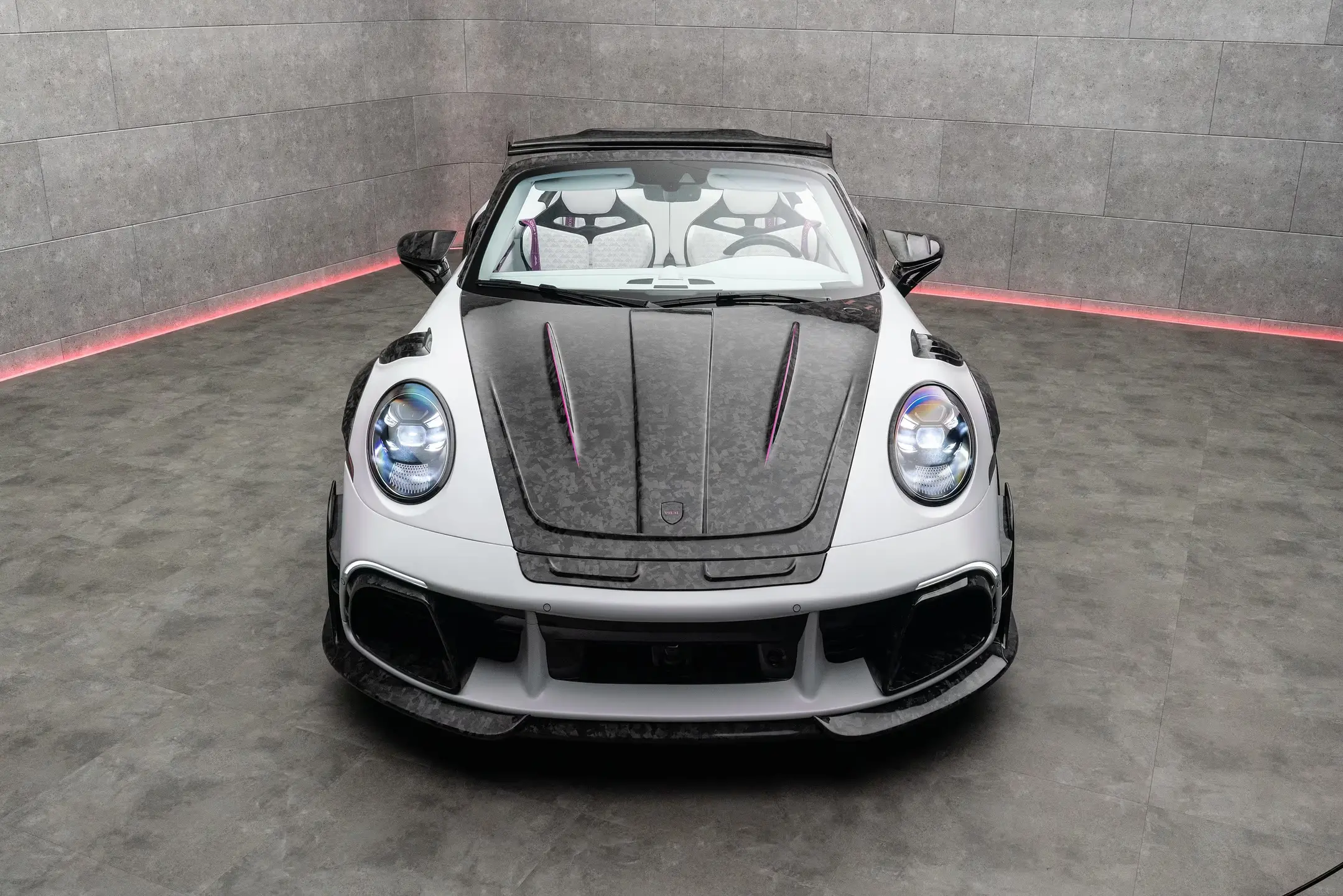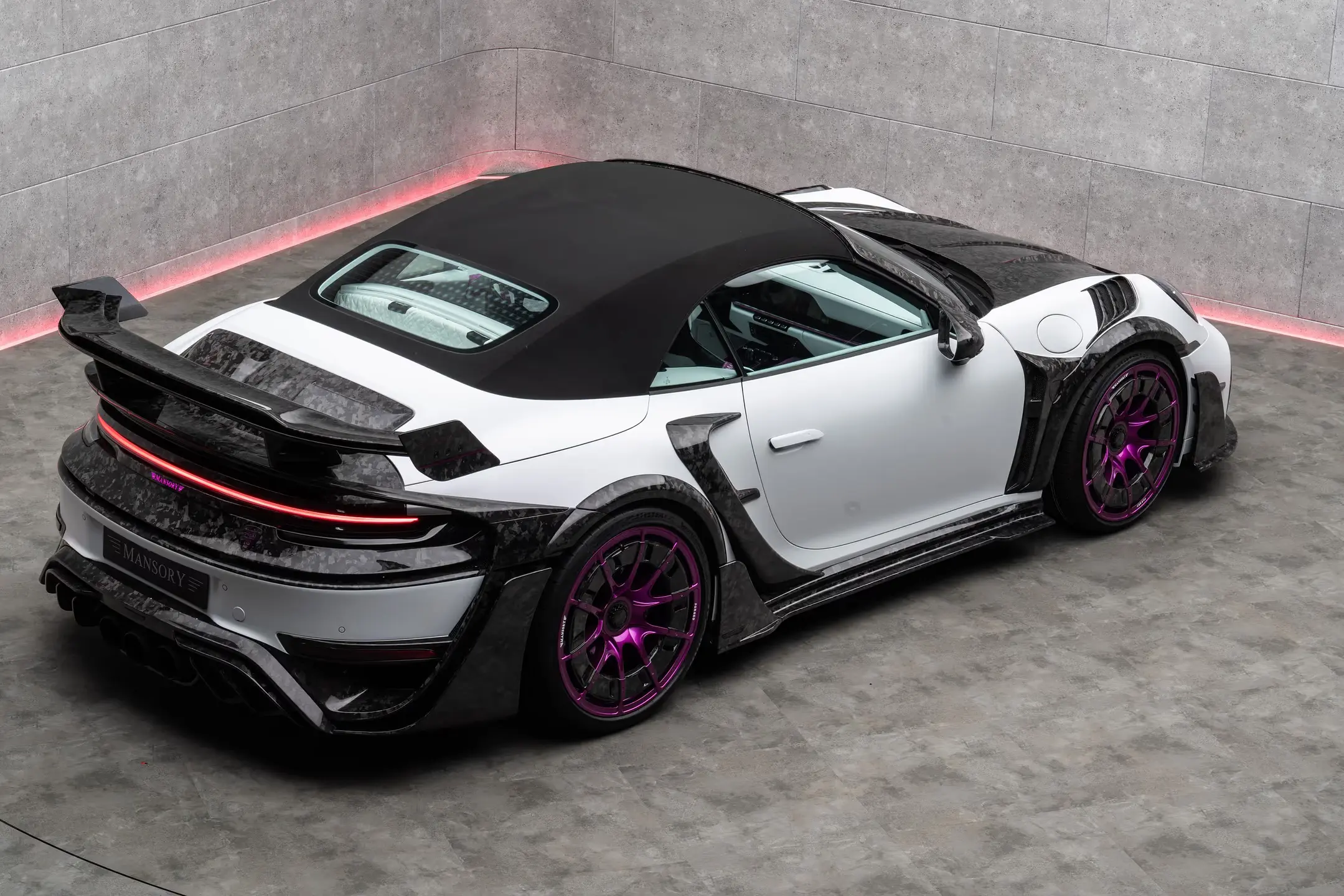 The "P9LM EVO 900 CABRIO 1 of 7" impresses from the front with its striking, significantly enlarged air intakes in the completely redesigned front apron made of carbon. The daytime running lights have been repositioned due to the larger inlet openings and now harmoniously run around the air intakes in an arc in the upper part of the air intakes. The front bonnet of the "P9LM EVO 900 CABRIO 1 of 7" is completely finished in visible carbon and finds its visual continuation in the upper part of the apron (also finished in visible carbon). Ventilation outlets for the wheel arches integrated into the top of the wings and body extensions on the wheel arches all around, also manufactured in visible carbon. On request, the "P9LM EVO 900 CABRIO 1of 7" can also be delivered without body extensions and then remains identical in width as the standard vehicle. The newly developed diffuser and the large retractable rear spoiler generate additional downforce. The rear apron as such is partly painted and partly finished in visible carbon. A completely new 3-pipe exhaust system (two exhaust pipes of the six-cylinder engine each flow into one tailpipe) rounds off the rear view.
