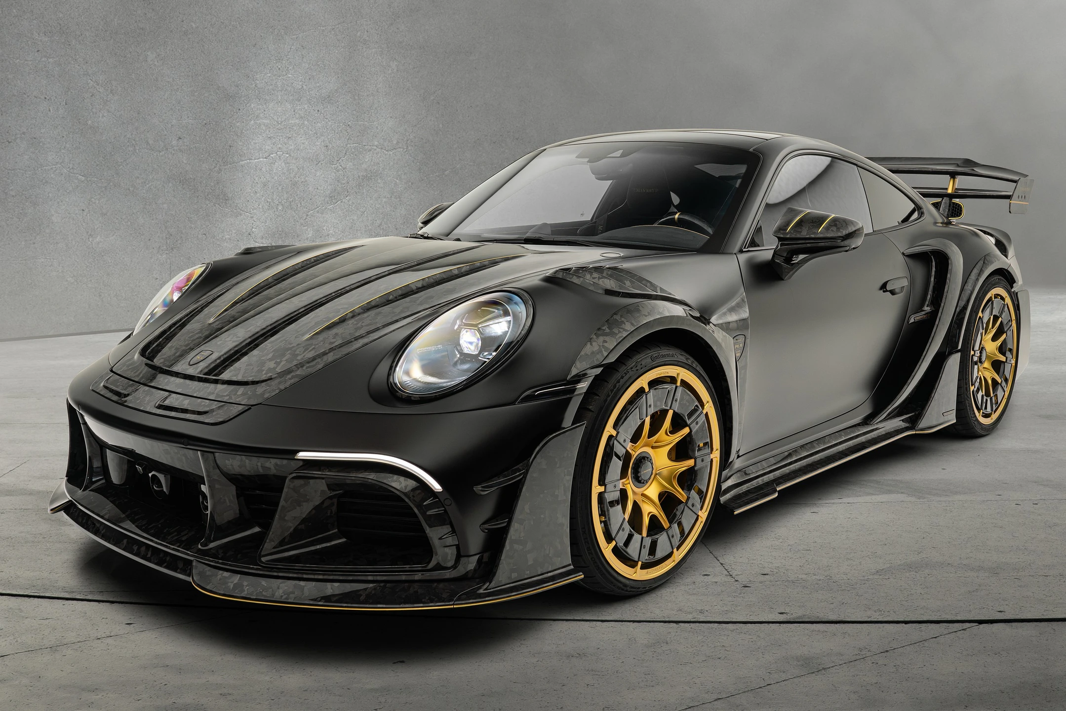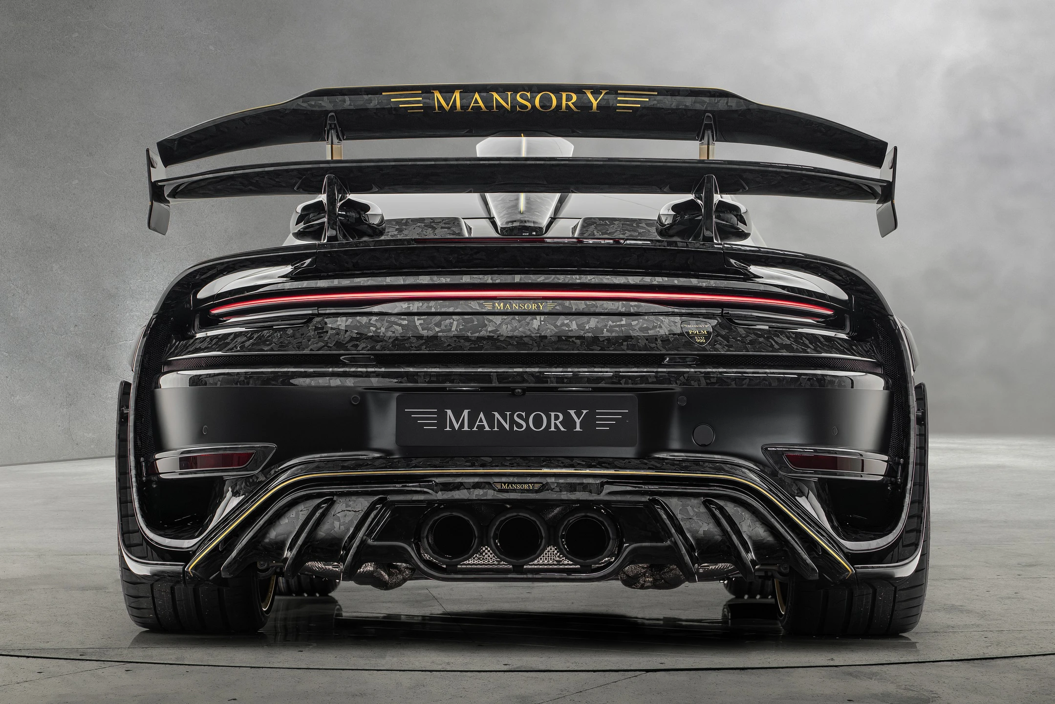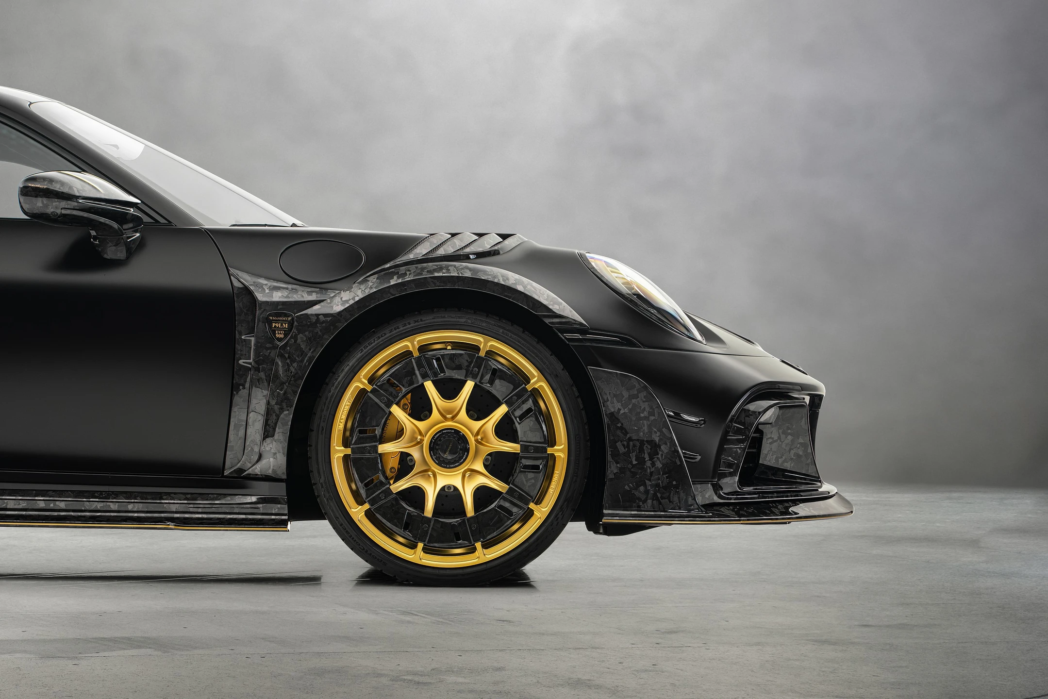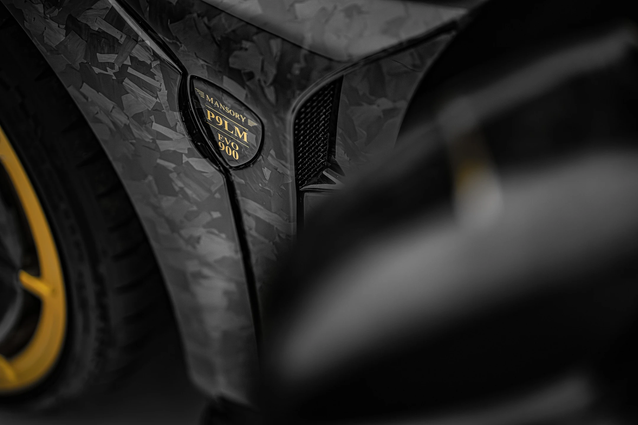 The "P9LM EVO 900" impresses from the front with its striking, significantly enlarged air intakes in the completely redesigned front apron made of carbon. The daytime running lights have been repositioned due to the larger inlet openings and now harmoniously run around the air intakes in an arc in the upper part of the air intakes. The front bonnet of the "P9LM EVO 900" is completely finished in visible carbon and finds its visual continuation in the upper part of the apron (also finished in visible carbon). Ventilation outlets for the wheel arches integrated into the top of the wings and body extensions on the wheel arches all around, also manufactured in visible carbon. On request, the "P9LM EVO 900" can also be delivered without body extensions and then remains identical in width as the standard vehicle. The air intakes in the rear side panel are framed by large air inlets made of visible carbon and, in conjunction with the additional intake scoop on the rear window (only on the Coupé), ensure that sufficient fresh air flows to the engine in every driving condition. The newly developed diffuser and the large retractable rear spoiler generate additional downforce. The rear apron as such is partly painted and partly finished in visible carbon. A completely new 3-pipe exhaust system (two exhaust pipes of the six-cylinder engine each flow into one tailpipe) rounds off the rear view.