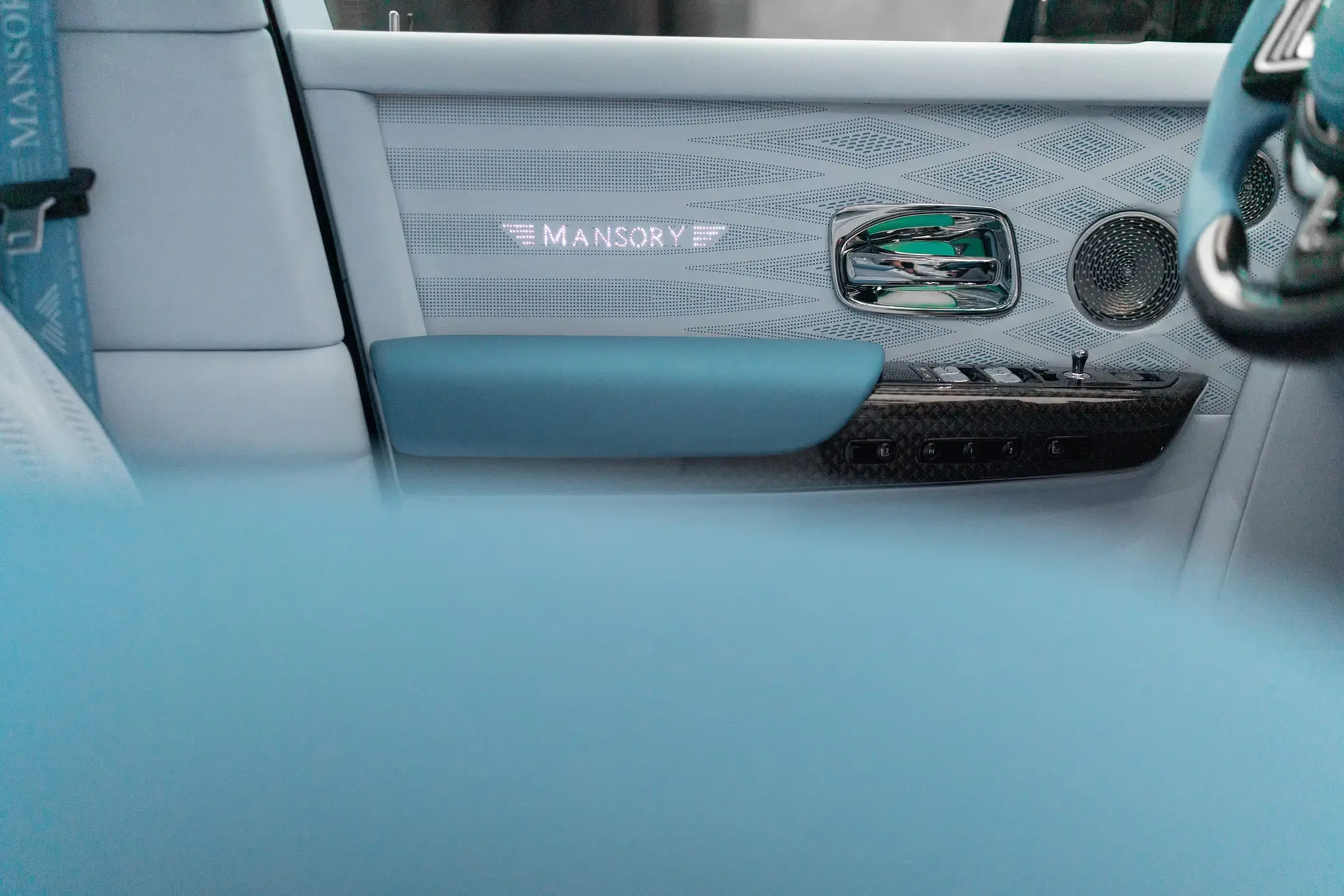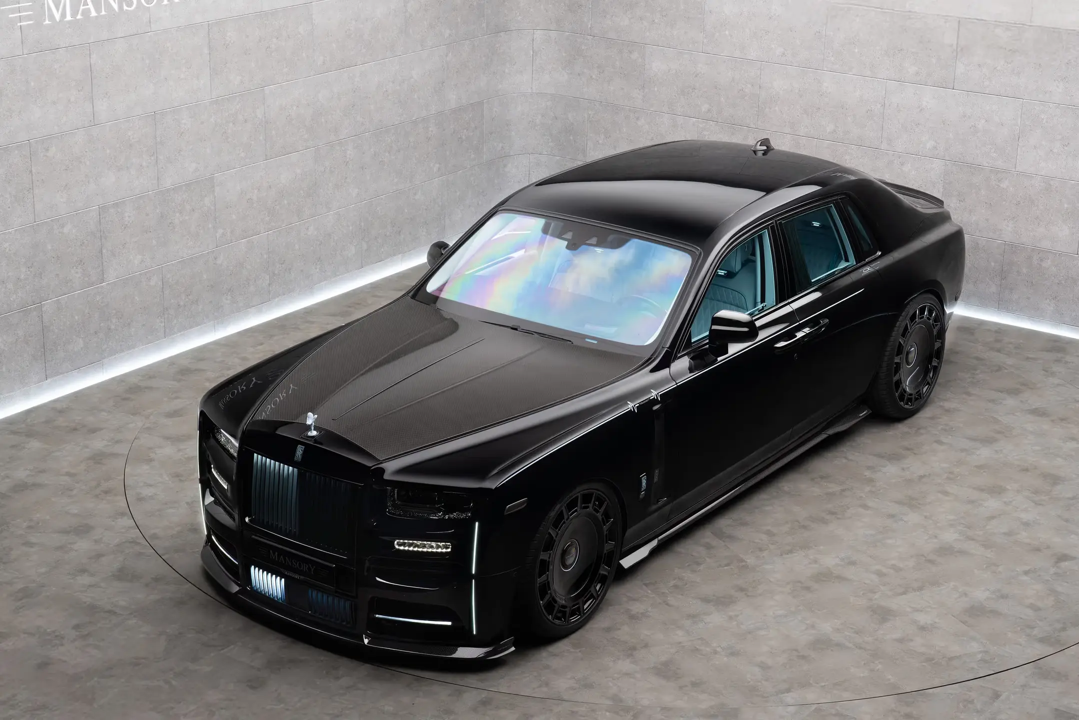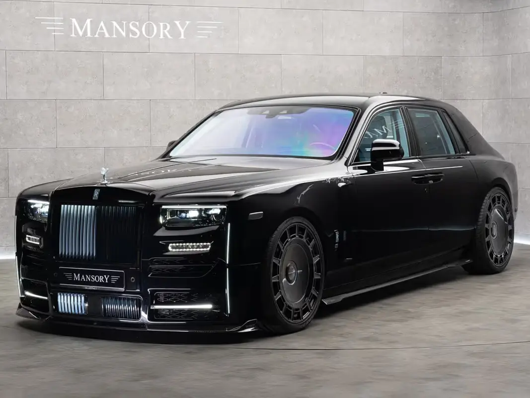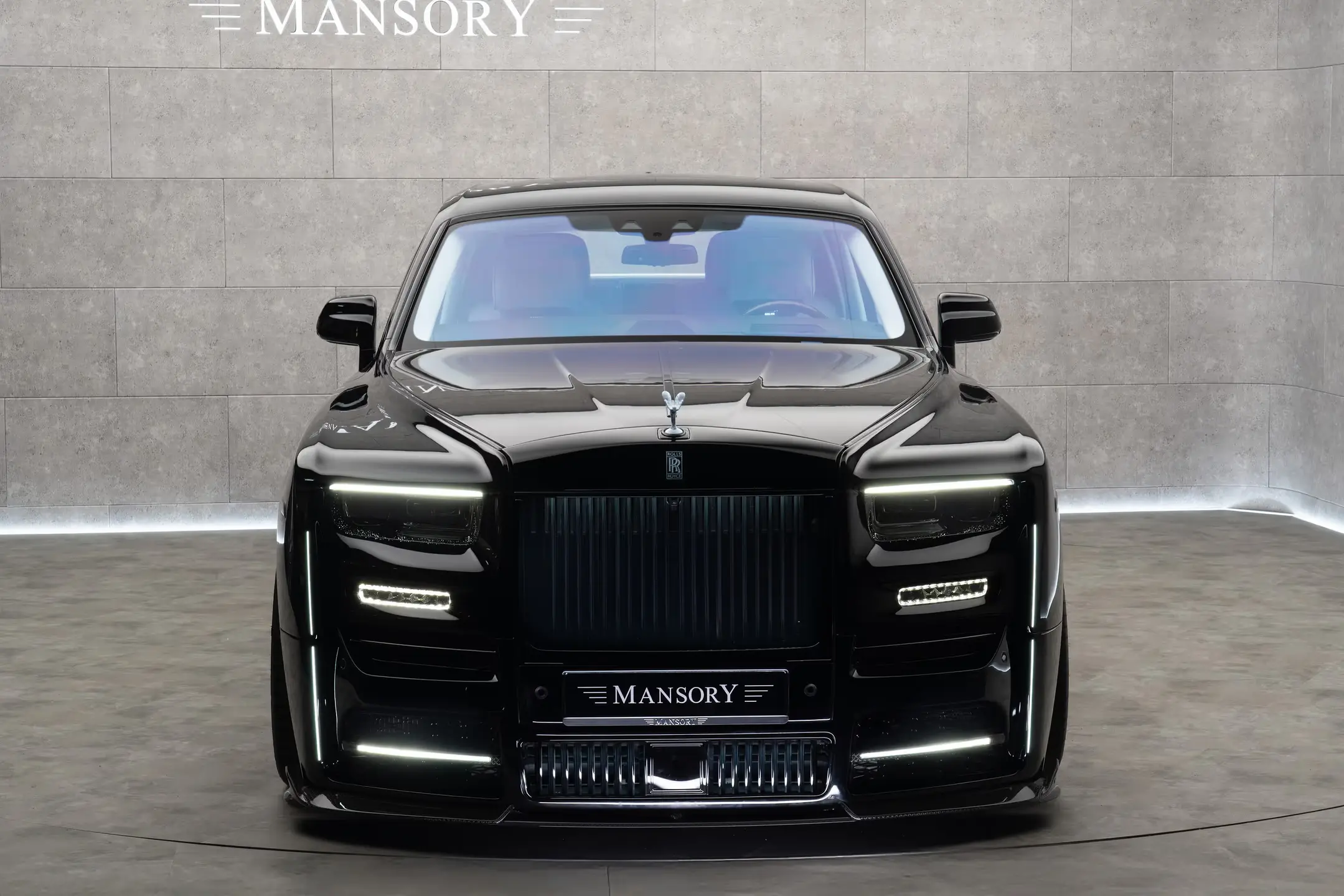 Rolls Royce Phantom VIII by Mansory Front bumper with sport front lip & front fender slim long DRL, rear bumper with diffuser visible carbon fiber, engine bonnet exposed, side skirt lips in visible carbon fiber, roof spoiler in visible carbon fiber, ambiente grille illuminated, ambiente grille at front bumper, rear decklid spoiler, engine cover carbon fiber, sport exhaust system, exhaust remote control, lowering suspension. Individual interior, sport steering wheel, entrance panels, sport pedals, door welcome lights. Trunk and floor mats. FD.15 24” fully forged wheels black painted.
