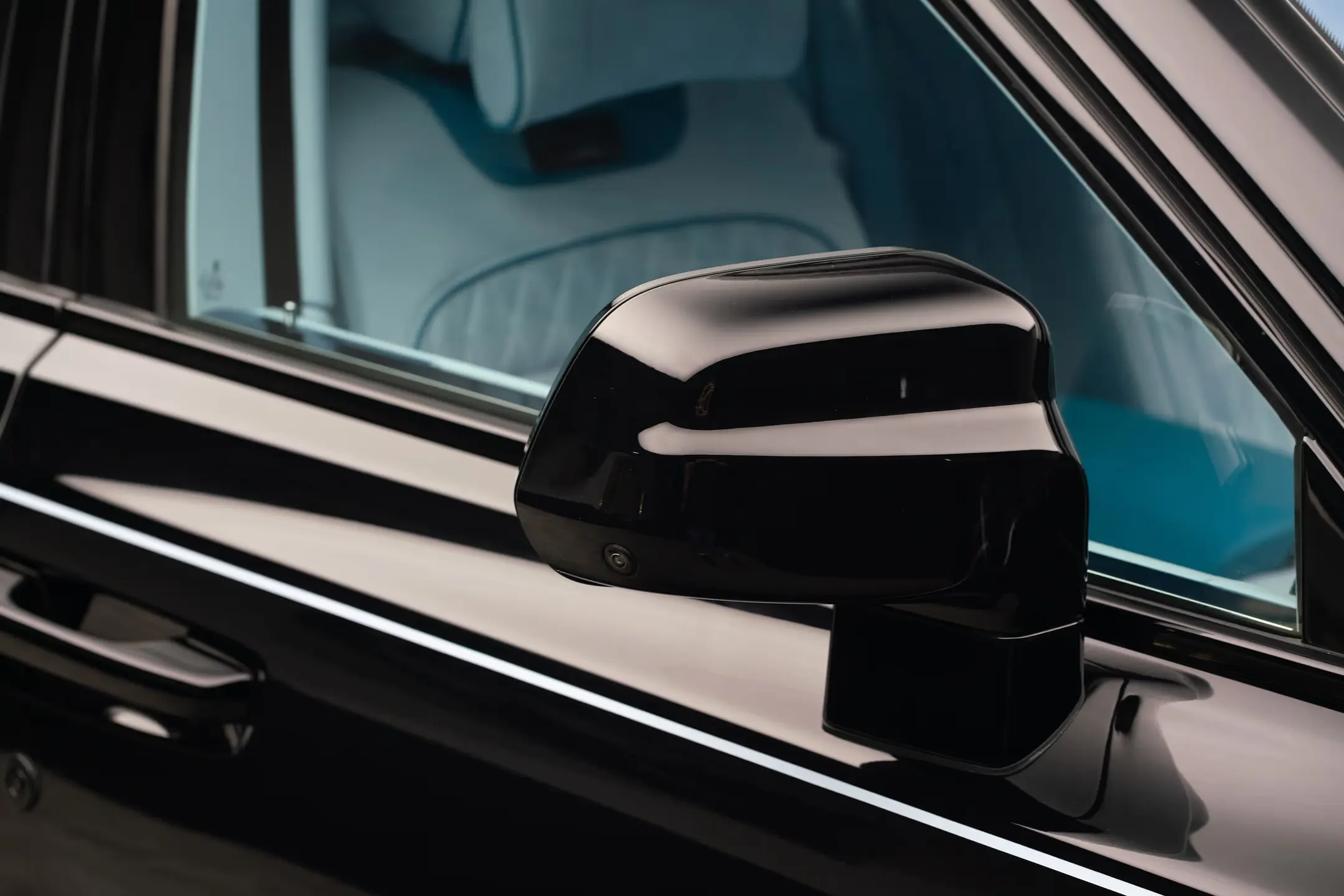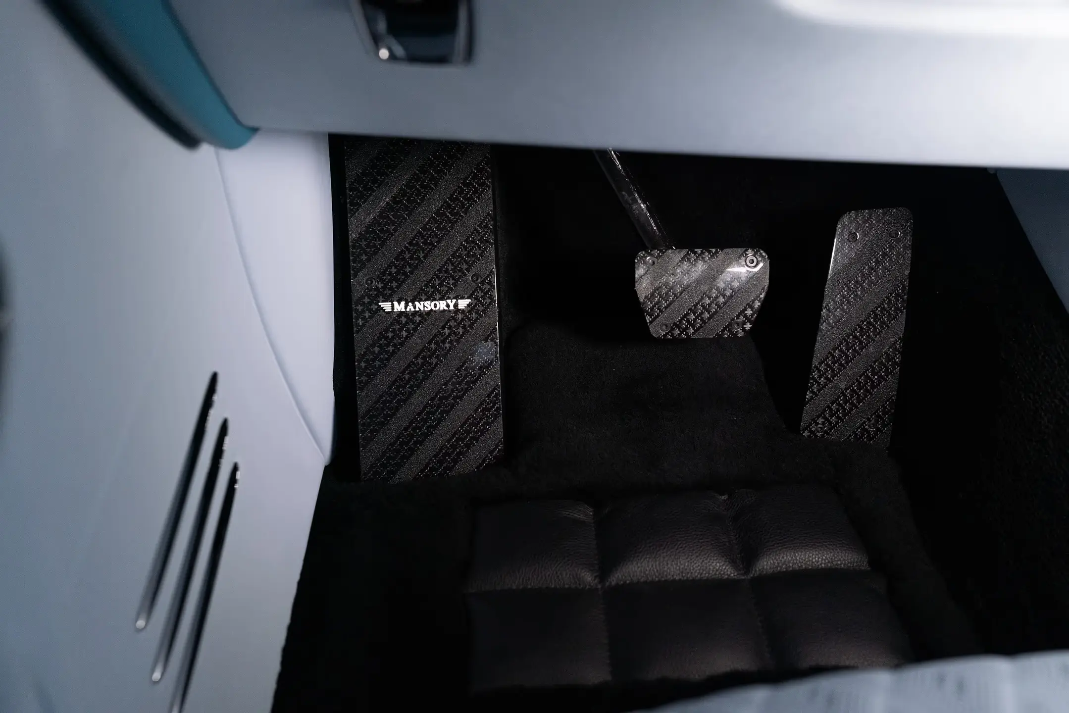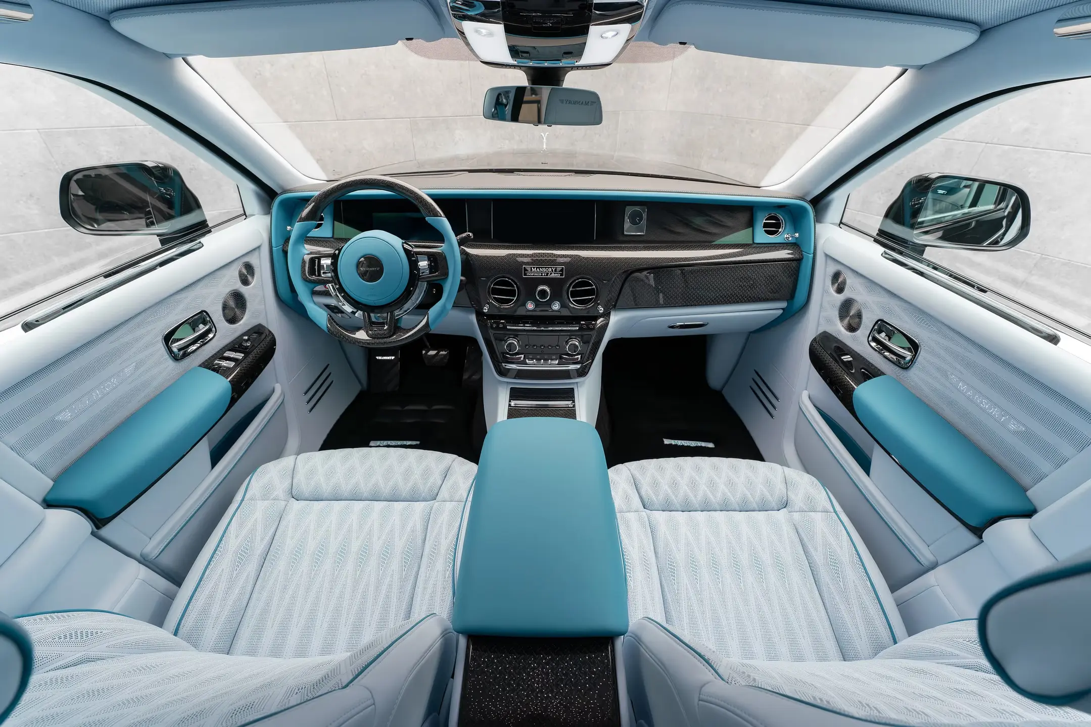 Rolls Royce Phantom VIII by Mansory Front bumper with sport front lip & front fender slim long DRL, rear bumper with diffuser visible carbon fiber, engine bonnet exposed, side skirt lips in visible carbon fiber, roof spoiler in visible carbon fiber, ambiente grille illuminated, ambiente grille at front bumper, rear decklid spoiler, engine cover carbon fiber, sport exhaust system, exhaust remote control, lowering suspension. Individual interior, sport steering wheel, entrance panels, sport pedals, door welcome lights. Trunk and floor mats. FD.15 24” fully forged wheels black painted.