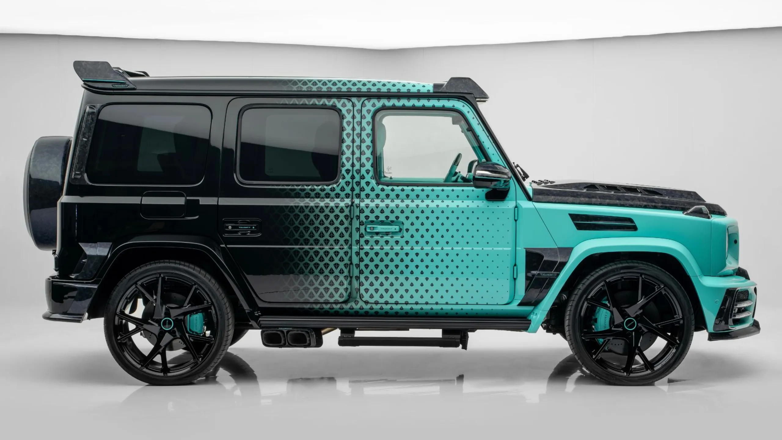 The body styling of the G-Class, painted entirely in a special paint finish called "Algorithmic Fade", is impressive both visually and technically. Starting at the front in the colour "turquoise", the colour transition to the colour black is created by black-painted symbols according to the customer's specifications ("Bespoke"), which become increasingly dense in spacing, size and number. All aerodynamic add-on parts, starting with the front apron, the elegantly widened front wings, the widening of the door undersides and the rear apron have also been redrawn according to the customer's wishes ("Bespoke"). All these components are of course made of full carbon in "Forged Carbon" finish and all other bodywork applications have also been executed in "Forged Carbon". The ultra-light full carbon bonnet in partial unpainted and partial painted from "turquoise" to "black" and impressively characterises the front section. At the rear, the spare wheel is completely covered in "Forged Carbon" and provides together with the newly designed rear apron and a new ("Bespoke") roof edge spoiler a harmonious finish all in black. Numerous other components made of "Forged Carbon", such as indicator bases, mirror housings, air intakes and outlets, together with other striking highlights such as the door handle inlays with "MANSORY" lettering and the special "Algorithmic Fade" paint finish already described, form an extremely stylish combination.